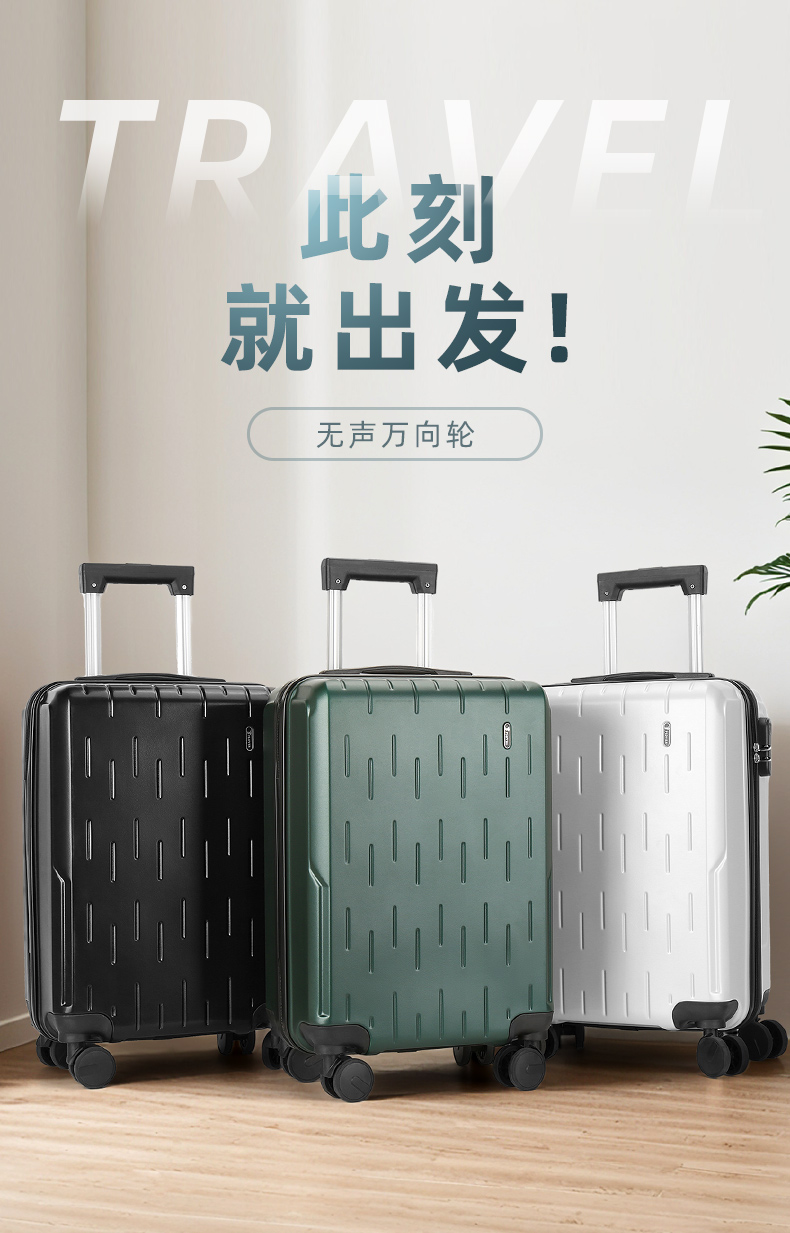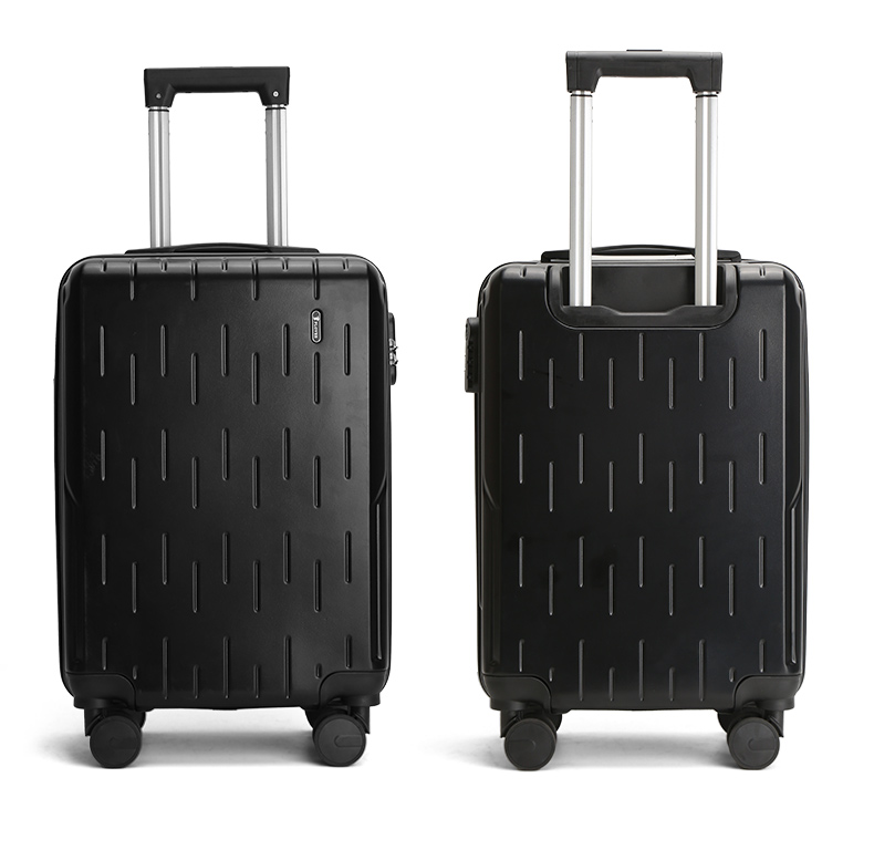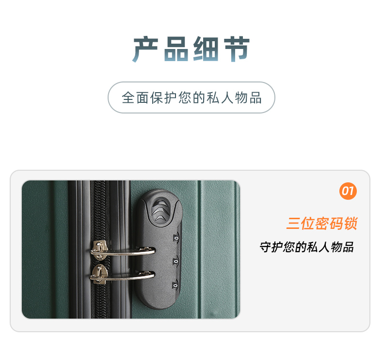 产品规格:41*25*64CM 重量:3.6kg 纸箱:瓦楞纸箱 黑色 1.ABS材质 2.铝合金logo五金 3.三位数密码锁 4.万向轮