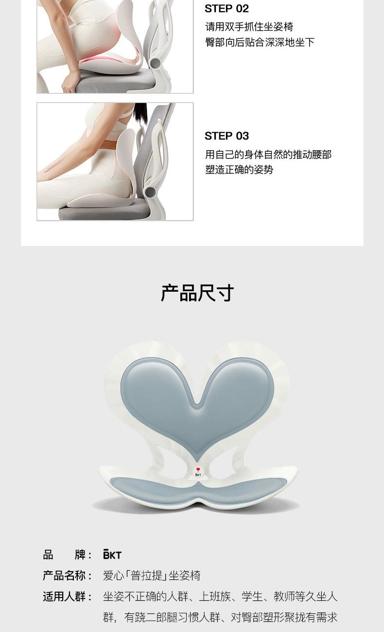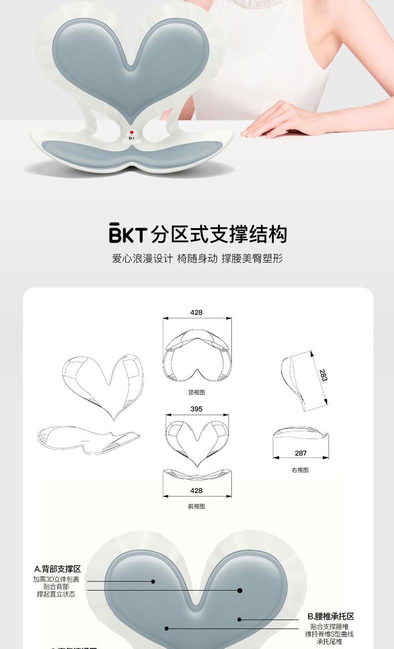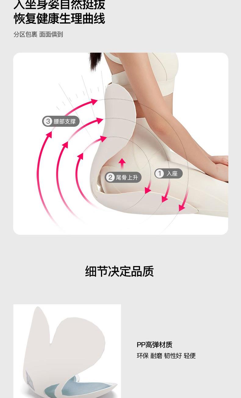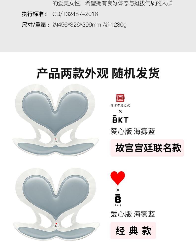 产品型号:爱心版 海雾蓝 产品颜色:海雾蓝 产品尺寸:456*326*399mm 产品重量:约1230g 产品材质:PP合成树脂/布(聚醋纤维) 适合体重:体重220斤以下 适宜人群:坐姿不正确人群,上班族、学生、教师等久坐人群,有跷二郎腿习惯人群,对臀部塑形聚拢有需求的爱美女性,希望拥有良好体态与挺拔气质的人群。