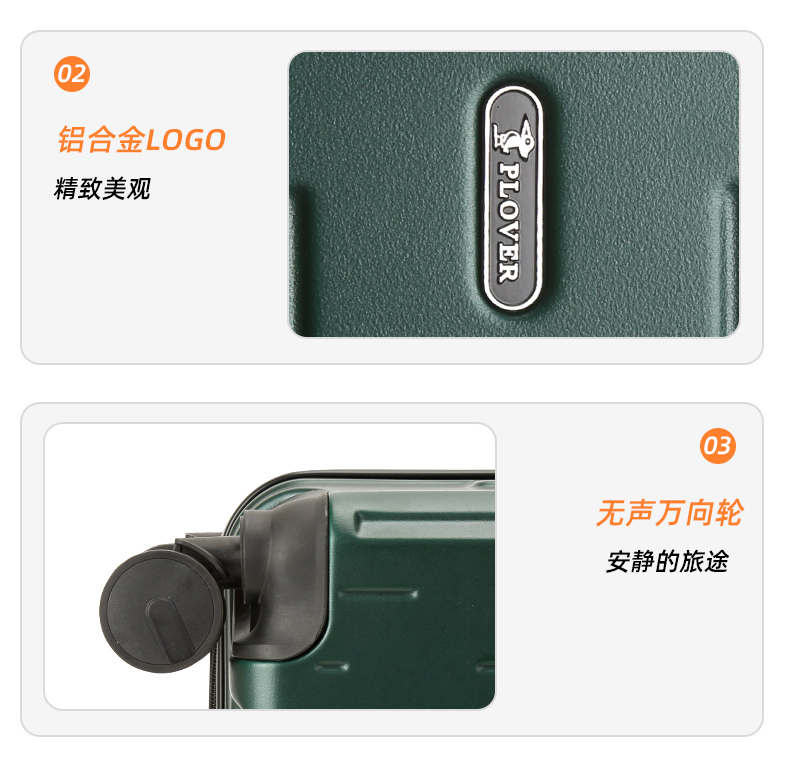 PLOVER香港啄木鸟20英寸拉链款拉杆箱 GD2717-20 产品规格:55*23*35.5CM 重量:2.95KG 纸箱:瓦楞纸箱 颜色:黑色 1.ABS材质 2.铝合金logo五金 3.三位数密码锁 4.万向轮