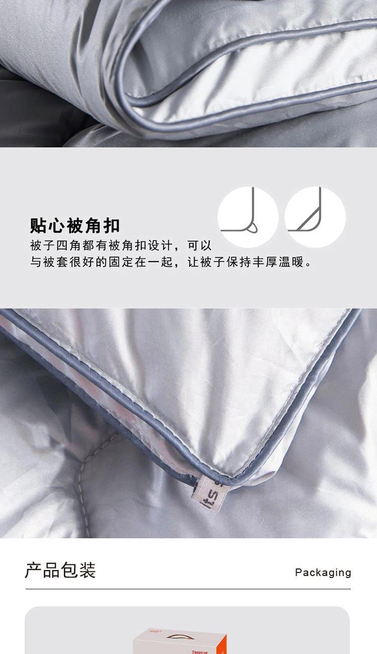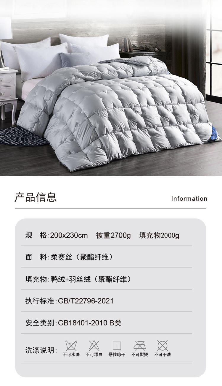 200×230cm 填充物:2000g 被重:2700g 【面 料】柔赛丝(聚酯纤维) 【填充物】鸭绒+羽丝绒(聚酯纤维) 1.精选柔赛丝面料,轻薄细密,防止钻绒; 2.面包式充绒工艺,每一个小方块都蓬松,轻盈保暖不压身; 3.立体式包边,让边边角角都丰盈立体;