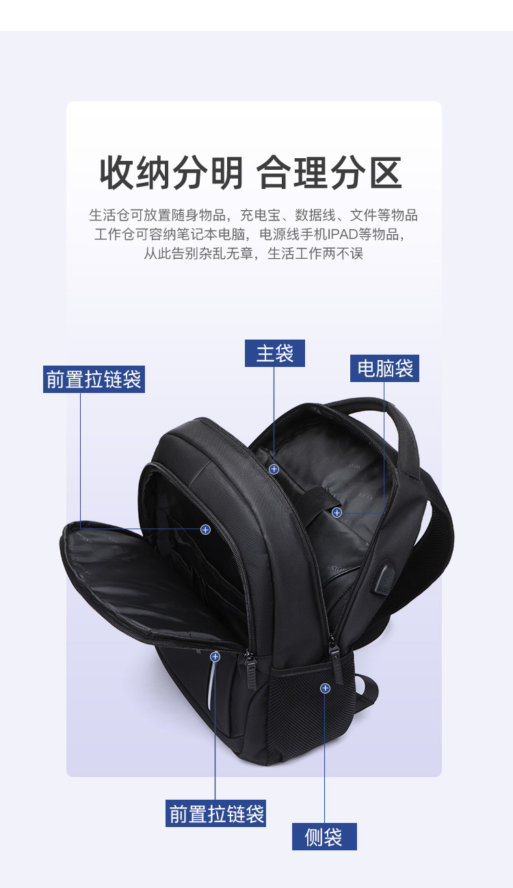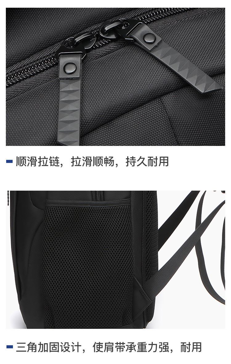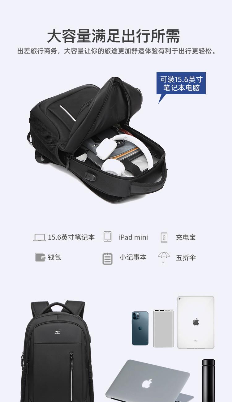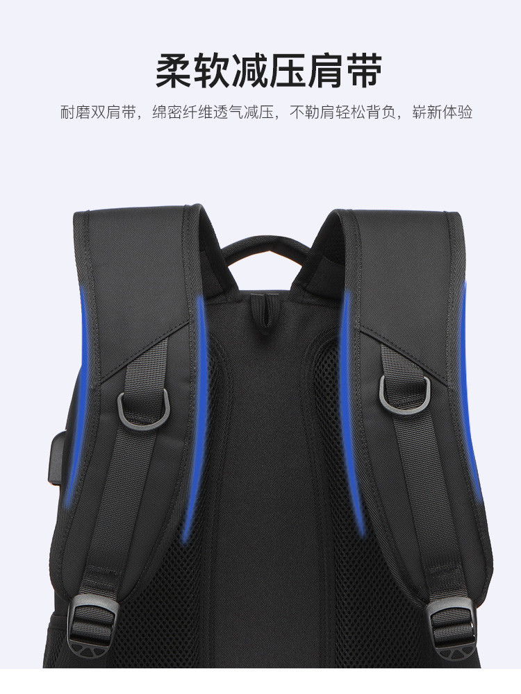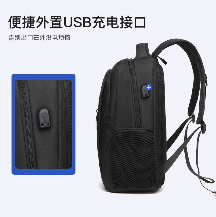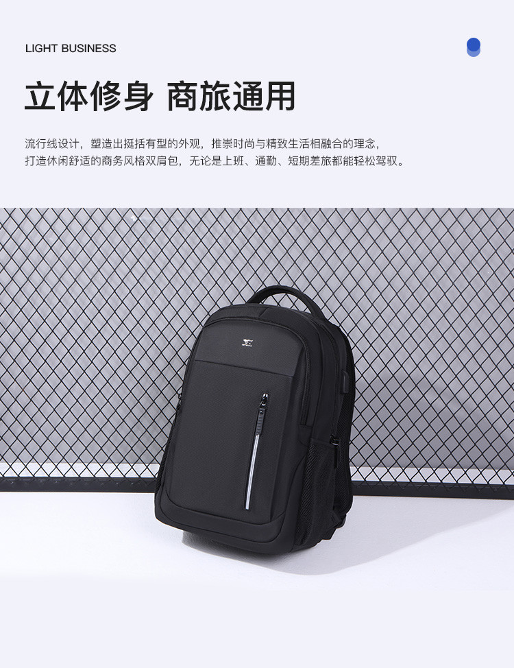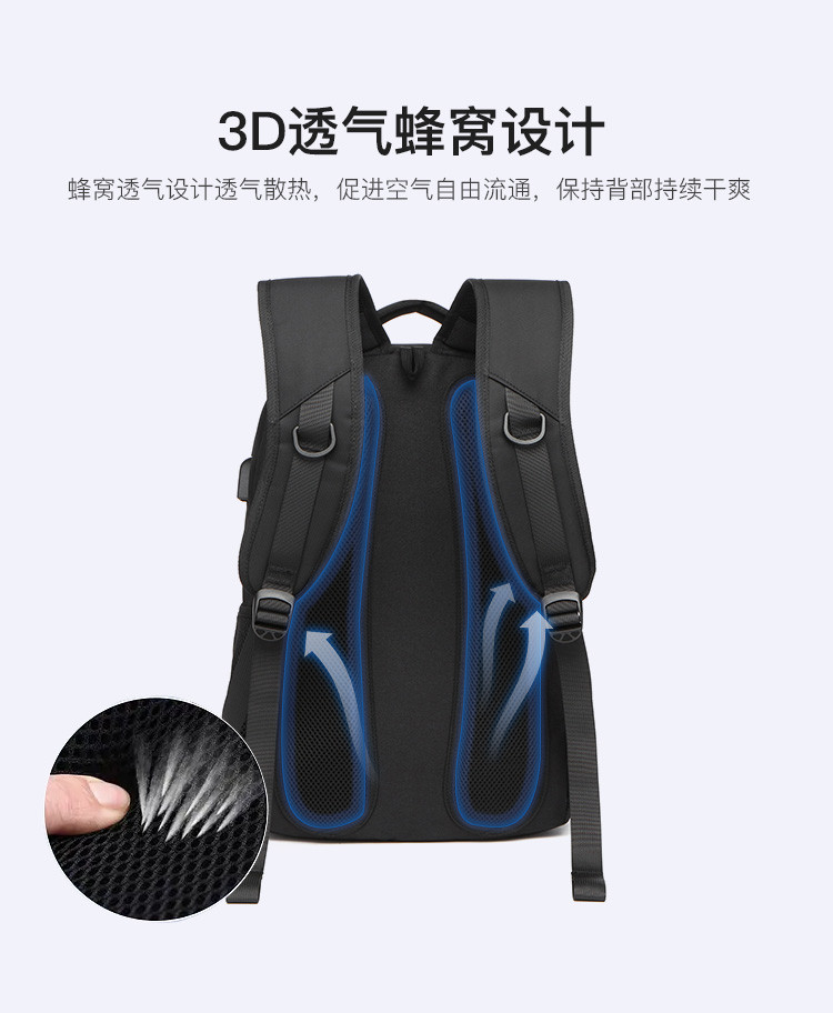 类别:背包 外部材质:织物 闭合方式:拉链 规格:300x150x450mm 容纳电脑尺寸:15.6英寸 风格:通勤风 商务风 携包出行,旅途无忧,立体挺括包型兼顾时尚外观与功能性,轻松驾驭多种都市出行场景 内里大容装载,多层收纳空间,满足多样收纳需求,轻装出行,采用高密度织物面料,防刮耐用,防泼贱,轻松应对泼水,便携外置USB充电接口,3D透气蜂窝设计,柔软减压肩带