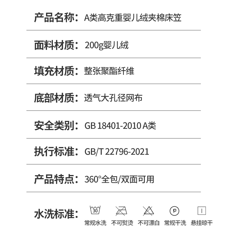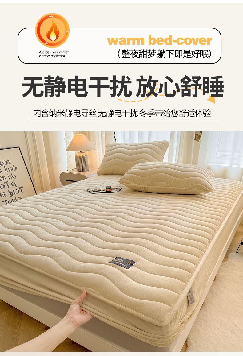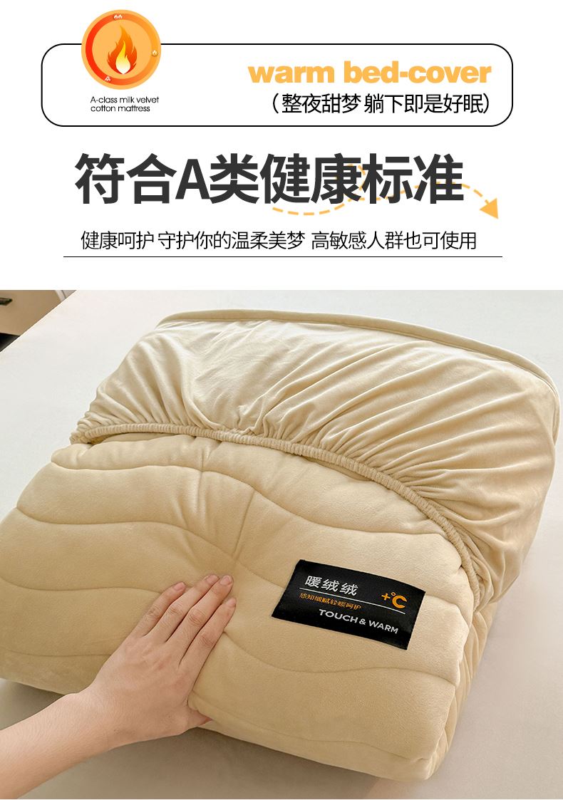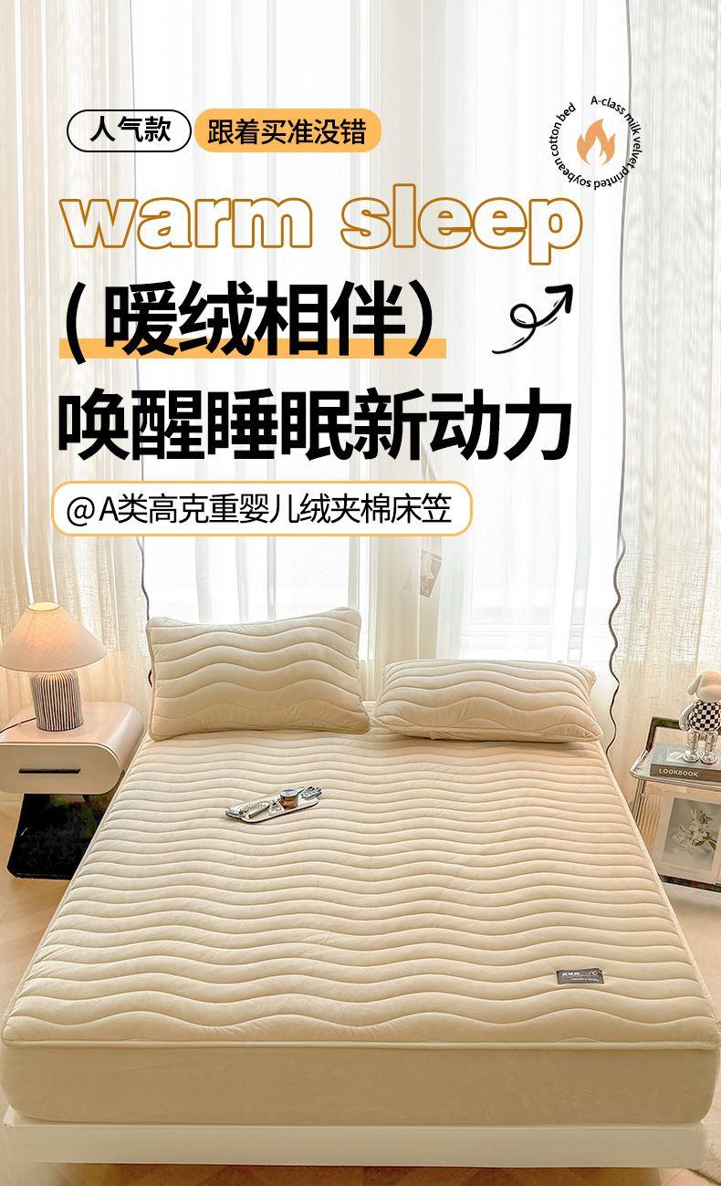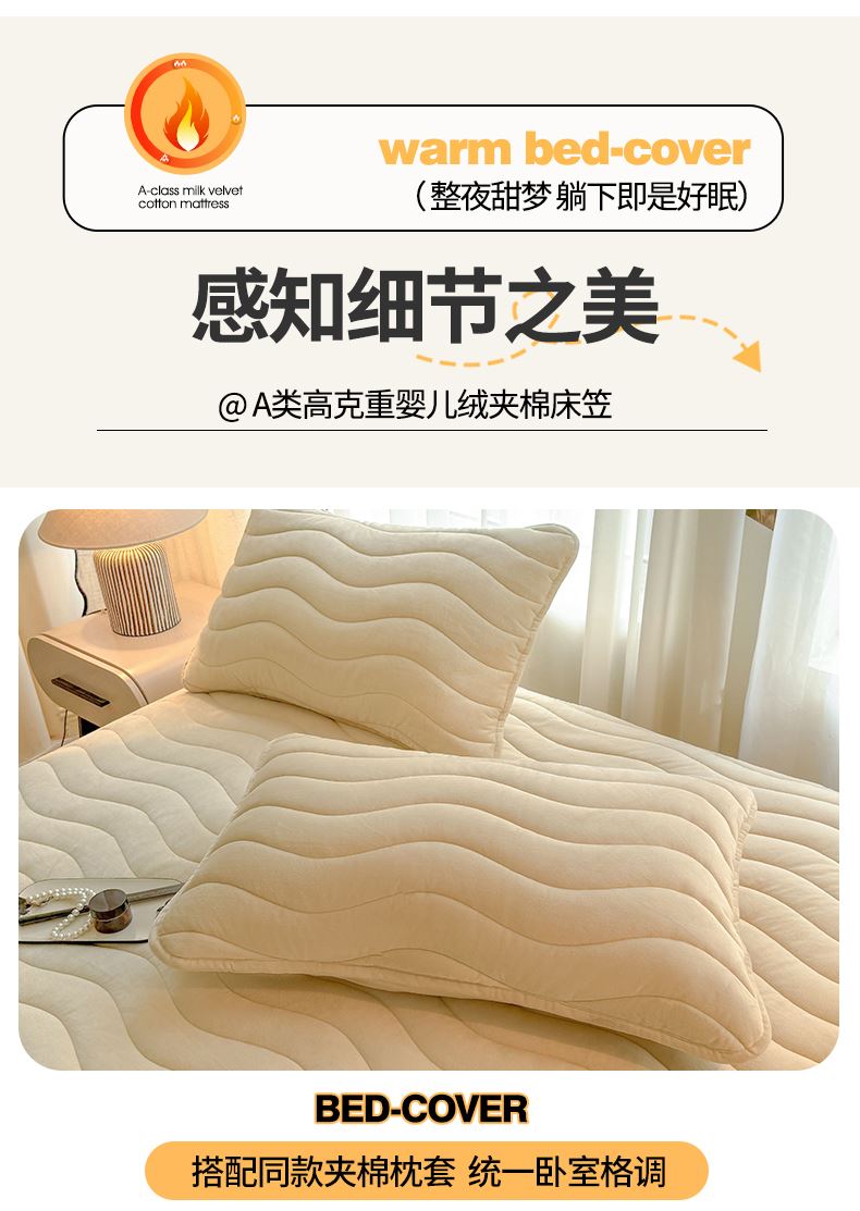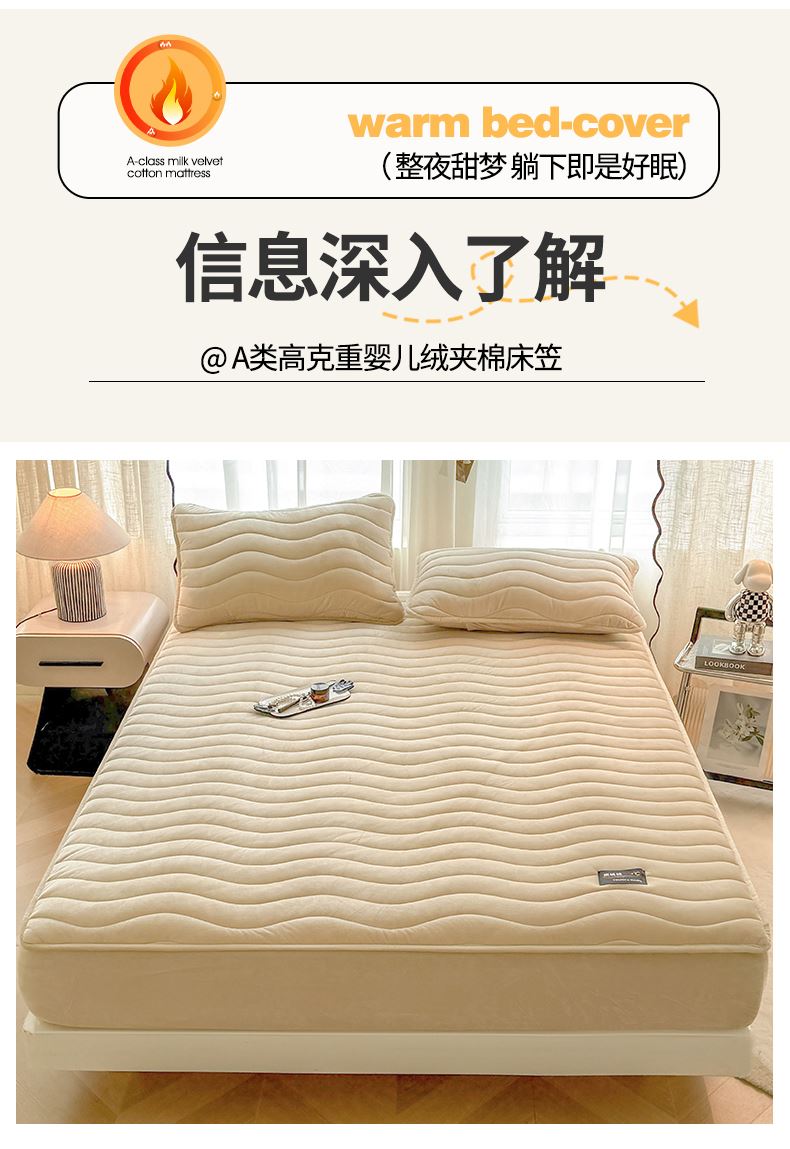 面料:短毛绒(聚酯纤维) 填充:聚酯纤维 规格:180cm*200cm 枕套:48cm×74cm 暖绒相伴,唤醒睡眠新动力,A类高克重保暖夹棉床笠,绒面软糯厚实 亲肤呵护 科技植绒蓬松不透底,长久保暖。360°整圈全包裹,采用全包裹设计,包容任意睡姿不滑动,不惧翻滚、防尘防渭。