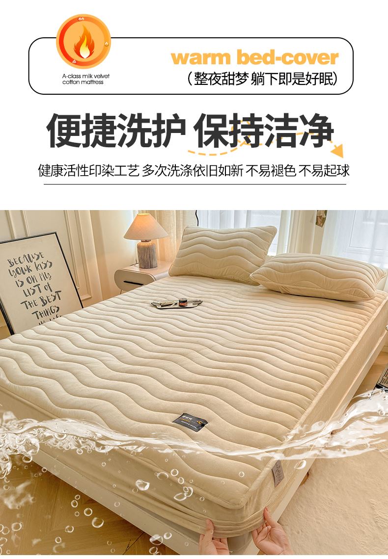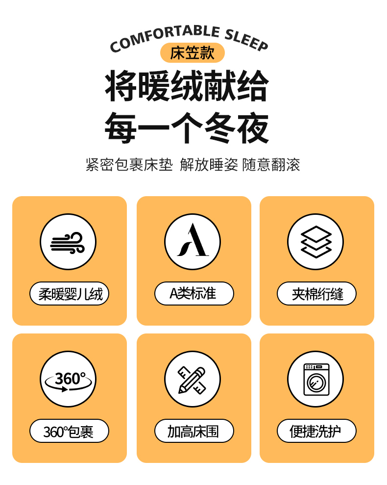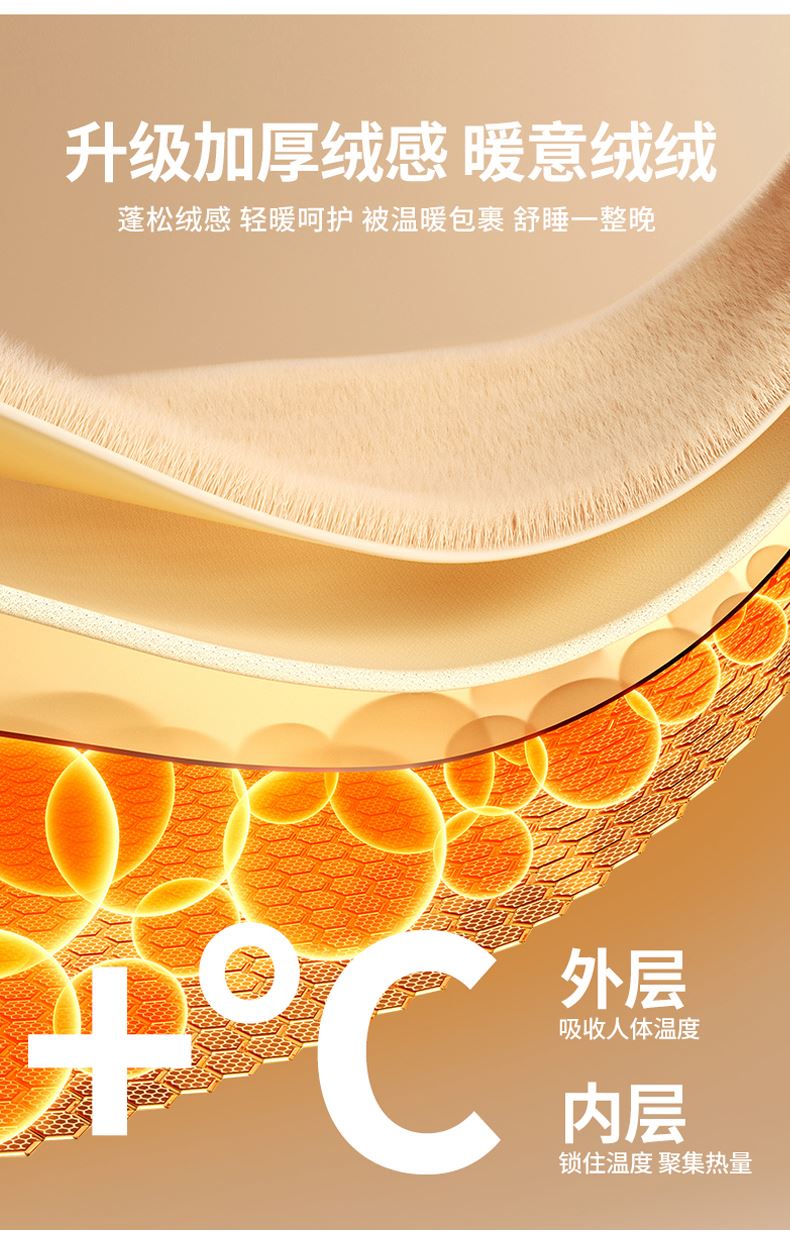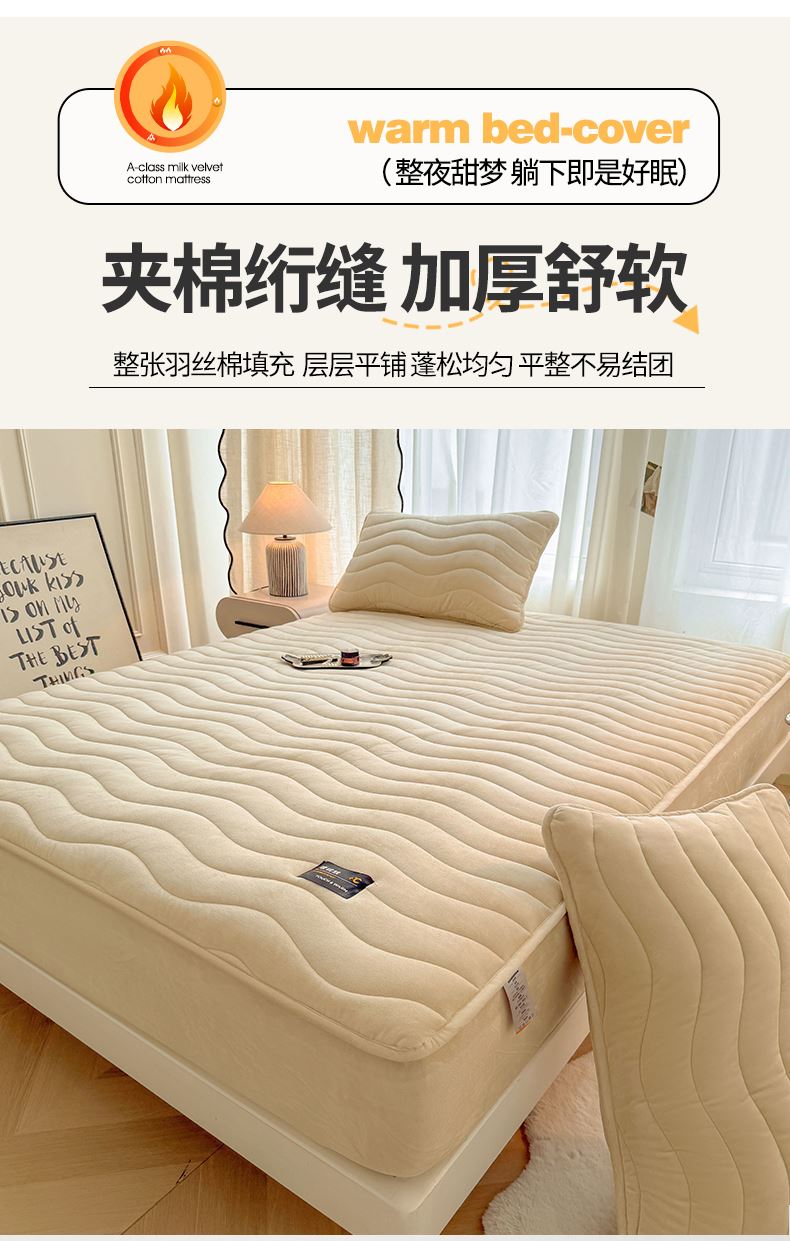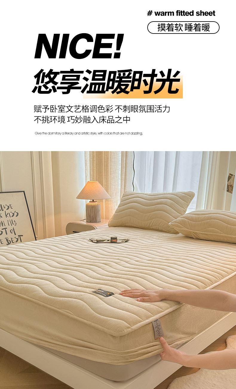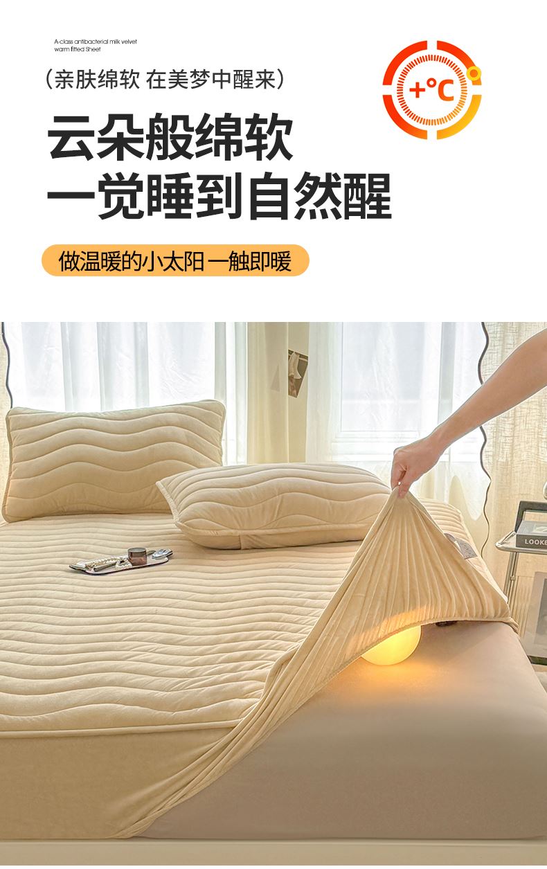 面料:短毛绒(聚酯纤维) 填充:聚酯纤维 规格:180cm*200cm 枕套:48cm×74cm 暖绒相伴,唤醒睡眠新动力,A类高克重保暖夹棉床笠,绒面软糯厚实 亲肤呵护 科技植绒蓬松不透底,长久保暖。360°整圈全包裹,采用全包裹设计,包容任意睡姿不滑动,不惧翻滚、防尘防渭。