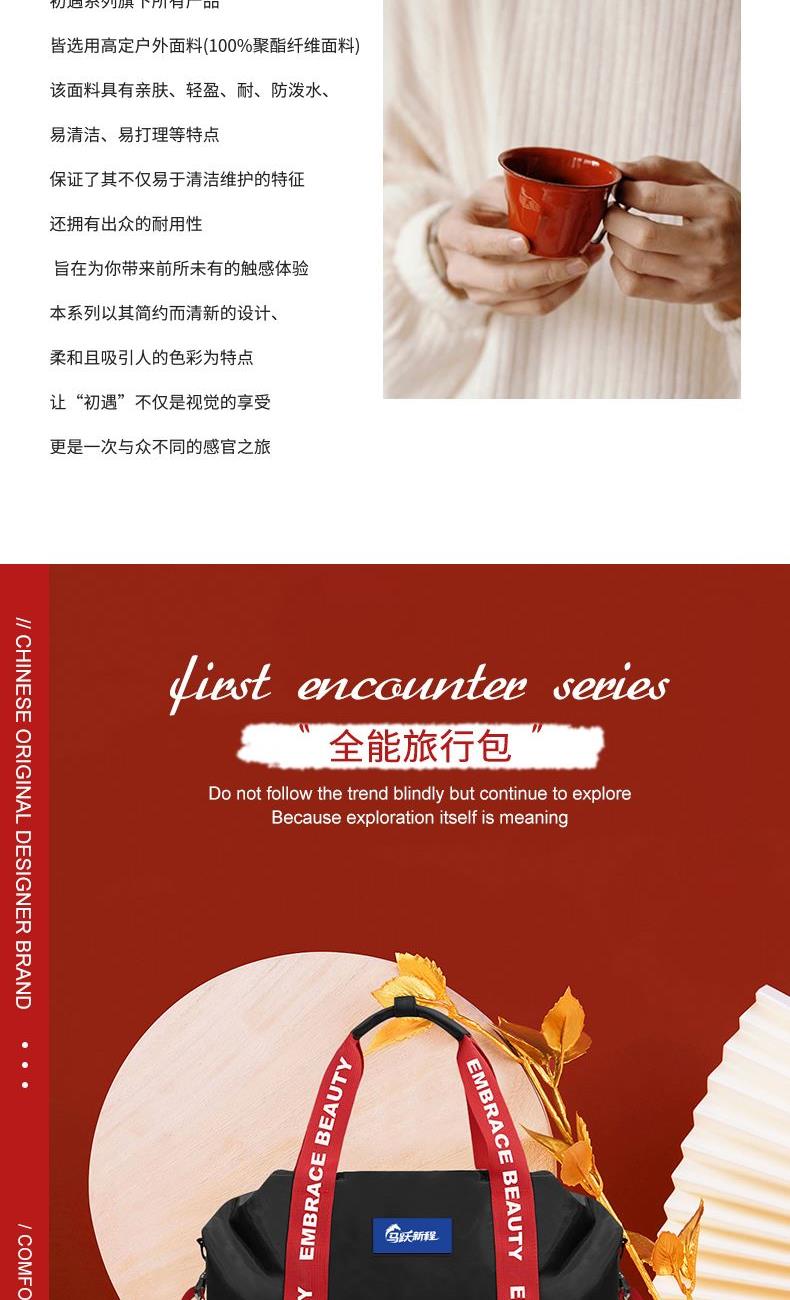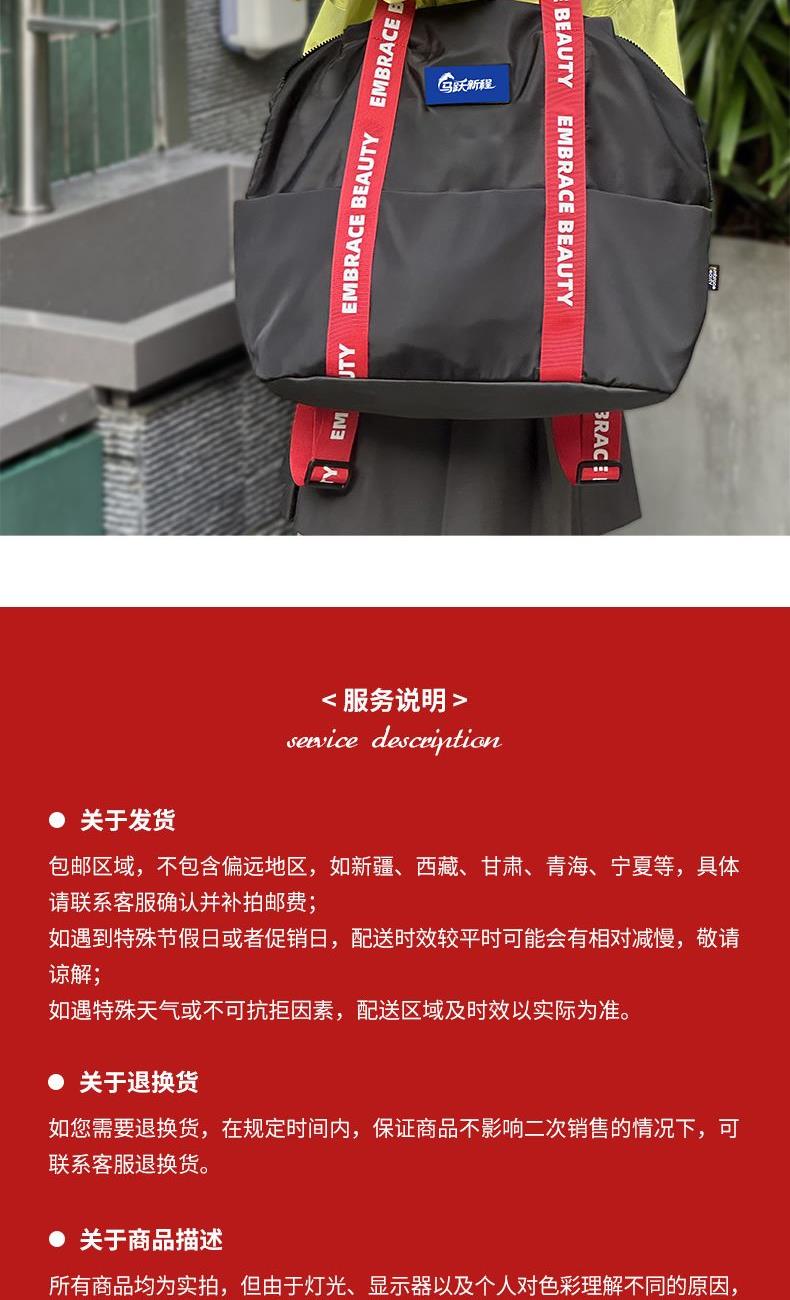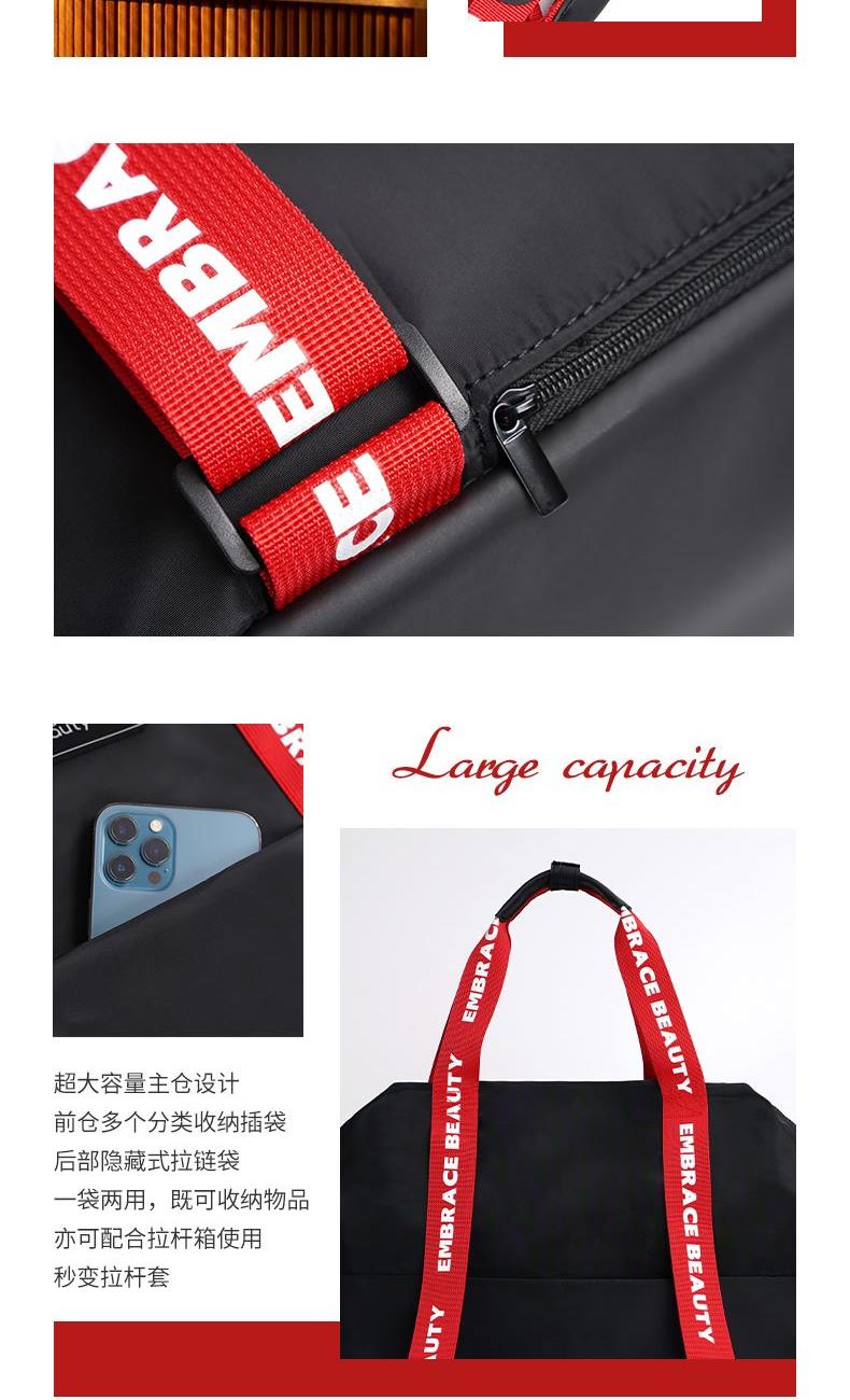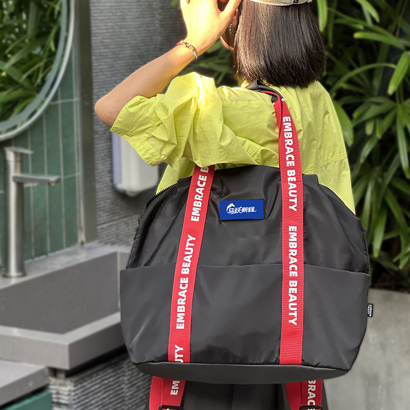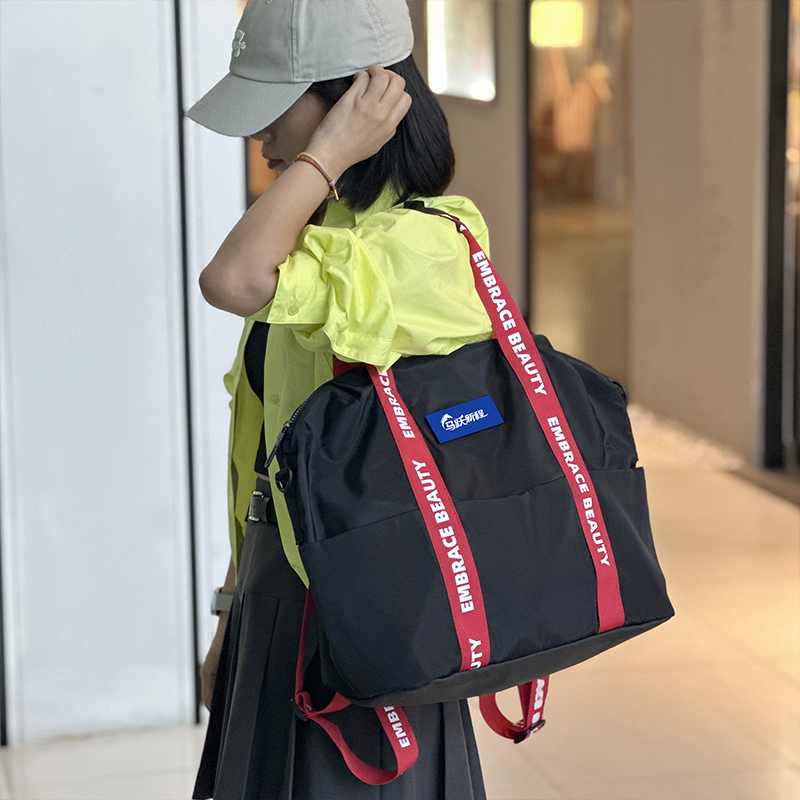 一包随心,收纳万千,解锁出行自由 精选优质仿记忆聚酯纤维料,防泼水、耐磨、易清洁、质感亲肤舒适; 超大容量主仓设计,前仓多个分类收纳插袋,提高了放物品的便利度,后部隐藏式拉链袋一袋两用;既可收纳物品,亦可配合拉杆箱使用(秒变拉杆套); 配有可拆卸肩带,手提、单肩、双肩、斜挎四种不同用法,可满足多场景需求。 魔术贴LOGO方式, 香卡行李牌(选配):由一片高密度纯棉香卡、一套亚克力行李标牌组合而成,可挂于箱包或衣柜与车内等各种场合。使用时将香卡塑封打开,即可散发香味,香味将由浓到淡渐渐散发,持续散香约30天。香味散尽后可將香氛精油或香水滴于卡片上多次使用。