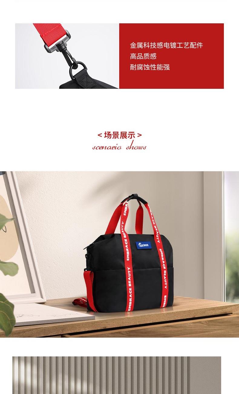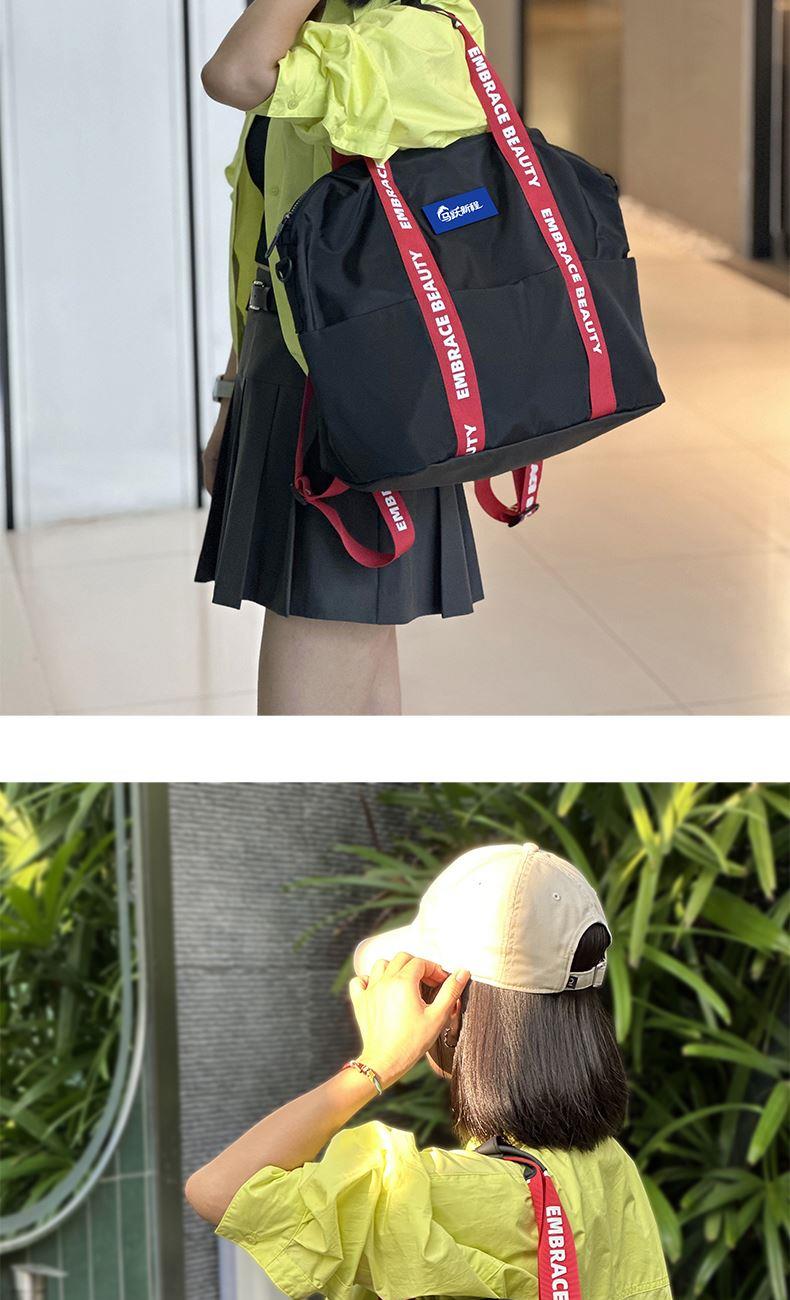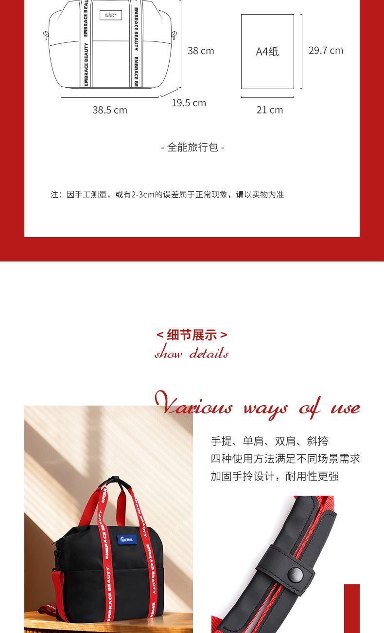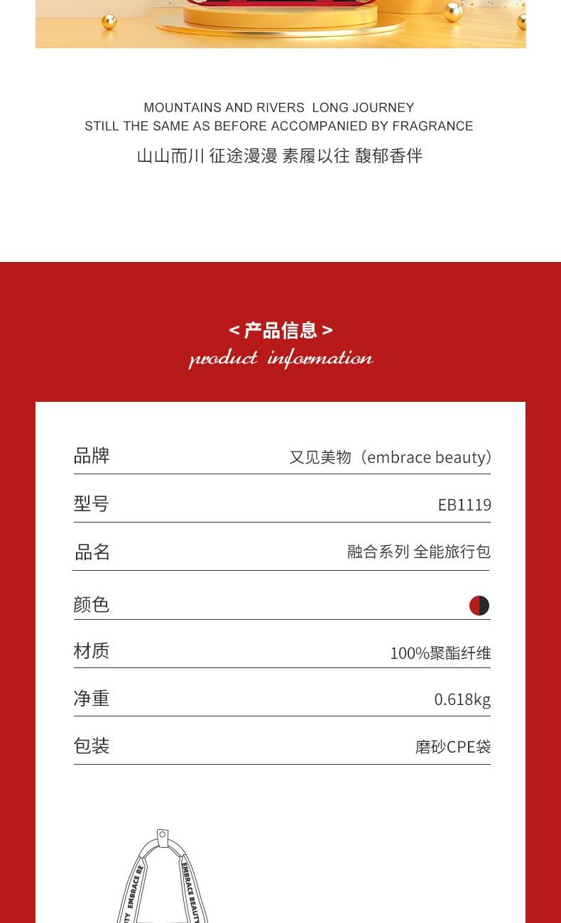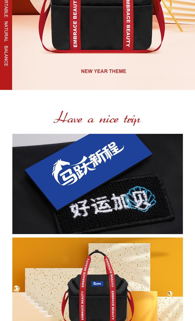 一包随心,收纳万千,解锁出行自由 精选优质仿记忆聚酯纤维料,防泼水、耐磨、易清洁、质感亲肤舒适; 超大容量主仓设计,前仓多个分类收纳插袋,提高了放物品的便利度,后部隐藏式拉链袋一袋两用;既可收纳物品,亦可配合拉杆箱使用(秒变拉杆套); 配有可拆卸肩带,手提、单肩、双肩、斜挎四种不同用法,可满足多场景需求。 魔术贴LOGO方式, 香卡行李牌(选配):由一片高密度纯棉香卡、一套亚克力行李标牌组合而成,可挂于箱包或衣柜与车内等各种场合。使用时将香卡塑封打开,即可散发香味,香味将由浓到淡渐渐散发,持续散香约30天。香味散尽后可將香氛精油或香水滴于卡片上多次使用。