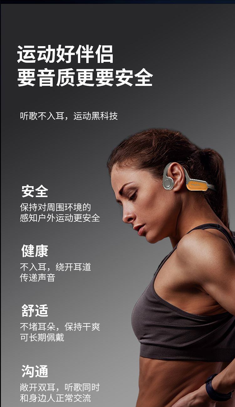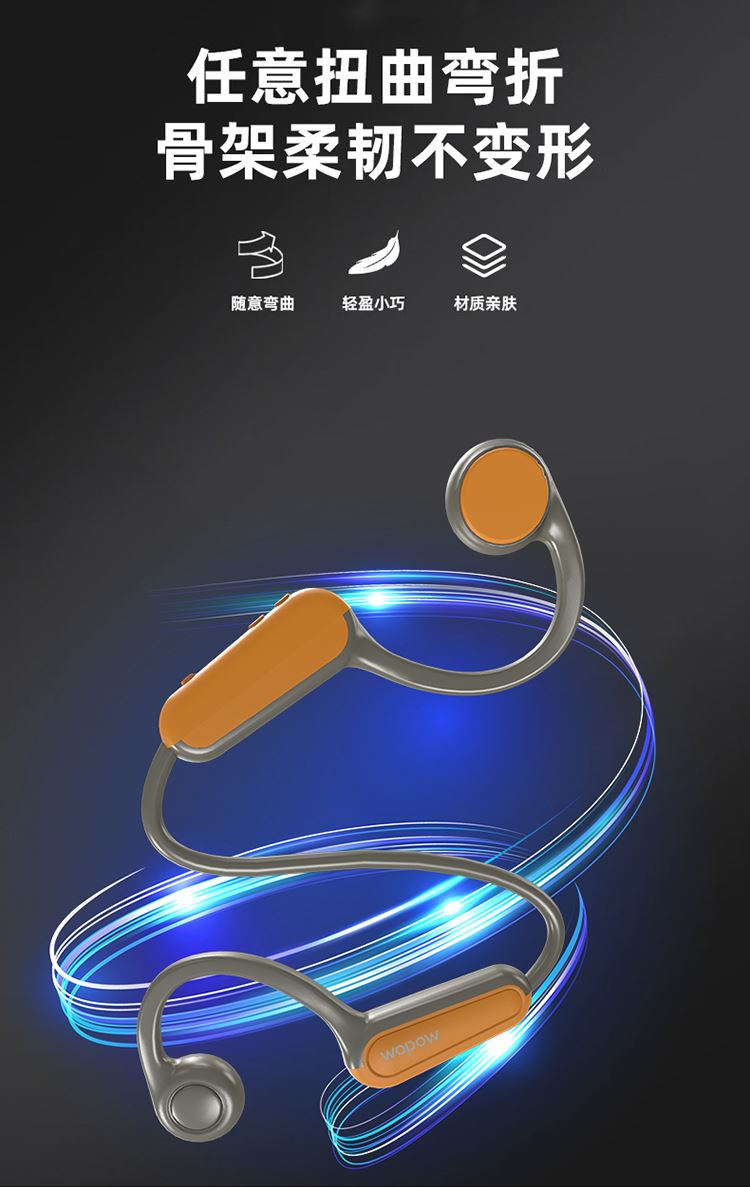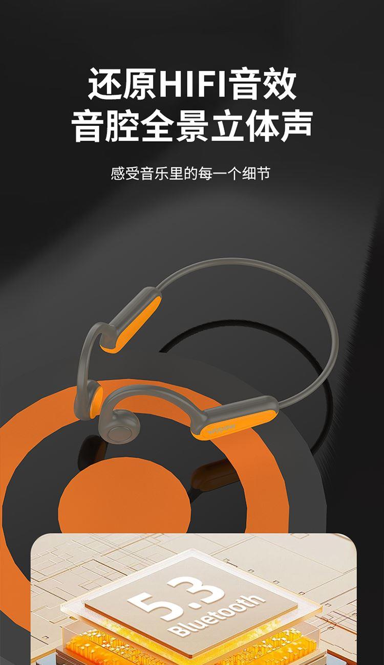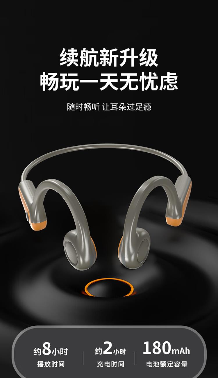 耳机电池容量:180mAh 耳机尺寸:135*131*43mm 包装尺寸:106*51*140mm 产品重量:25g 蓝牙版本:5.3 传输距离:10米 输入:5V 1A 充电时间:约2小时 续航时长:约8小时 待机时间:7天 颜色:灰橙色 材质:镍钛合金钢丝+ 硅胶+ABS 360度全景音效,骨传导环绕立体声,大容量超长续航,指向性传音技术高清通话不漏音,日常防尘防汗,放肆运动,舒适不入耳,高速更防尘 开放聆听,户外运动更安全,高颜造型,活力出圈 释放双耳,轻盈狂甩不掉,蓝牙5.3低功耗,低延迟,高传输, 支持连接蓝牙设备并支持双声道立体声高保真音乐播放 支持蓝牙连接高清通话 支持iOS系统耳机电量指示及电池低电报警功能 记忆颈挂,随意弯曲