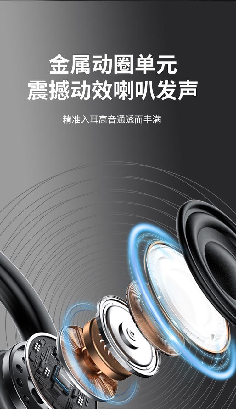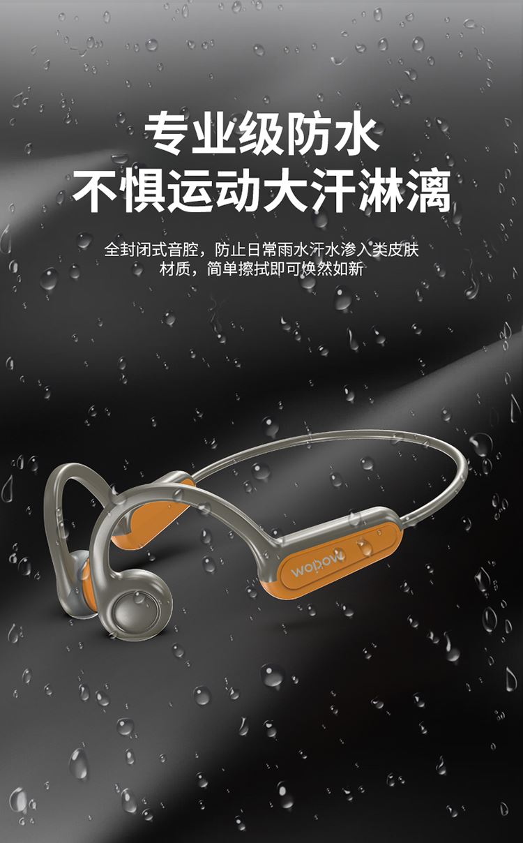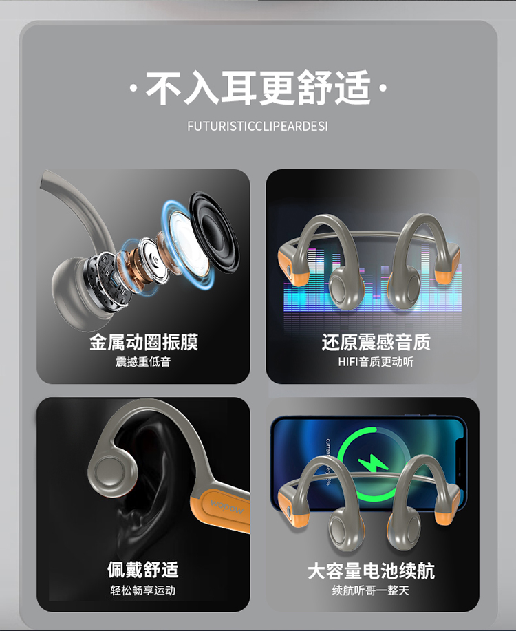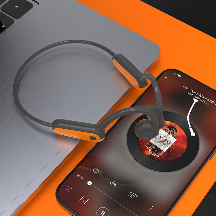 耳机电池容量:180mAh 耳机尺寸:135*131*43mm 包装尺寸:106*51*140mm 产品重量:25g 蓝牙版本:5.3 传输距离:10米 输入:5V 1A 充电时间:约2小时 续航时长:约8小时 待机时间:7天 颜色:灰橙色 材质:镍钛合金钢丝+ 硅胶+ABS 360度全景音效,骨传导环绕立体声,大容量超长续航,指向性传音技术高清通话不漏音,日常防尘防汗,放肆运动,舒适不入耳,高速更防尘 开放聆听,户外运动更安全,高颜造型,活力出圈 释放双耳,轻盈狂甩不掉,蓝牙5.3低功耗,低延迟,高传输, 支持连接蓝牙设备并支持双声道立体声高保真音乐播放 支持蓝牙连接高清通话 支持iOS系统耳机电量指示及电池低电报警功能 记忆颈挂,随意弯曲