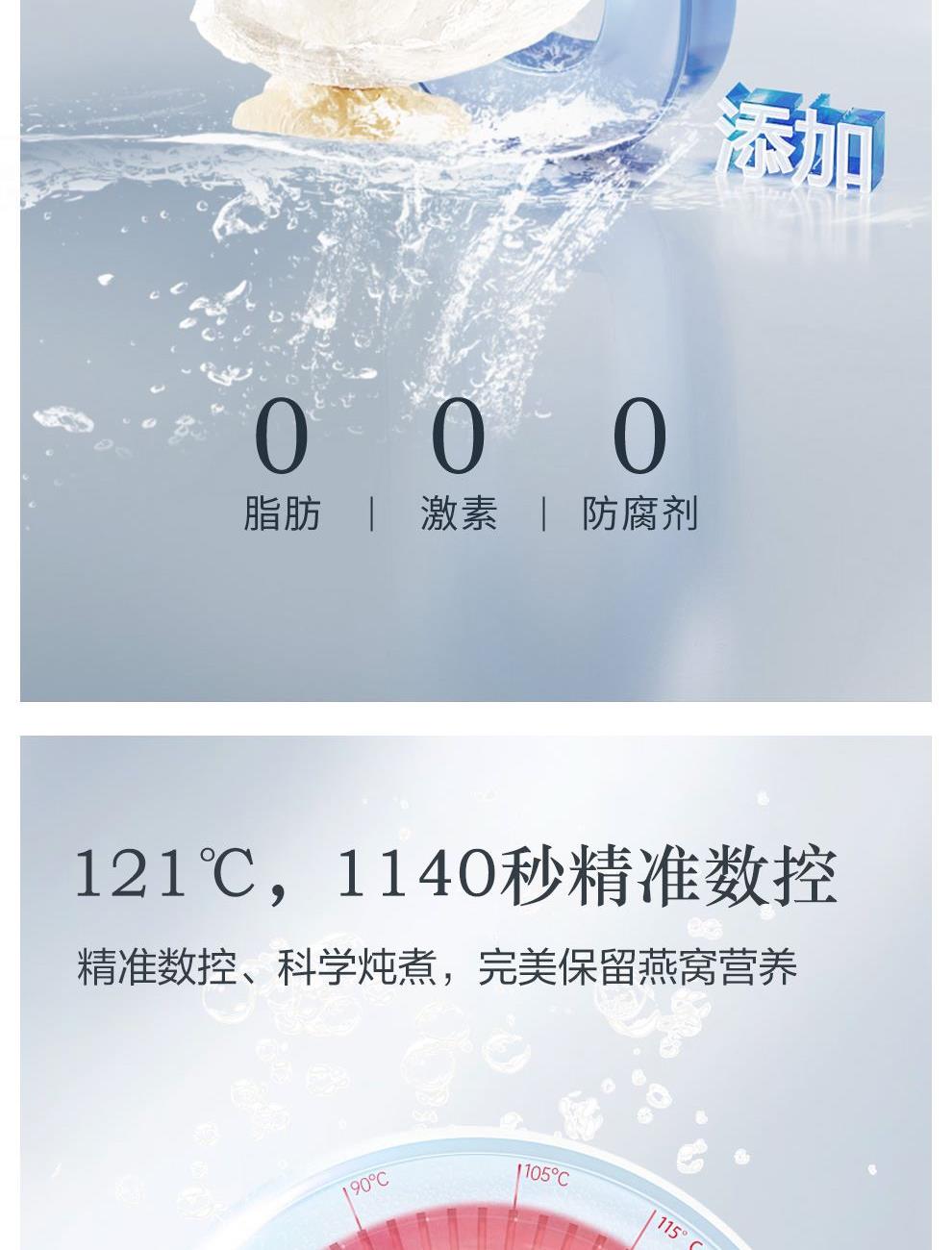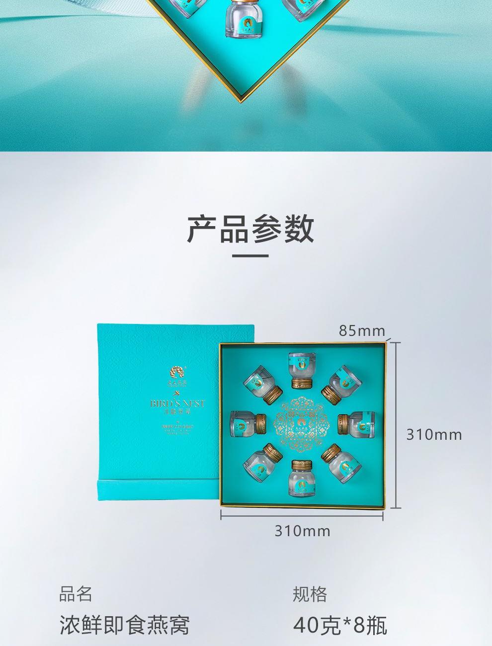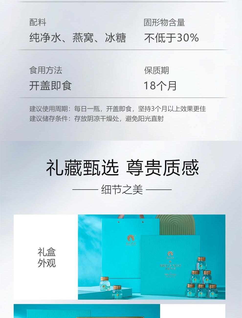 规格:320克(40克*8瓶)、燕窝固形物不低于30% 卖点: 燕窝原料精选马来西亚、印尼森林雨季燕盏,洁净度更高,泡发率更好。121℃,1140秒数控,科学炖煮,保留燕窝营养,口感细腻爽滑。坚持 0添加 0色素 0防腐剂,孕妈和宝宝也可以放心享用。一瓶一码可溯源,开盖即食,开启滋补。