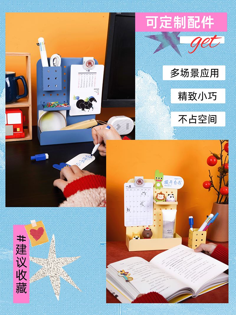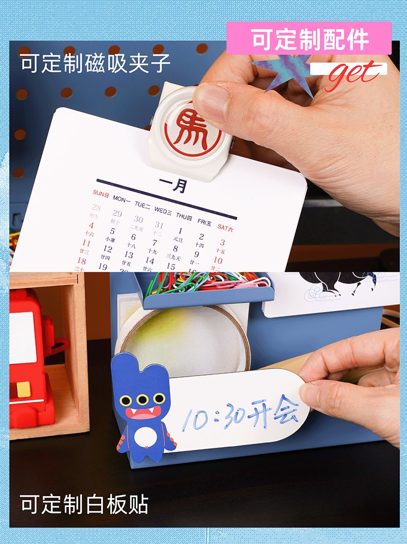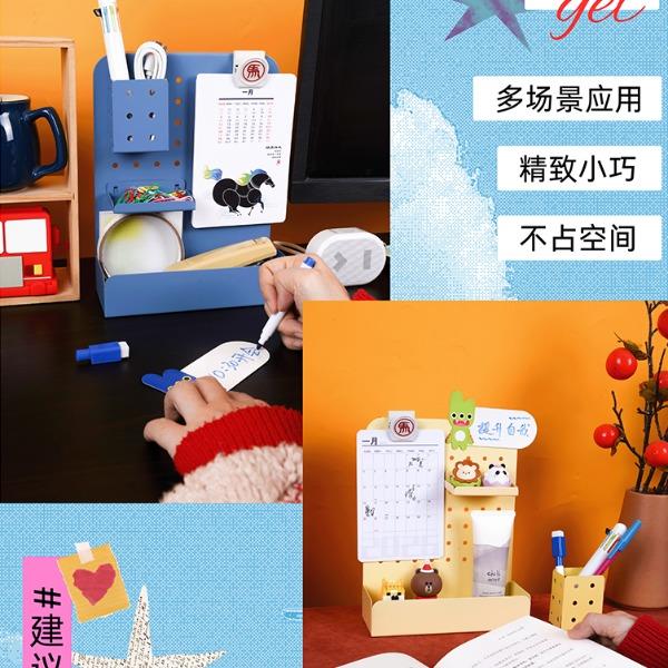 桌面洞洞板*1 23cm*18cm (山影蓝/奶黄色) 挂件笔筒*1 6.5cm*5cm 磁铁夹子*1 3.5cm*3cm 记事月历*1 10cm*15cm 13张 免钉小层架*1 7.5cm*4.5cm 磁吸白板+白板笔*1 11cm*6.5cm 包装盒尺寸:27.5*23.3*10.5cm