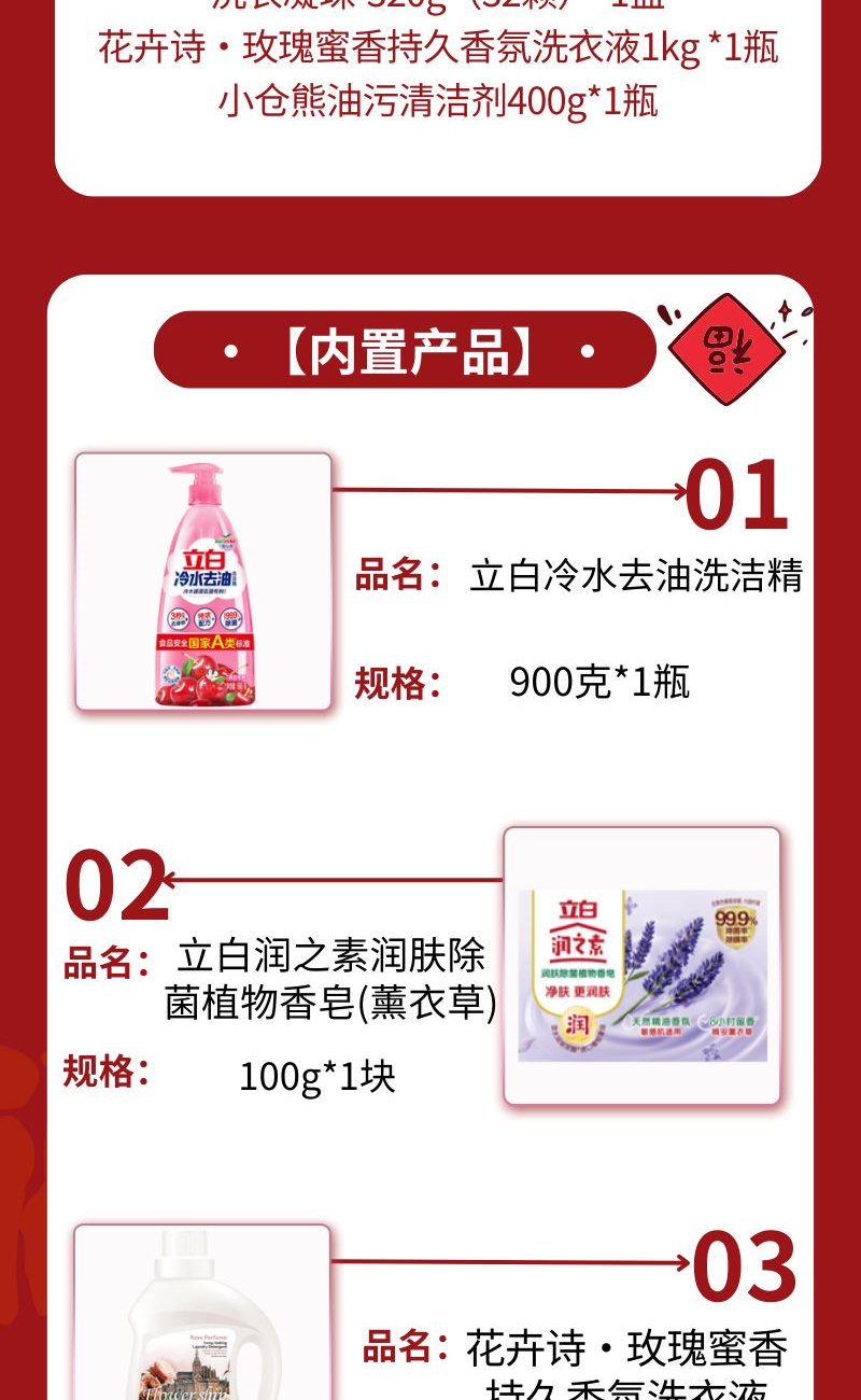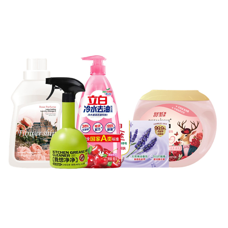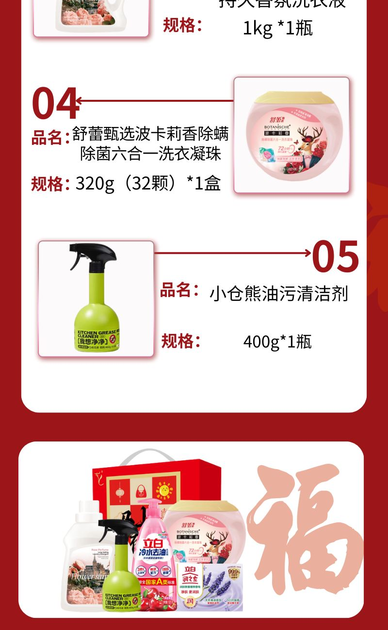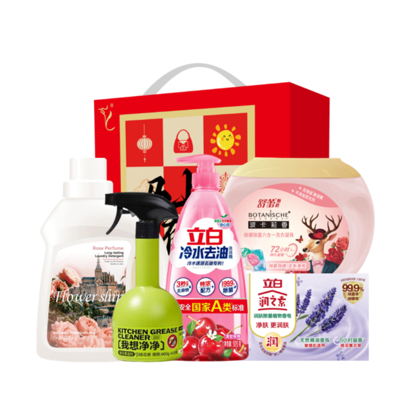 配置: 立白润之素润肤除 菌植物香皂(薰衣草)100g*1块 立白冷水去油洗洁精900克*1瓶 舒蕾甄选波卡莉香除螨除 菌六合一洗衣凝珠-320g(32颗)*1盒 花卉诗·玫瑰蜜香持久香氛洗衣液1kg *1瓶 小仓熊油污清洁剂400g*1瓶 卖点: 可选产品丰富多样,礼箱随心组合,多种价位因需而定,充分满足各种送礼需求,是商务送礼、单位福利的用心之选。
