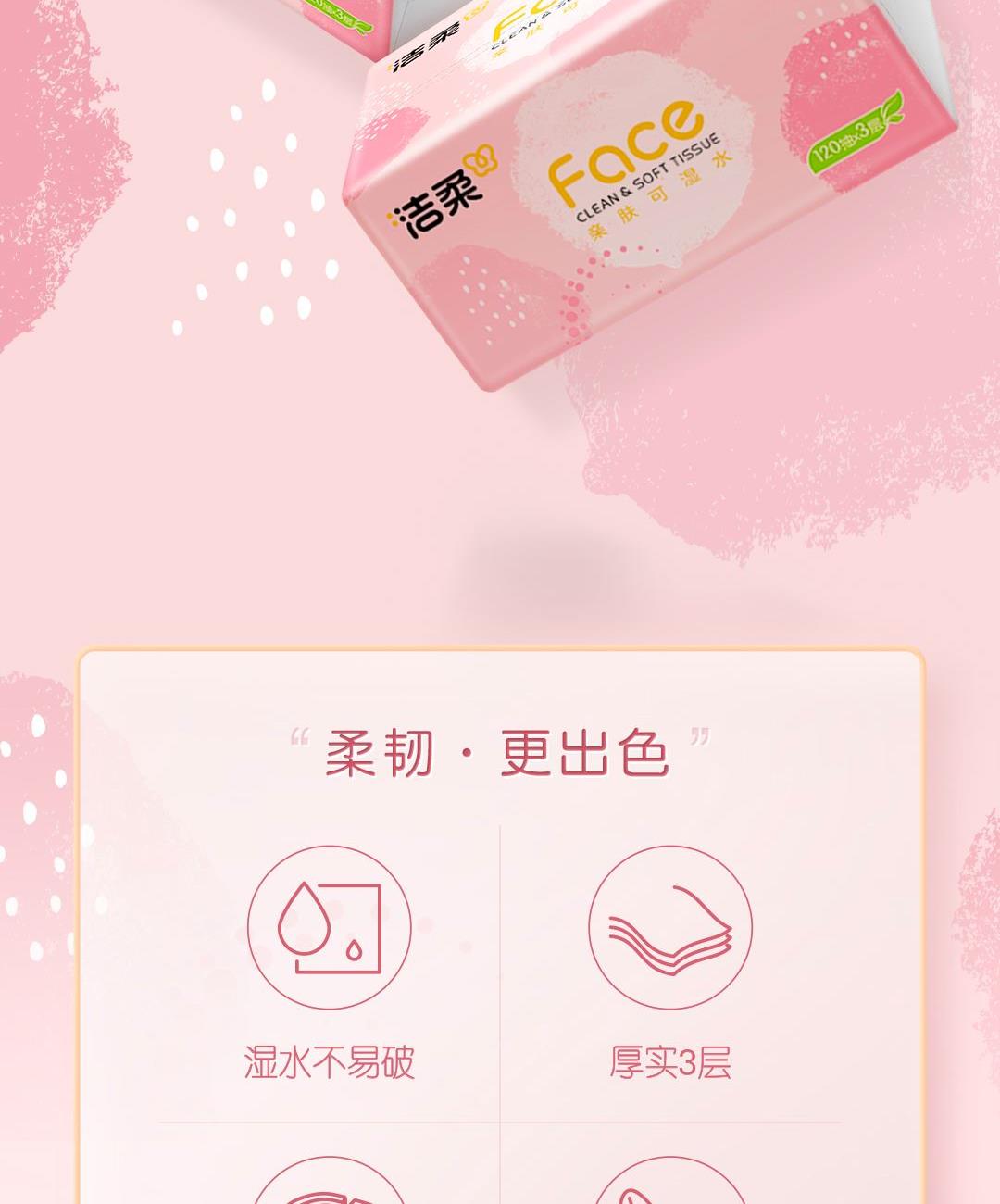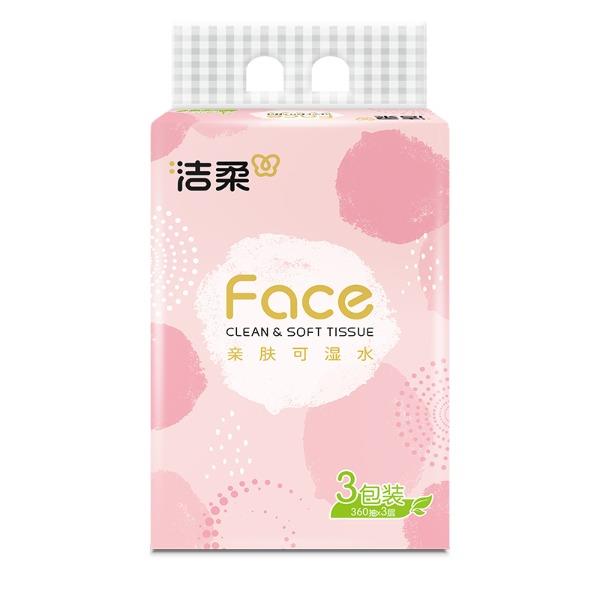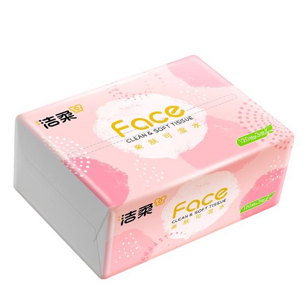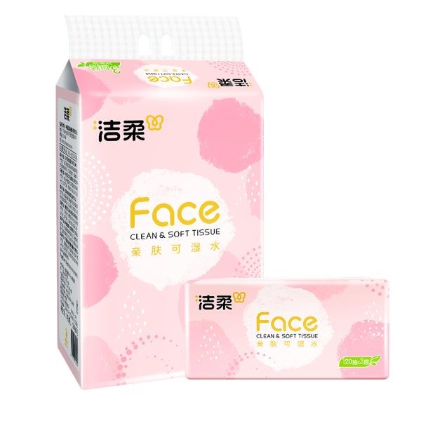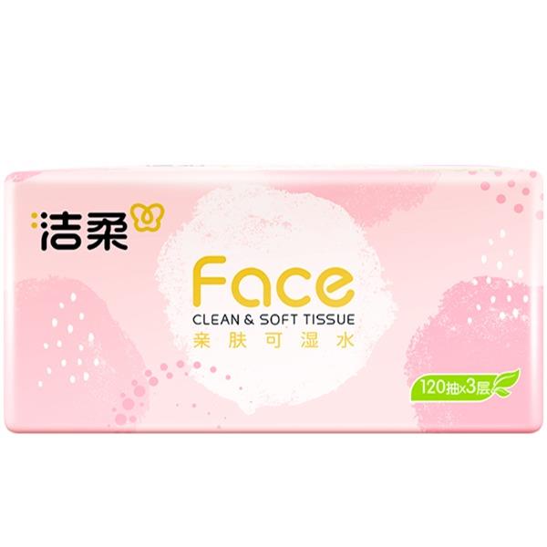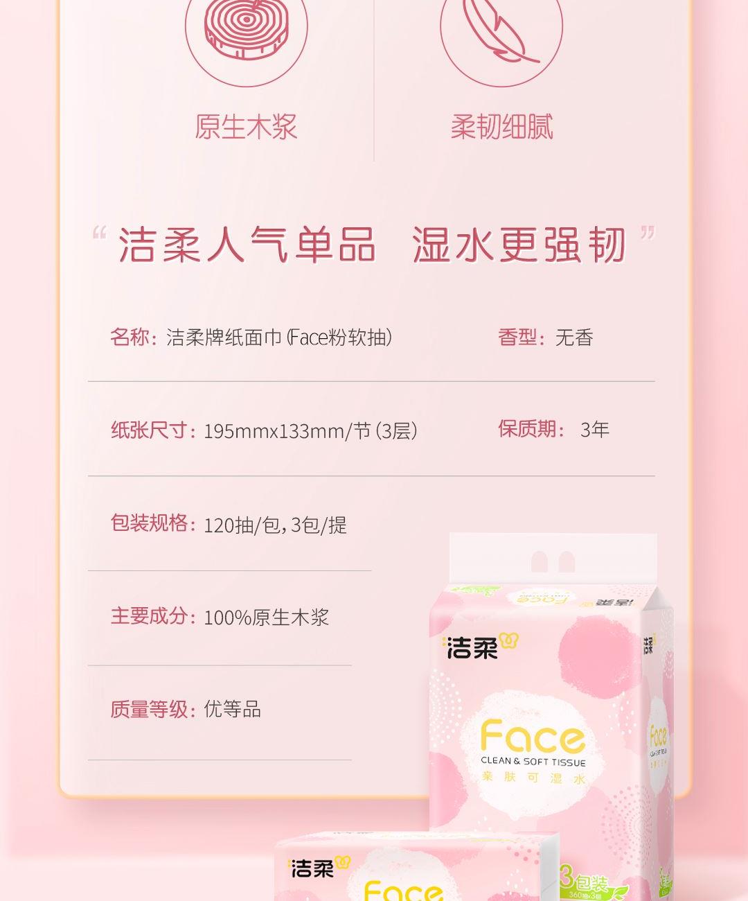 PR273-03A洁柔牌纸面巾(粉FACE软抽)120抽3层(3包装) 香型:无香 纸张尺寸:195mmx133mm/节(3层) 保质期:3年 包装规格:120抽/包,3包/提 主要成分:原生木浆 质量等级:优等品 亲肤可湿水 洁柔 3包装