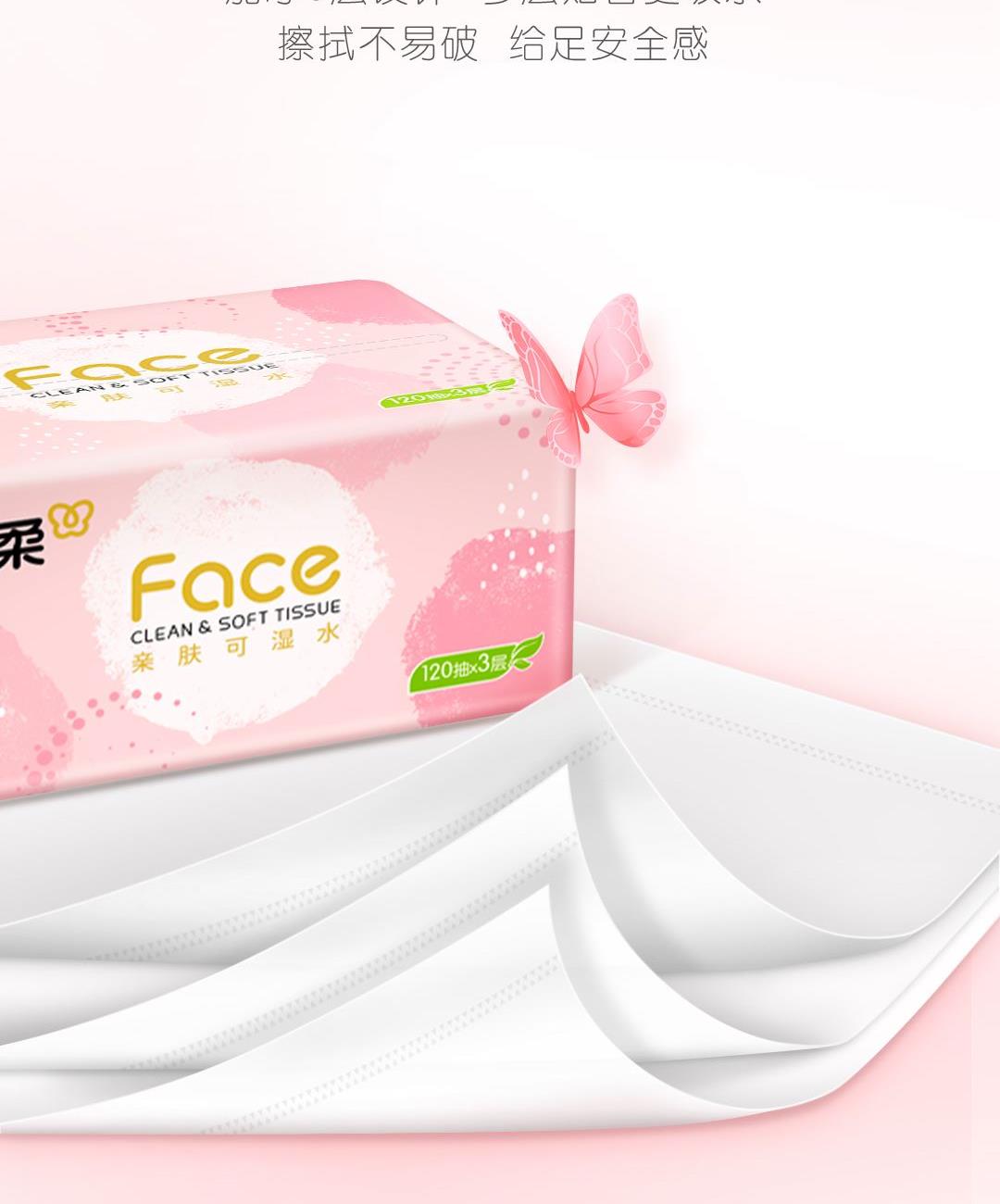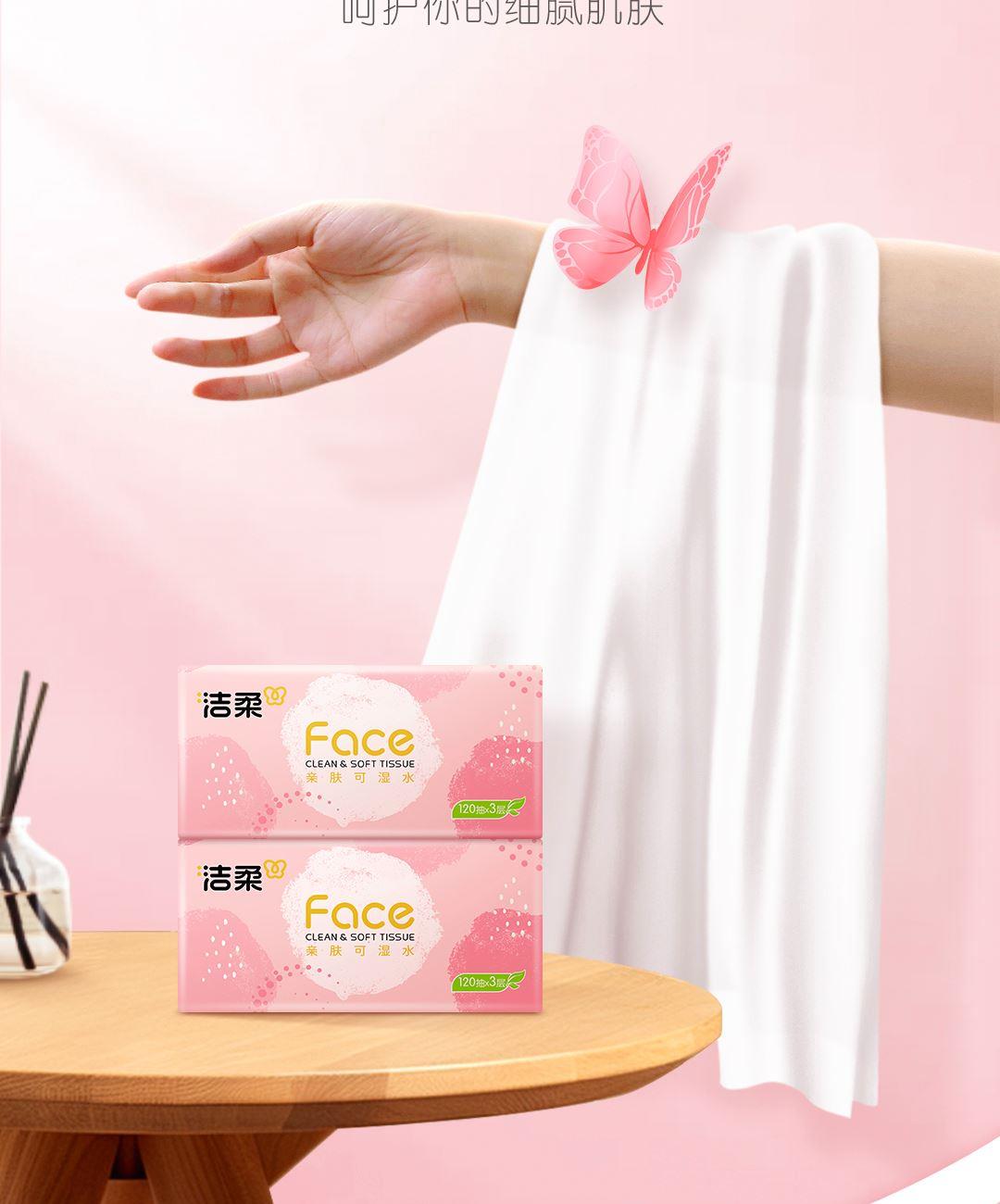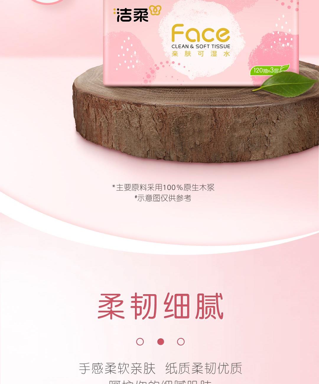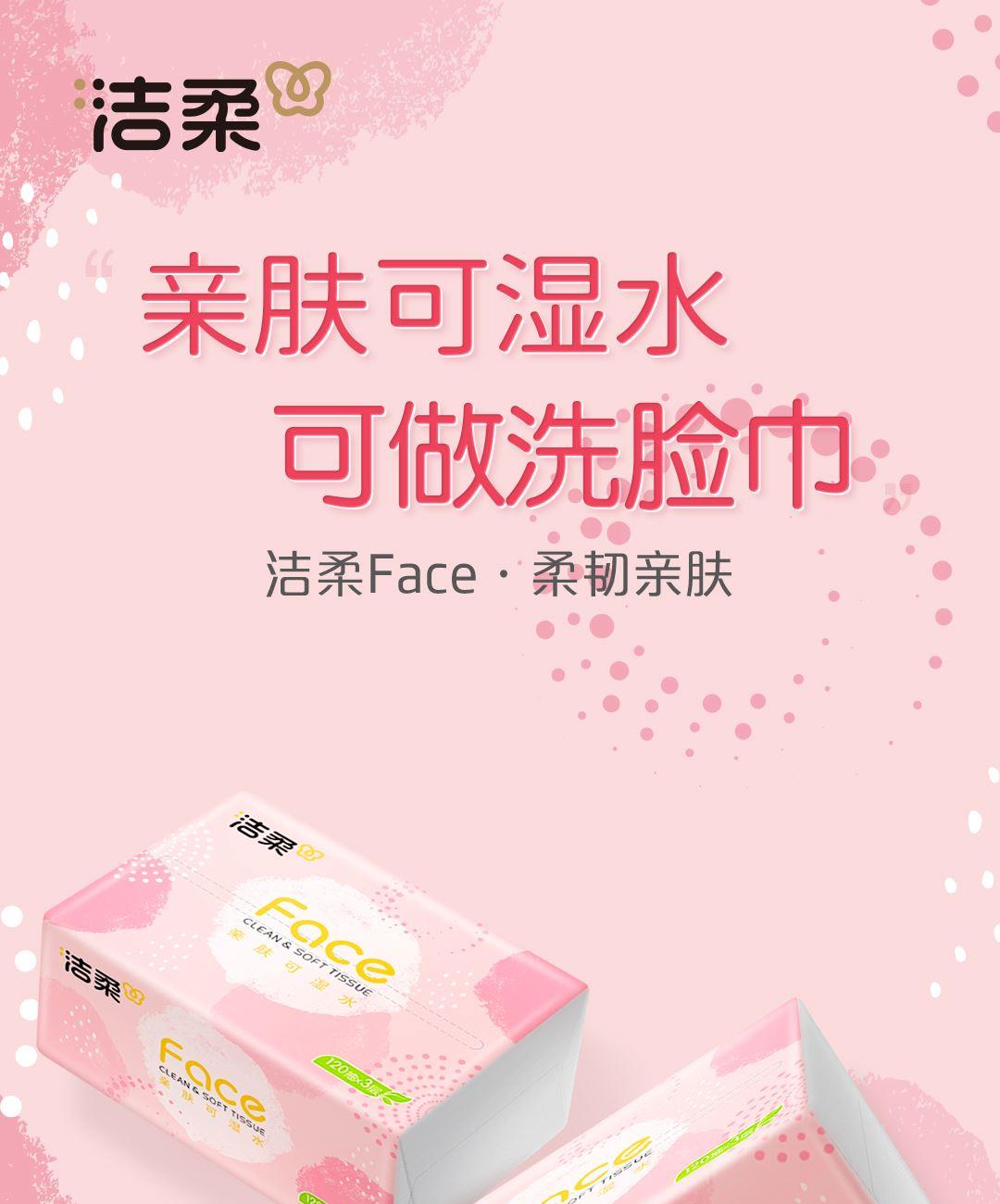 PR273-03A洁柔牌纸面巾(粉FACE软抽)120抽3层(3包装) 香型:无香 纸张尺寸:195mmx133mm/节(3层) 保质期:3年 包装规格:120抽/包,3包/提 主要成分:原生木浆 质量等级:优等品 亲肤可湿水 洁柔 3包装