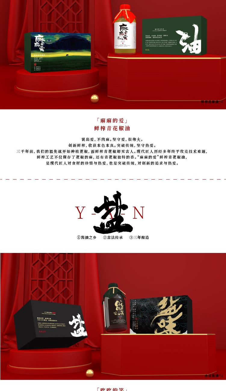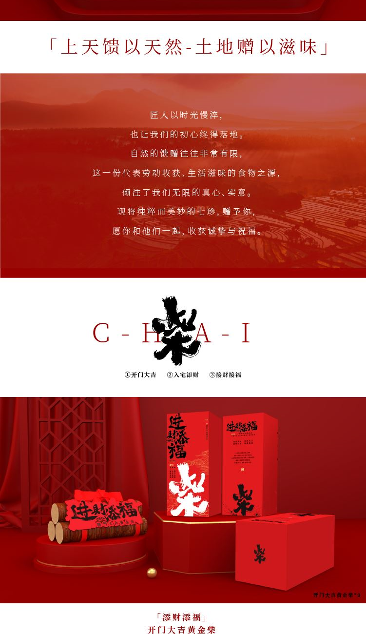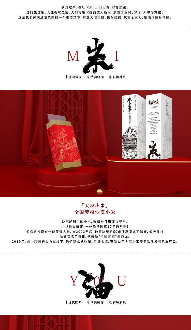【油】鲜榨花椒油*1个 【柴】开门大吉柴*3个 【米】大漠小米*1个 【盐】三年晒酱*1个 【酱】松茸美菇酱*1个 【茶】非遗茉莉花茶*10个
