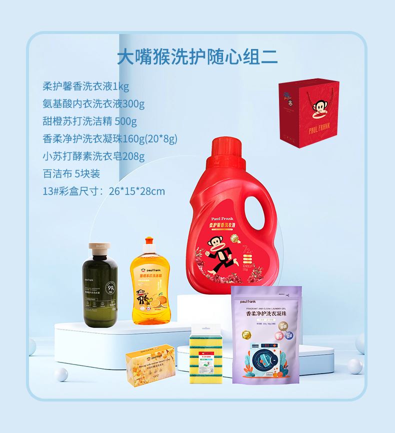 柔护馨香洗衣液1kg 氨基酸内衣洗衣液300g 甜橙苏打洗洁精500g 香柔净护洗衣凝珠160g 小苏打酵素洗衣皂208g 百洁布5块装