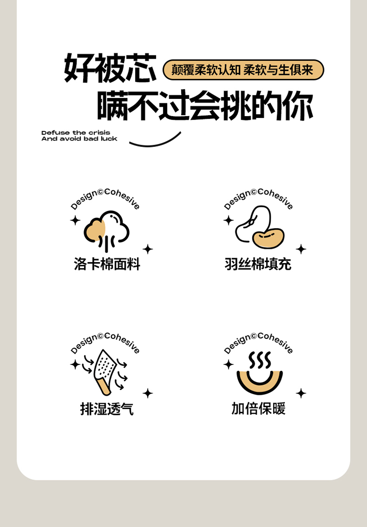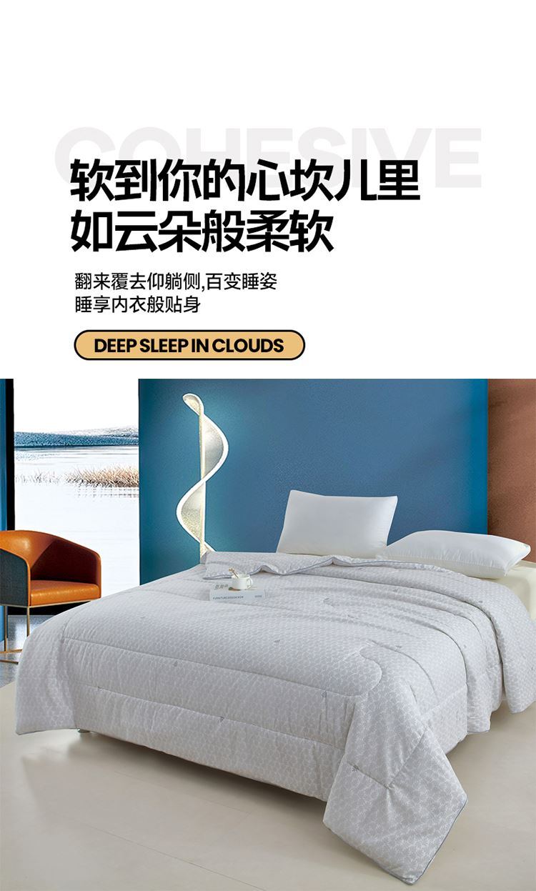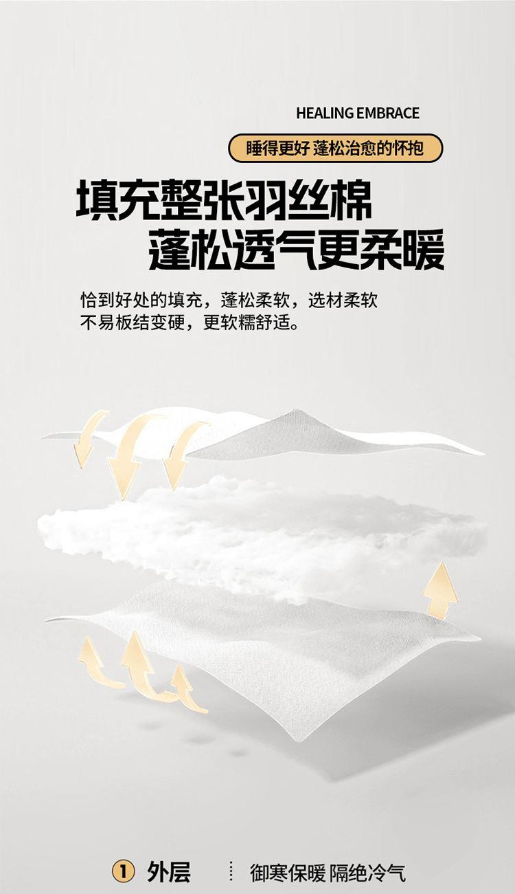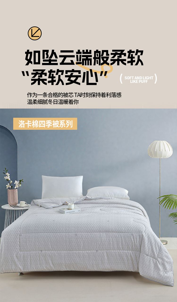 面料材质:洛卡棉 填 充:羽丝棉 产品规格:200*230cm 克 重:2000g 产品包装:精美礼盒 包装尺寸:50*40*20cm 1.洛卡棉舒适度非常好,亲肤性也较为优良,触感比较柔软。 2.洛卡棉拥有色牢度较高、抗变形性较好的性能。 3.洛卡棉表面绒毛均匀,手感柔软。