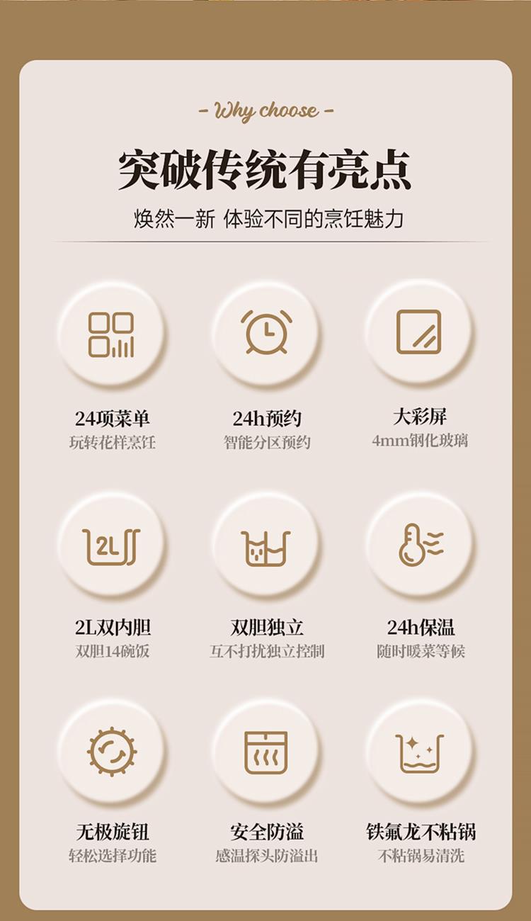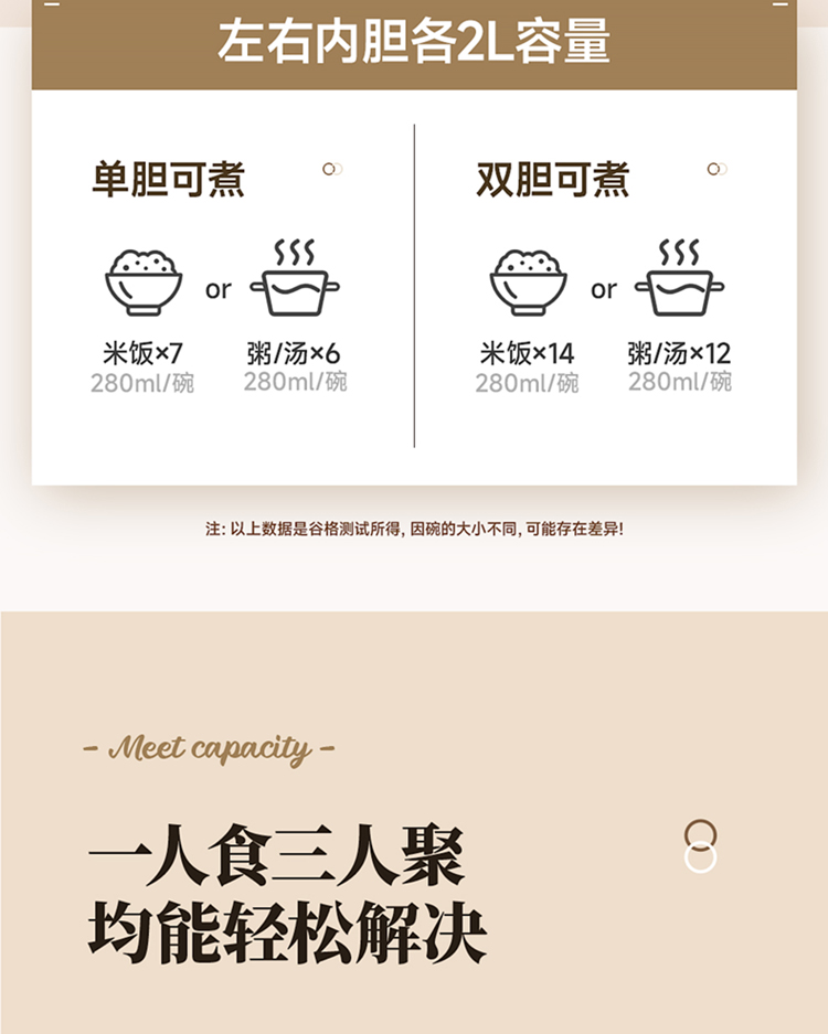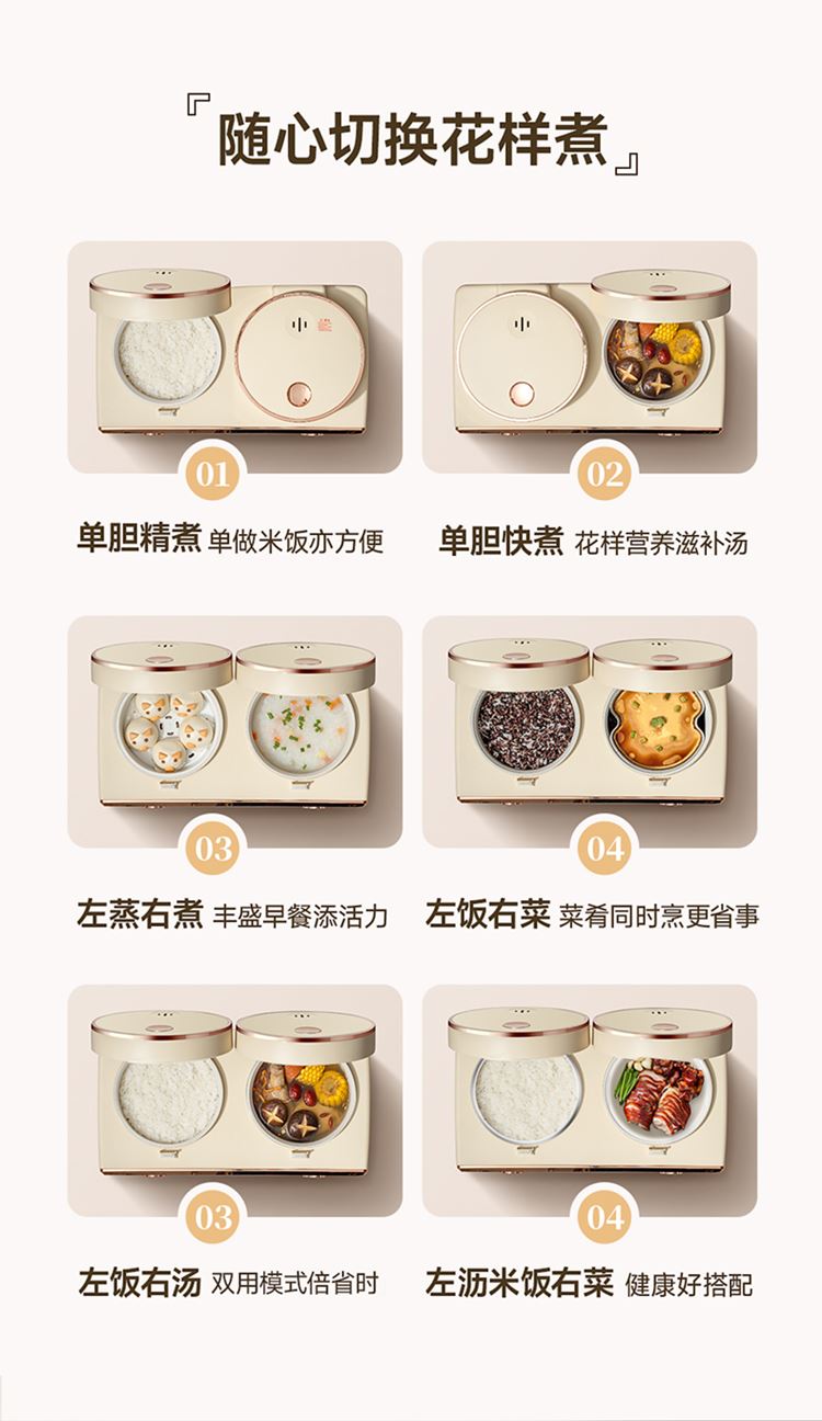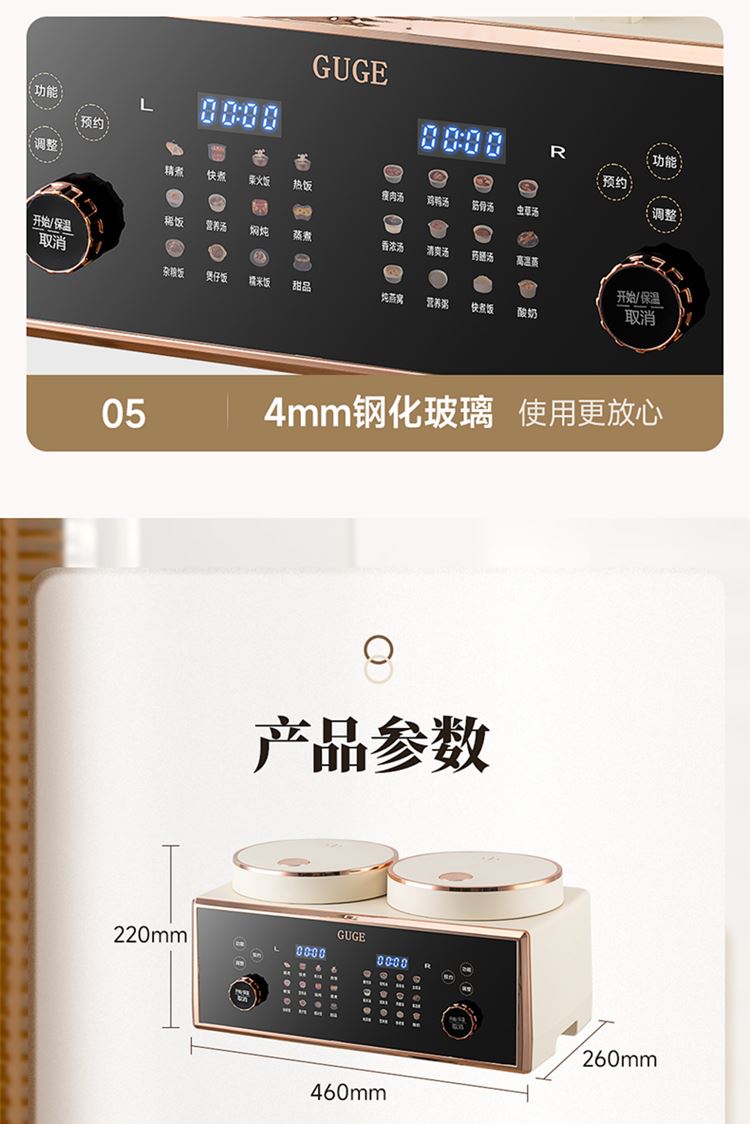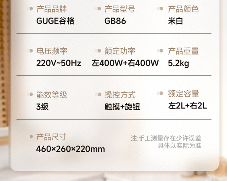 额定功率:800W 额定频率:50HZ 额定电压:220V 额定容量:4L(左2.0L / 右2.0 产品重量:5.2kg 包装方式:彩盒+邮箱 产品尺寸:460*260*220 邮包尺寸:520*305*290 产品净重:5.2kg 产品毛重:6.5kg