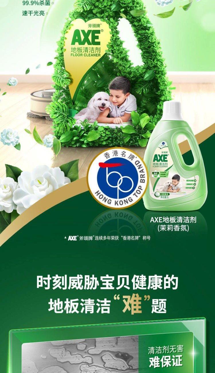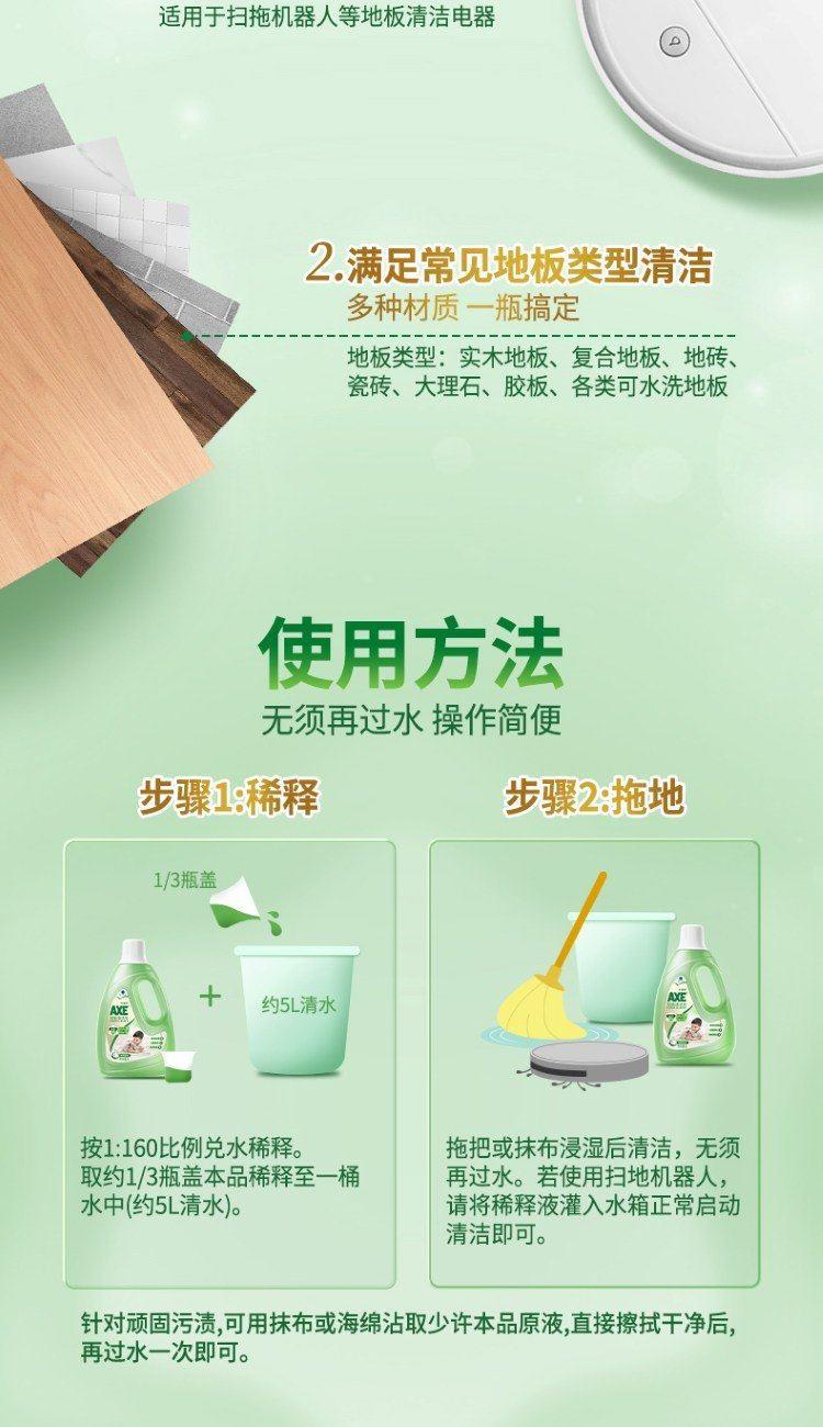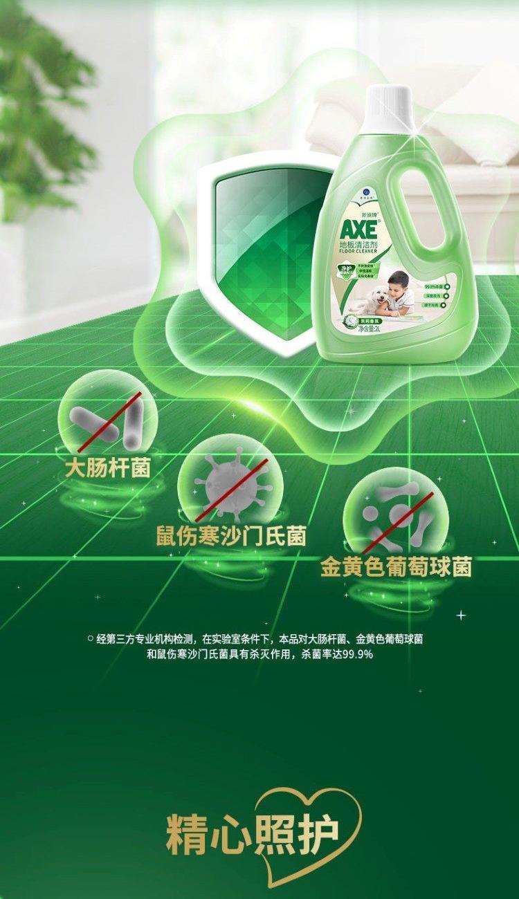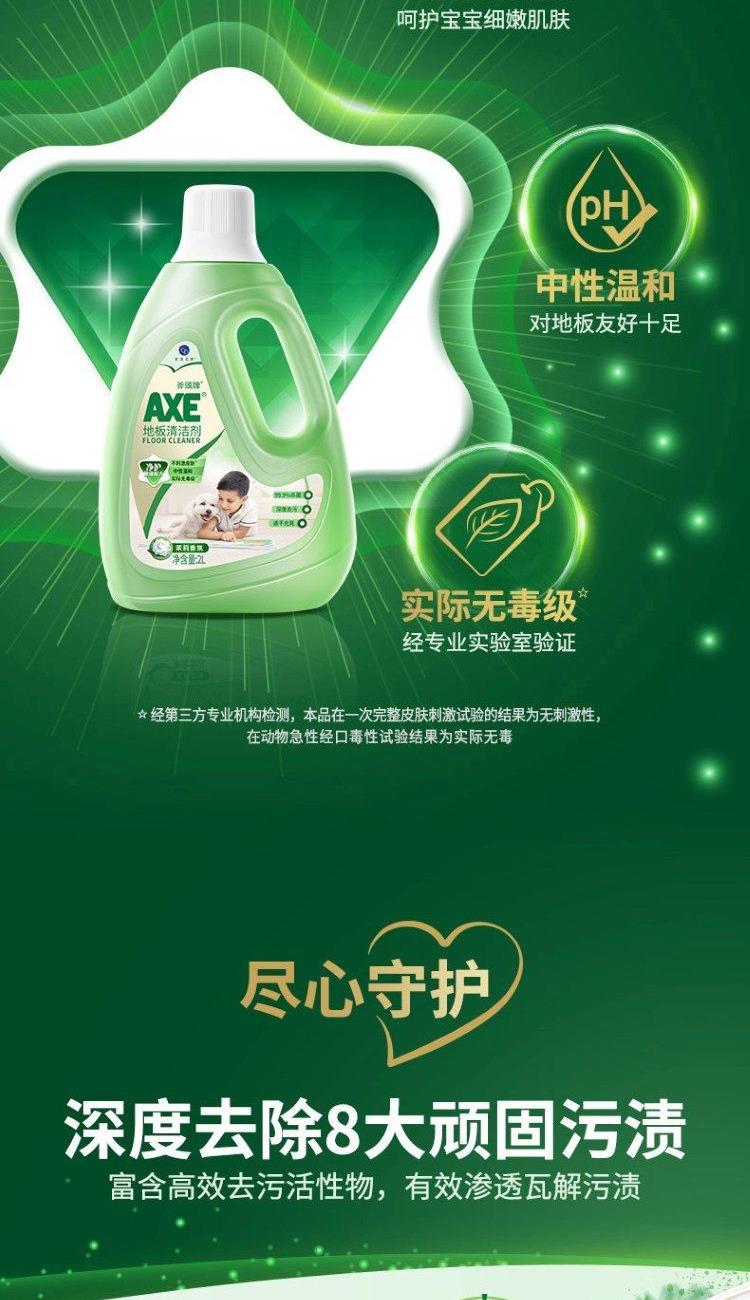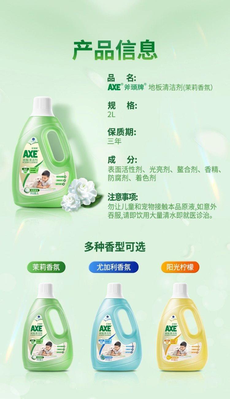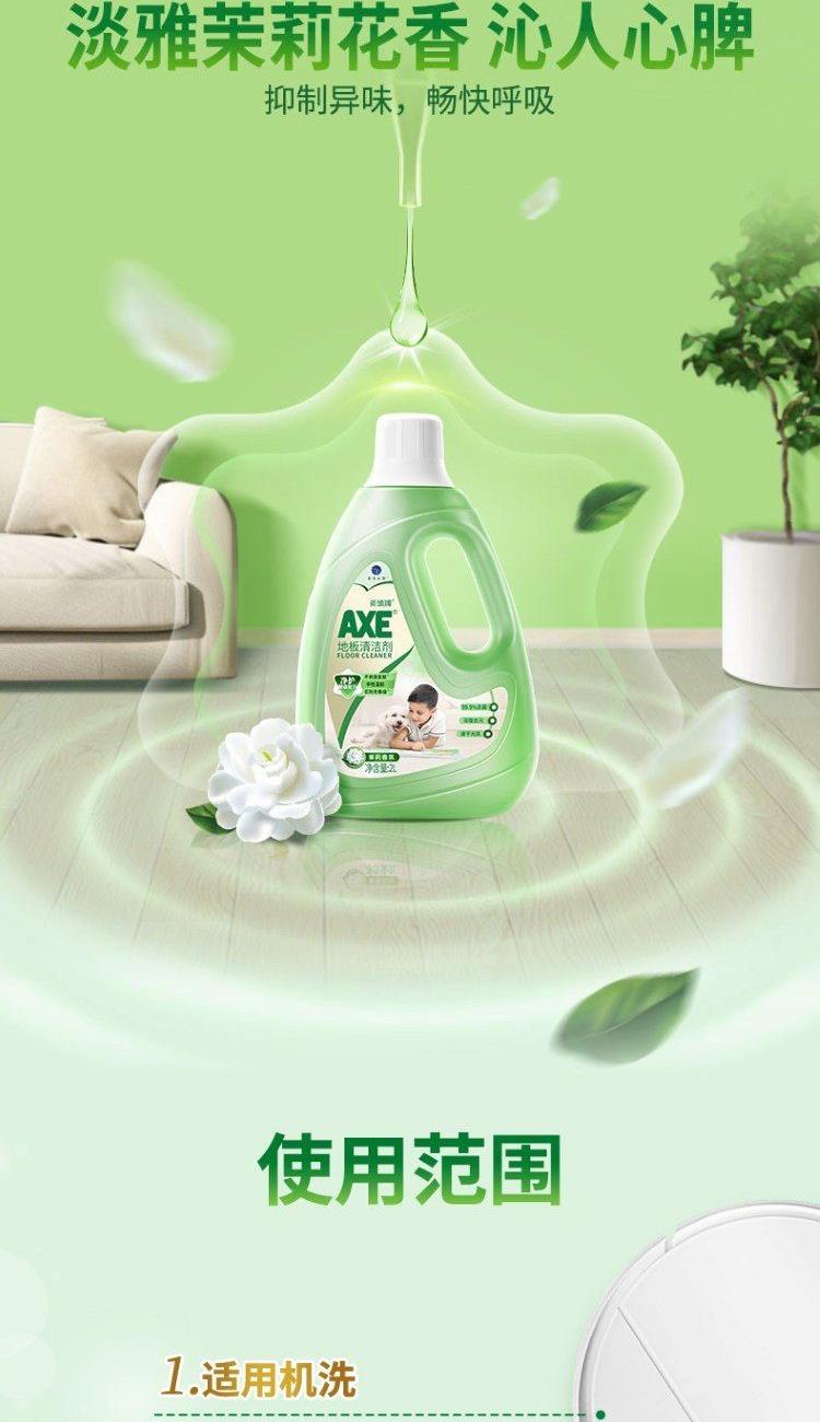 AXE地板清洁剂(茉莉清香)2L 保质期: 三年 成 分: 表面活性剂、光亮剂、鳌合剂、香精、 防腐剂、着色剂 注意事项: 勿让儿童和宠物接触本品原液,如意外 吞服,请即饮用大量清水即就医诊治。