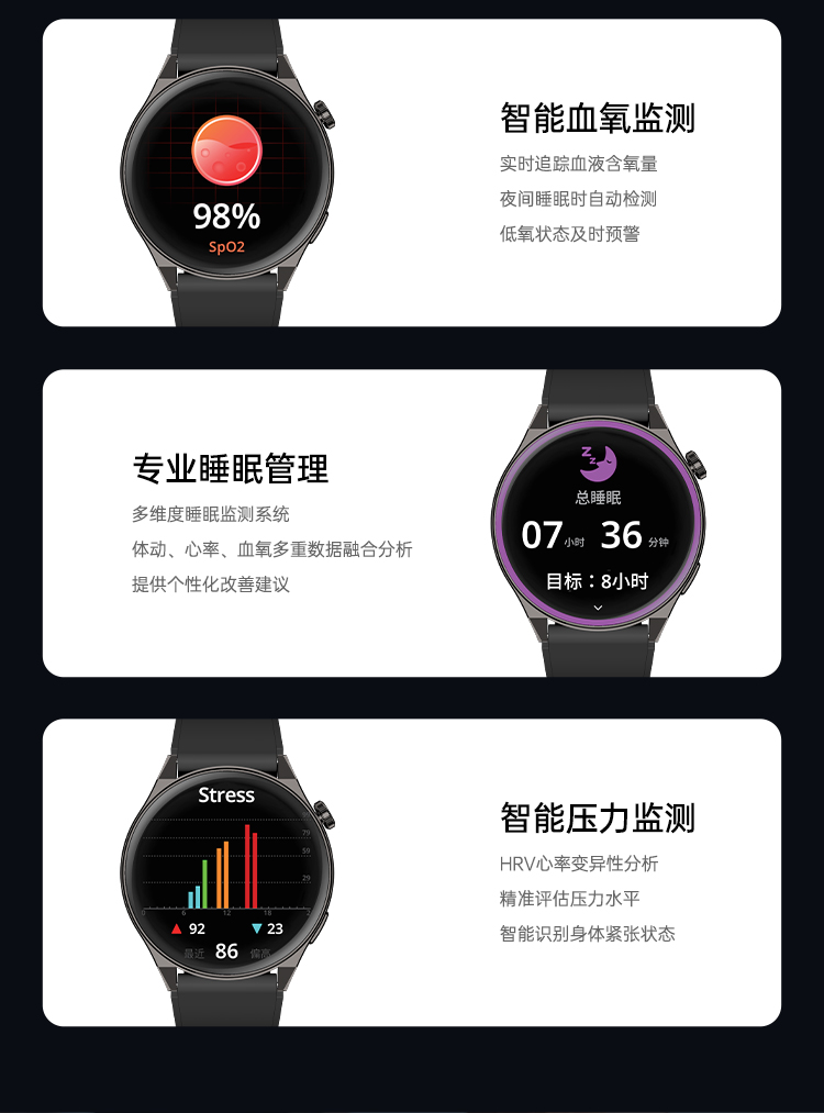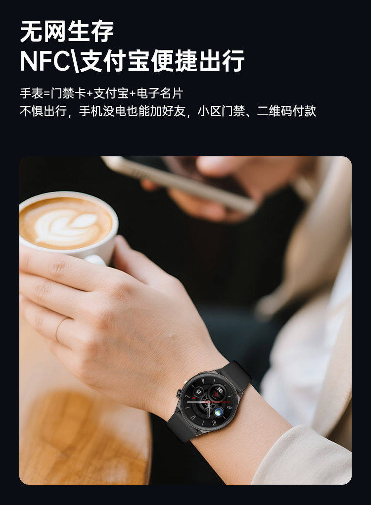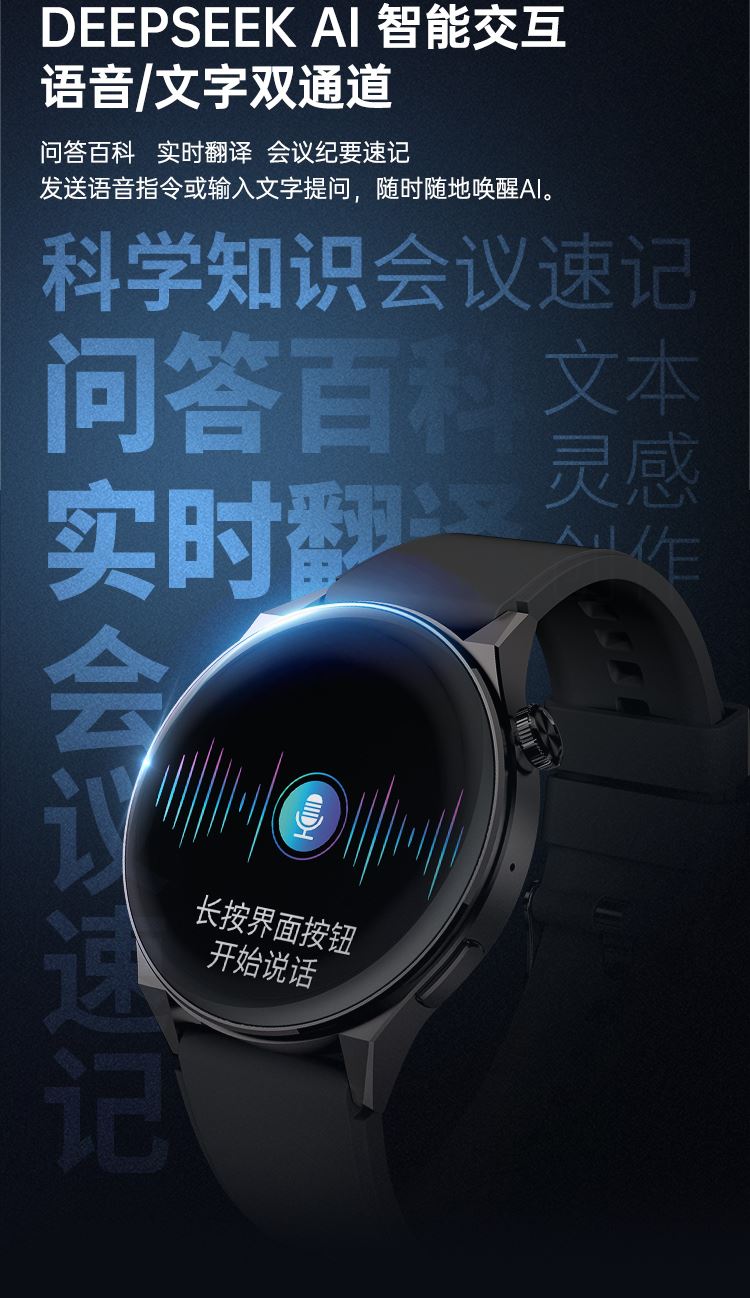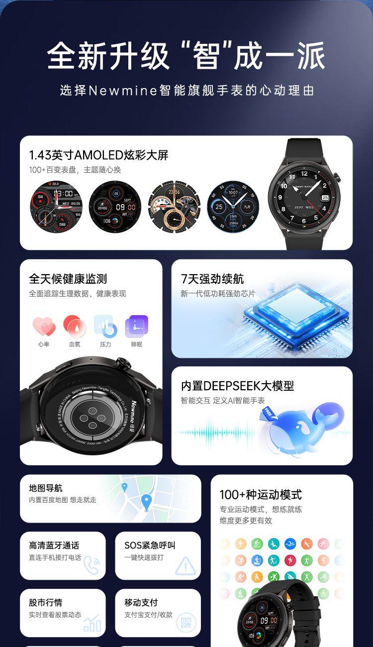 主机颜色:黑色 表带颜色:黑色 屏幕材质:AMOLED 屏幕尺寸:1.43英寸 续航时间:~5-7天 电池容量:300mAh 防水等级:IP68 产品重量:60.2g(硅胶表带) DeepSeek大模型 蓝牙通话 血氧心率压力健康监测 离线支付收款码NFC门禁