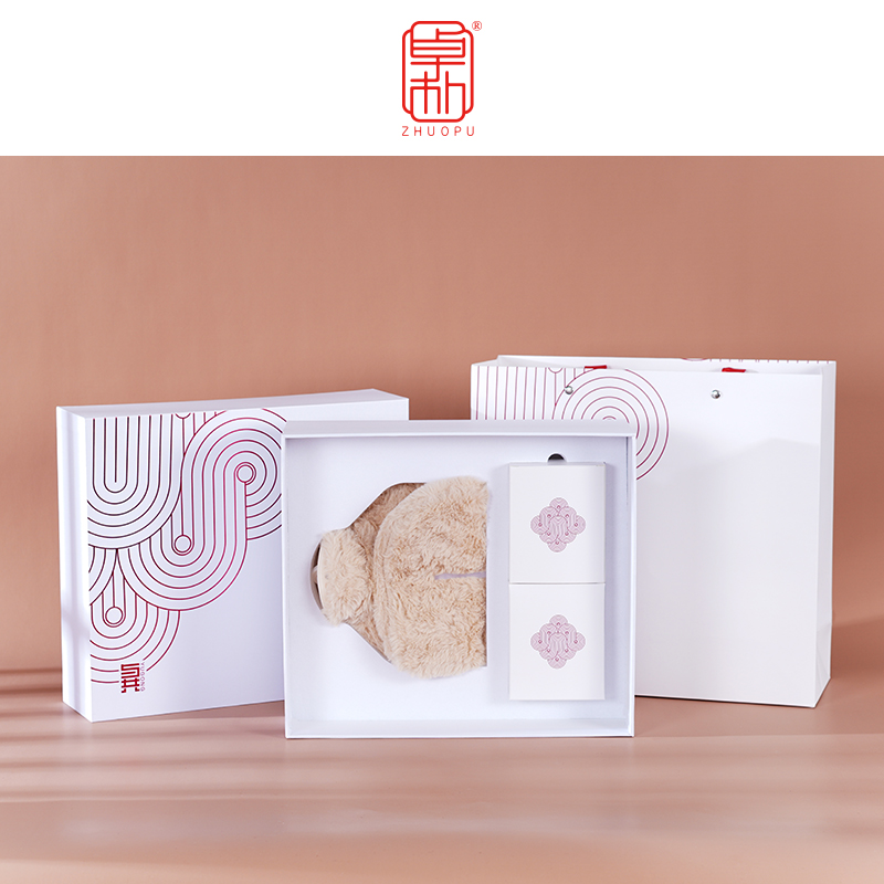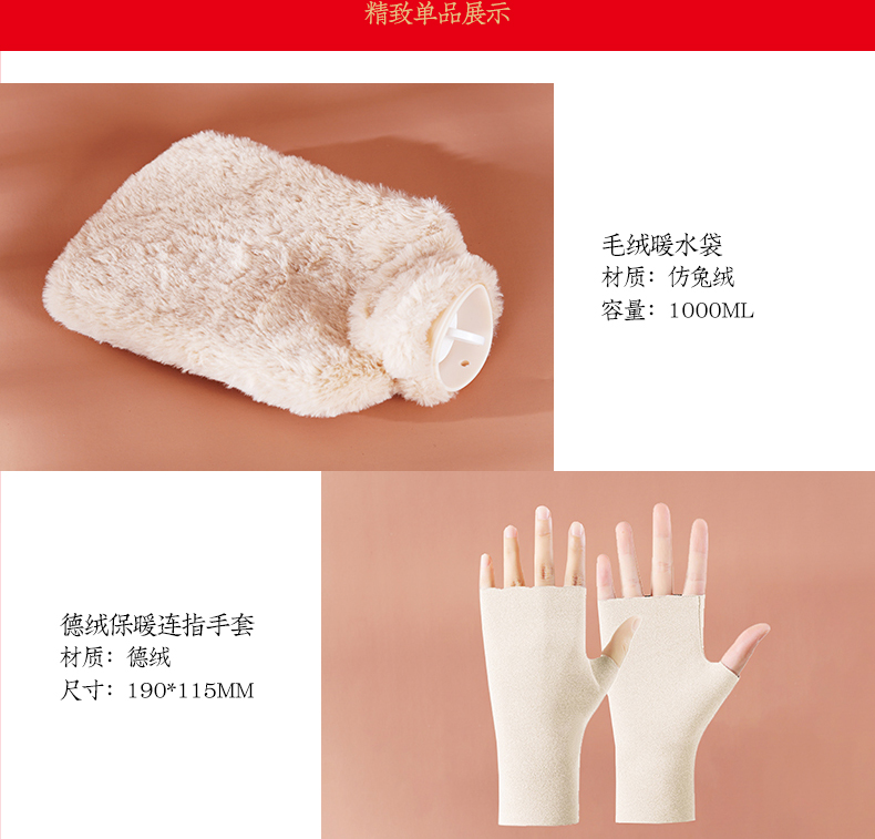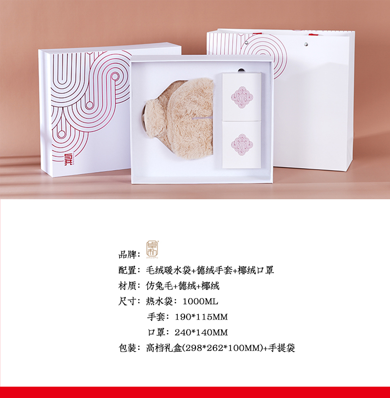 配置:毛绒暖水袋+德绒手套+椰绒口罩 材质:仿兔毛+德绒+椰绒 尺寸:热水袋:1000ml 手套:190*115mm 口罩:240*140mm 包装:礼盒(298*262*100mm)+手提袋