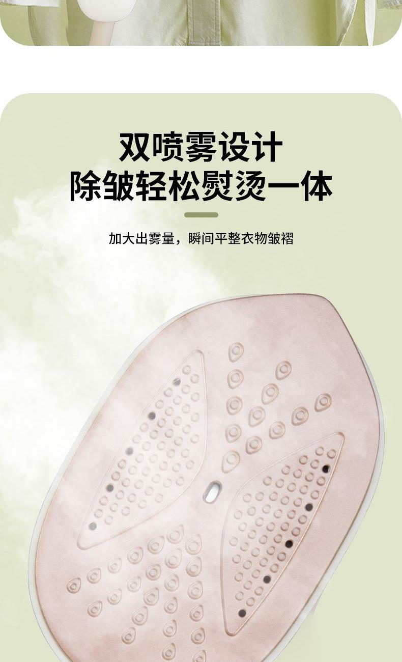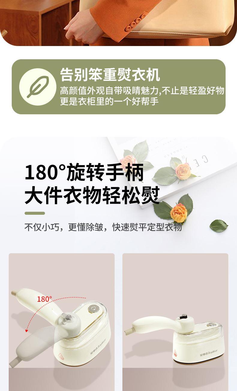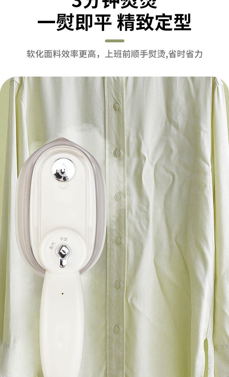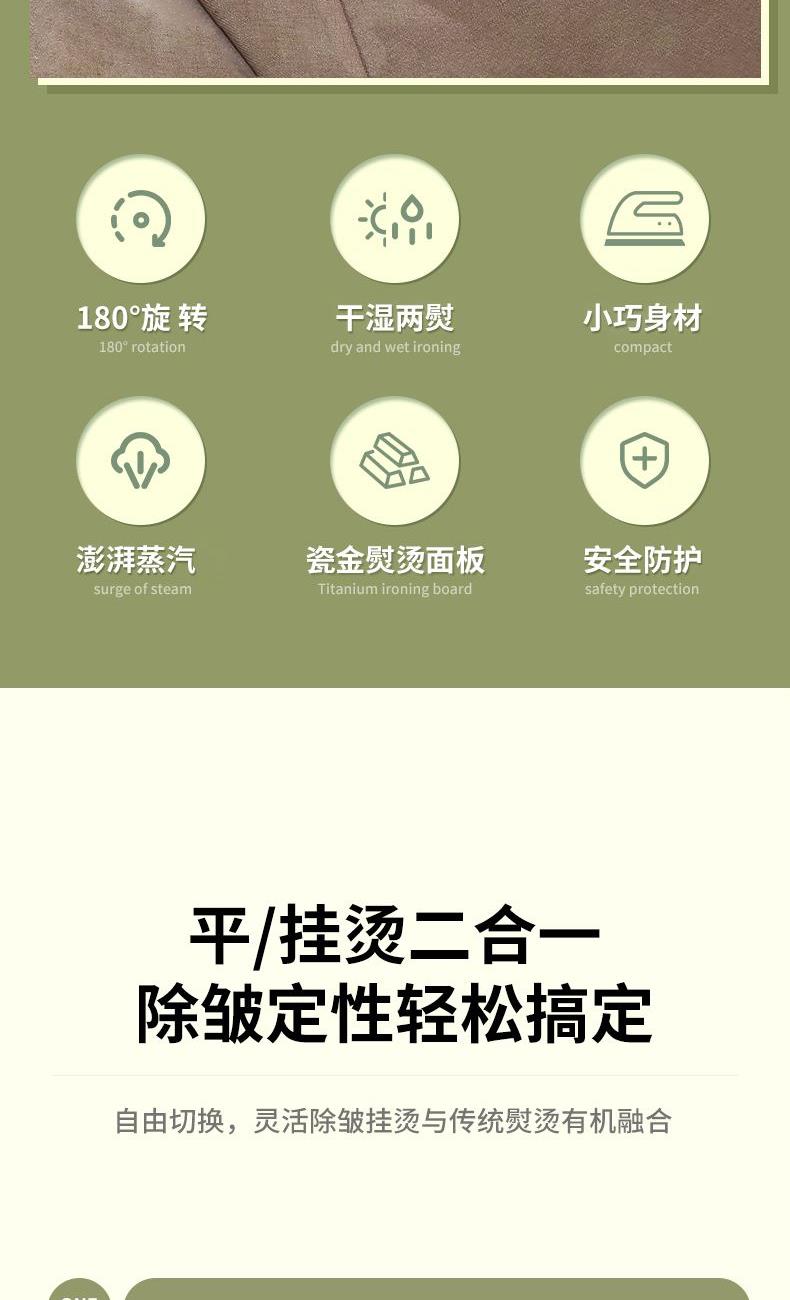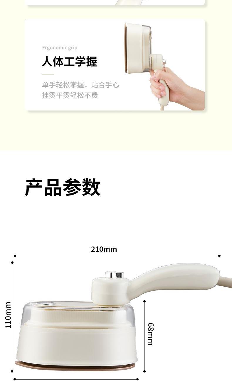 定电压:220V~ 额定功率:1050W 额定容量:100mL 产品材质:ABS、铝、陶瓷 商品条码:6936394601834 1. 灵活旋转手柄 180°旋转:手柄可180°旋转,方便收纳,节省空间,尤其适合小户型家庭使用。 2. 金属熨烫面板 金属面板经过陶瓷喷涂处理,顺滑耐磨,有效保护衣物还原柔顺质感;高效导热:金属材质导热迅速,确保熨烫效果均匀,节省时间;双尖角设计熨平难烫区域 3. 干湿熨烫,平烫挂烫皆宜 一机多用:支持干烫和蒸汽熨烫两种模式,满足不同衣物的熨烫需求。 4. 1050W大功率 高效熨烫:1050W大功率,快速产生蒸汽,穿透力强,轻松应对厚重衣物。 5. 防烫底座 防烫硅胶支撑:底座采用防烫硅胶设计,避免熨斗直接接触桌面,防止烫伤桌面或烫坏衣物。