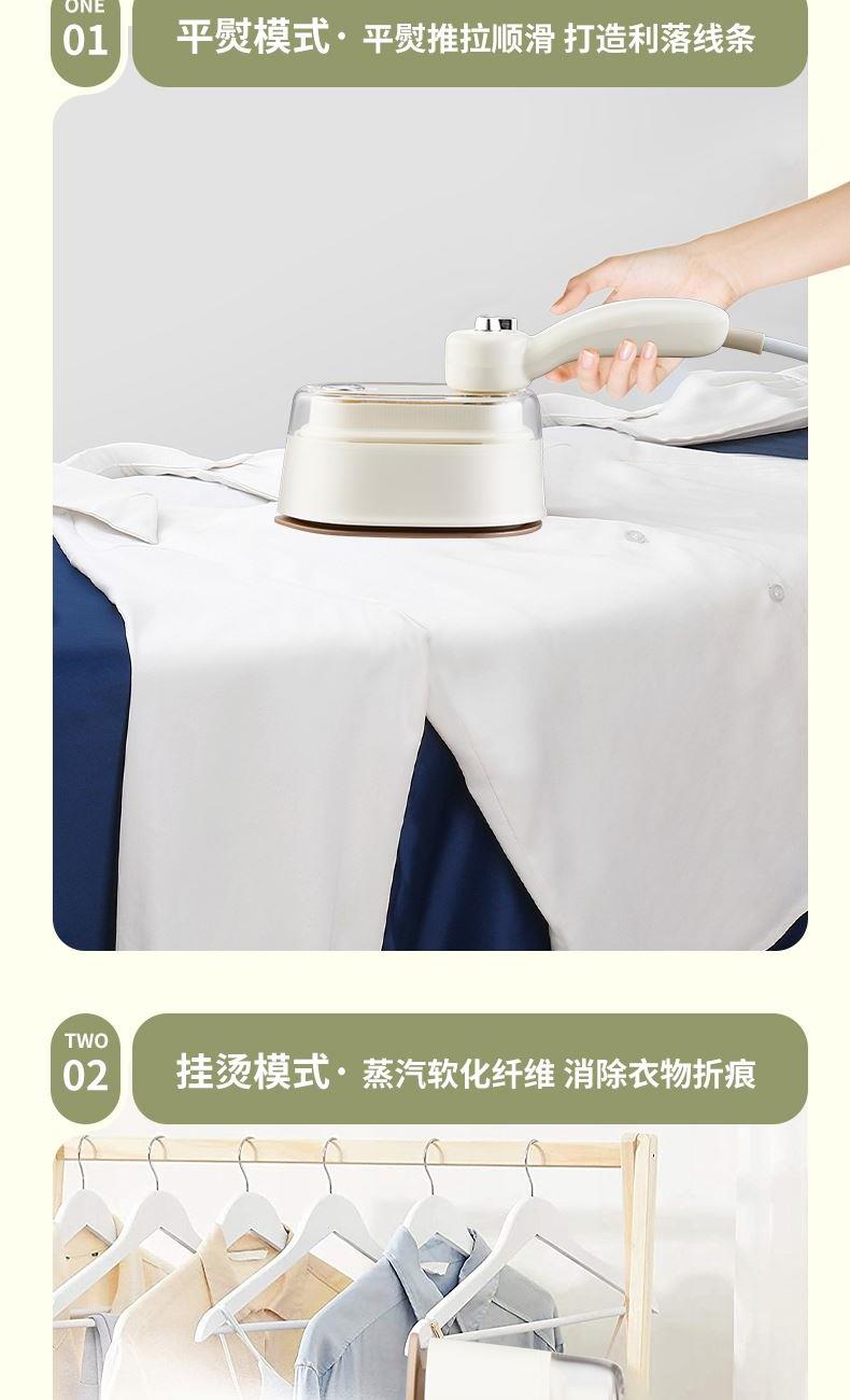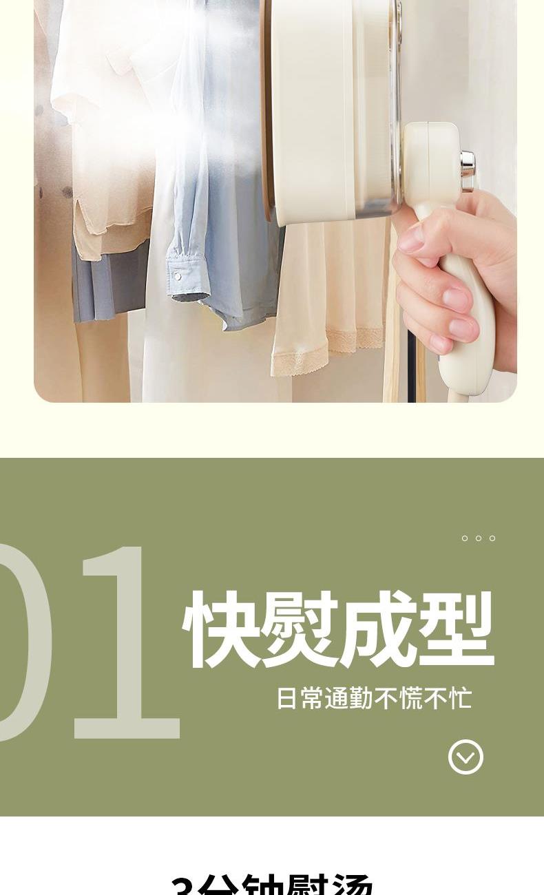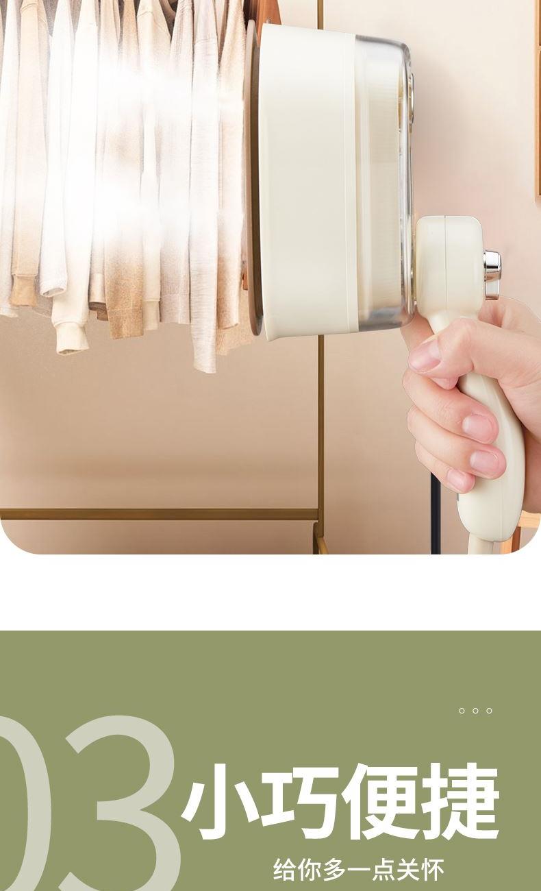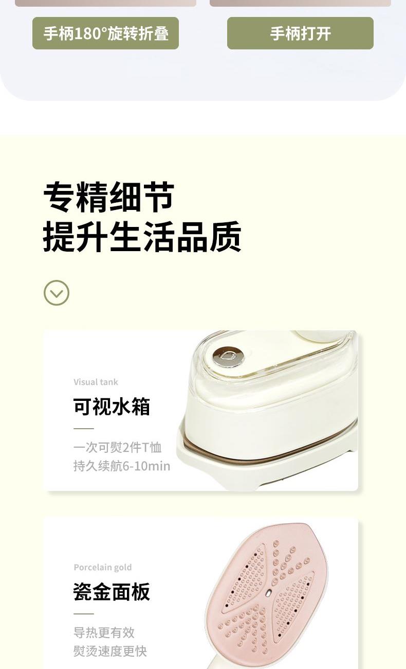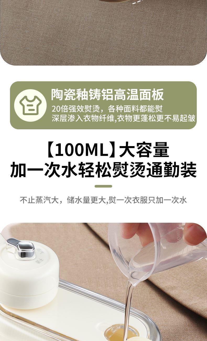 定电压:220V~ 额定功率:1050W 额定容量:100mL 产品材质:ABS、铝、陶瓷 商品条码:6936394601834 1. 灵活旋转手柄 180°旋转:手柄可180°旋转,方便收纳,节省空间,尤其适合小户型家庭使用。 2. 金属熨烫面板 金属面板经过陶瓷喷涂处理,顺滑耐磨,有效保护衣物还原柔顺质感;高效导热:金属材质导热迅速,确保熨烫效果均匀,节省时间;双尖角设计熨平难烫区域 3. 干湿熨烫,平烫挂烫皆宜 一机多用:支持干烫和蒸汽熨烫两种模式,满足不同衣物的熨烫需求。 4. 1050W大功率 高效熨烫:1050W大功率,快速产生蒸汽,穿透力强,轻松应对厚重衣物。 5. 防烫底座 防烫硅胶支撑:底座采用防烫硅胶设计,避免熨斗直接接触桌面,防止烫伤桌面或烫坏衣物。