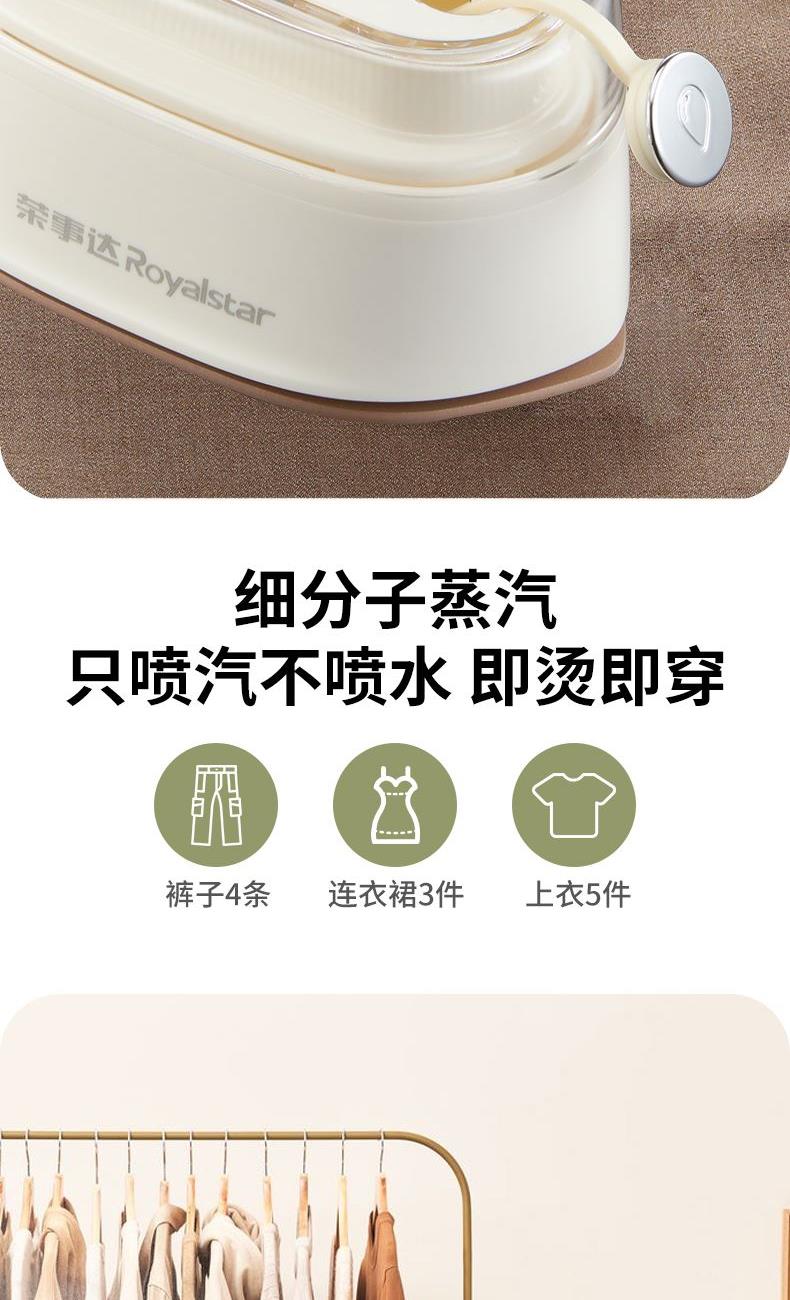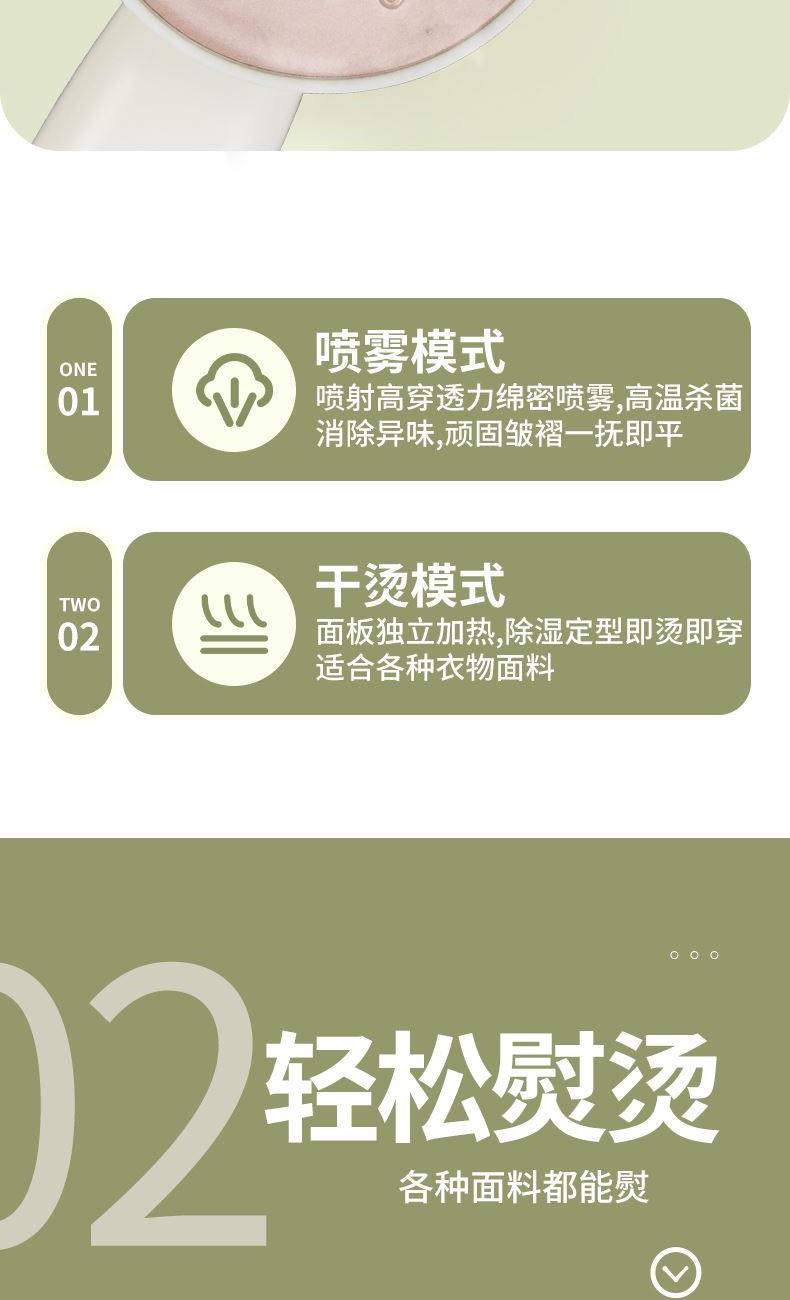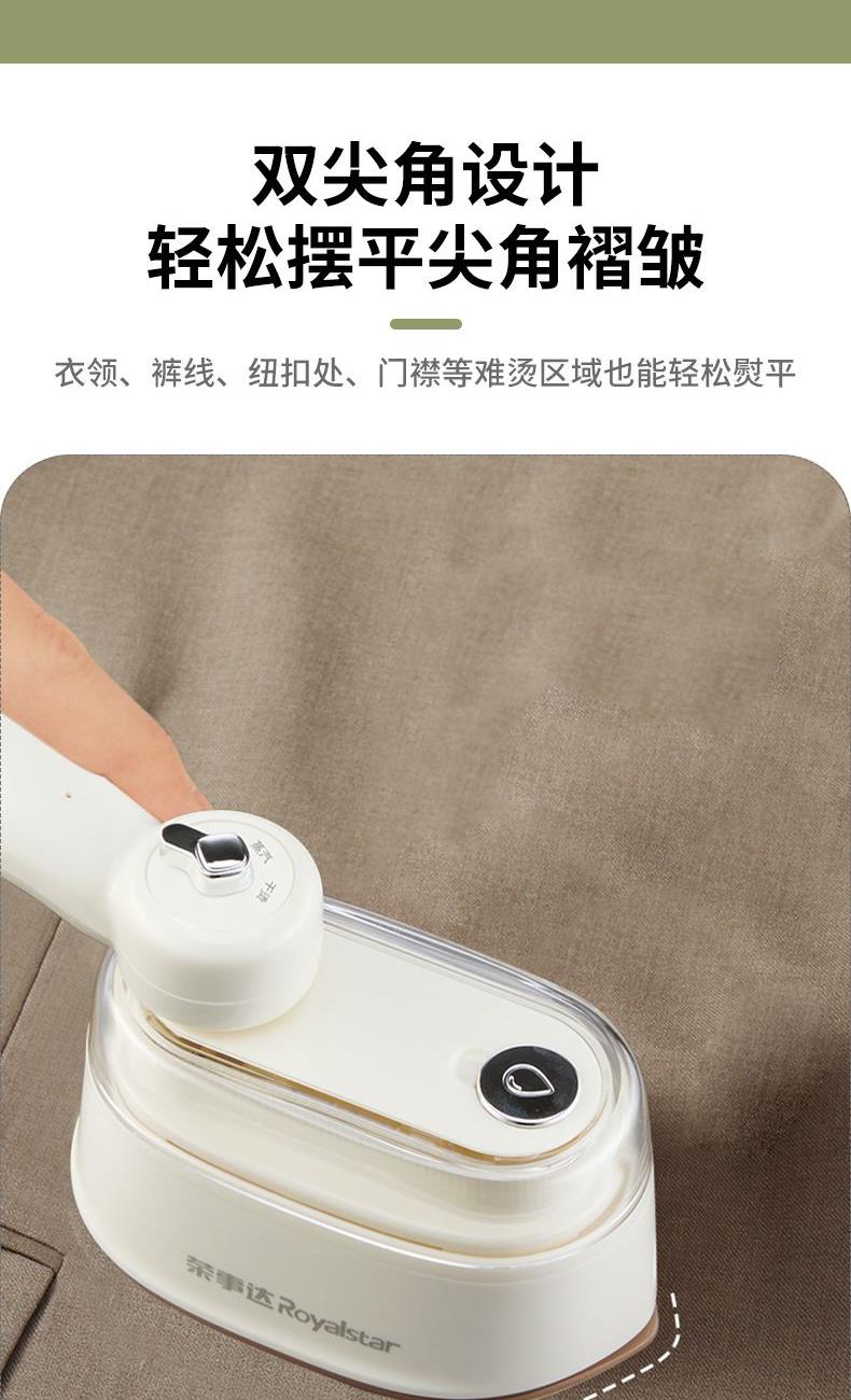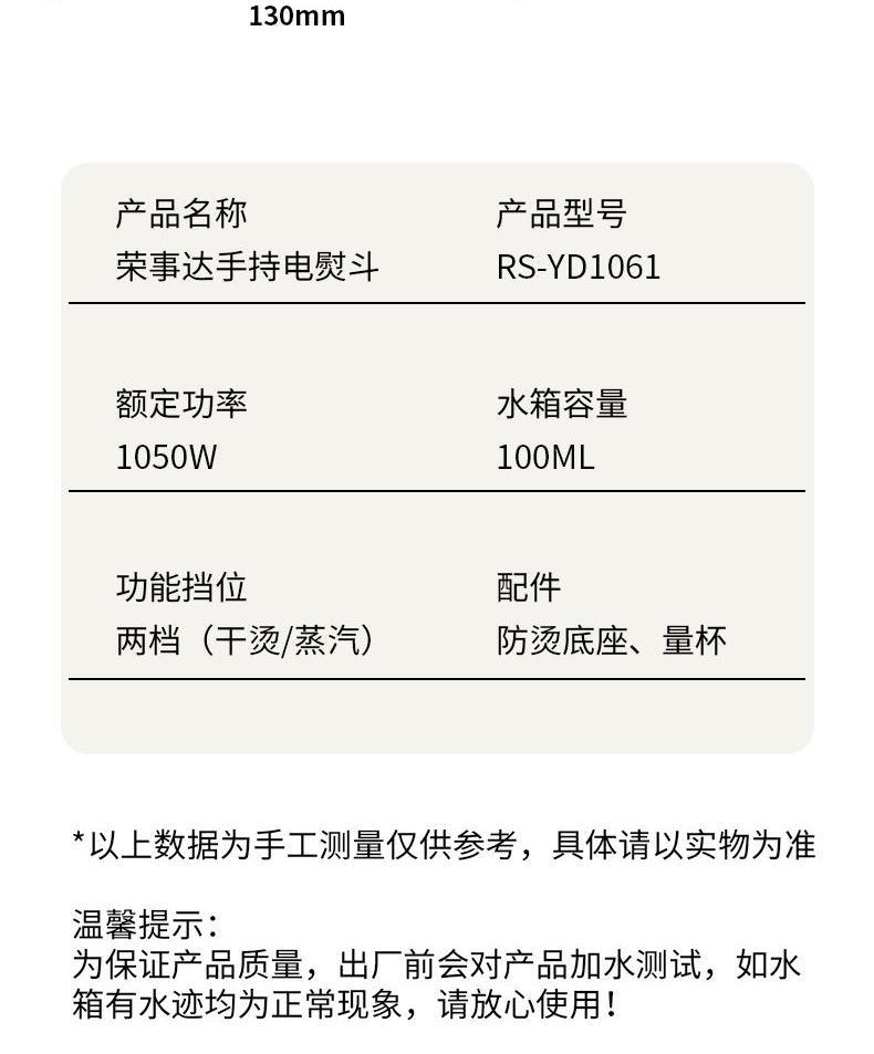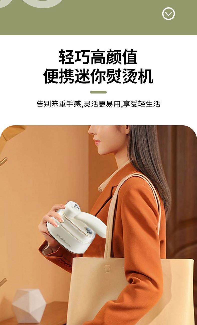 定电压:220V~ 额定功率:1050W 额定容量:100mL 产品材质:ABS、铝、陶瓷 商品条码:6936394601834 1. 灵活旋转手柄 180°旋转:手柄可180°旋转,方便收纳,节省空间,尤其适合小户型家庭使用。 2. 金属熨烫面板 金属面板经过陶瓷喷涂处理,顺滑耐磨,有效保护衣物还原柔顺质感;高效导热:金属材质导热迅速,确保熨烫效果均匀,节省时间;双尖角设计熨平难烫区域 3. 干湿熨烫,平烫挂烫皆宜 一机多用:支持干烫和蒸汽熨烫两种模式,满足不同衣物的熨烫需求。 4. 1050W大功率 高效熨烫:1050W大功率,快速产生蒸汽,穿透力强,轻松应对厚重衣物。 5. 防烫底座 防烫硅胶支撑:底座采用防烫硅胶设计,避免熨斗直接接触桌面,防止烫伤桌面或烫坏衣物。