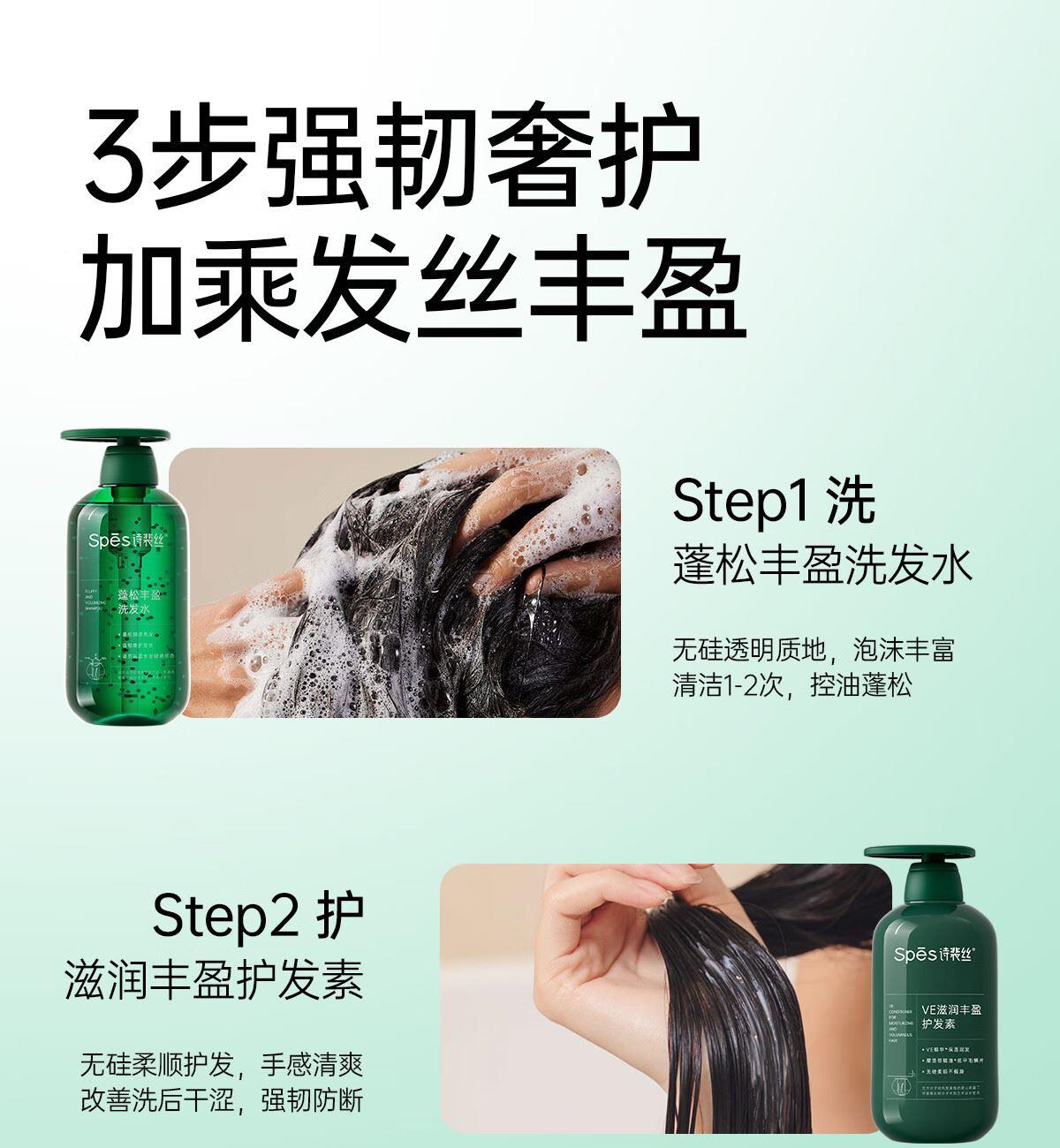 Spēs蓬松丰盈洗发水500ml 适合人群:油性头皮 脆弱易断发质 产品材料: 1、活力小绿珠,面护级维E滋养,唤醒头皮活力 2、草本植萃,减少头皮不适,抵御外界刺激 产品卖点: 有效头皮控油,强韧发丝防断,视觉发量丰盈 适用人群 使用感受: 控油蓬松,断发减少,发量丰盈