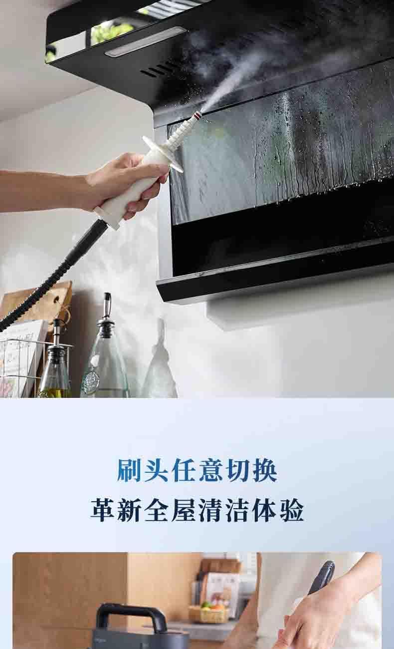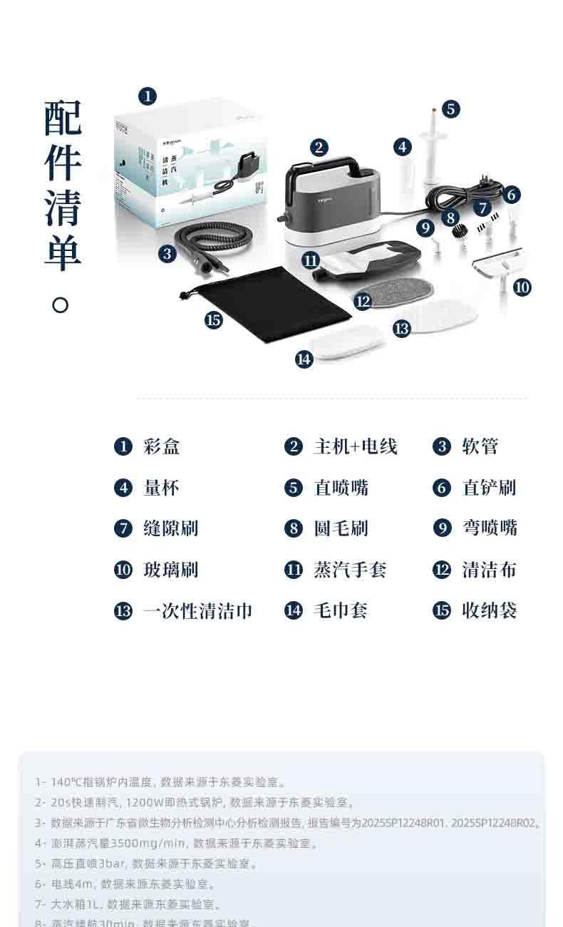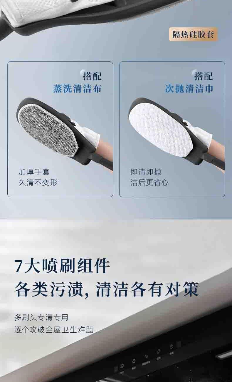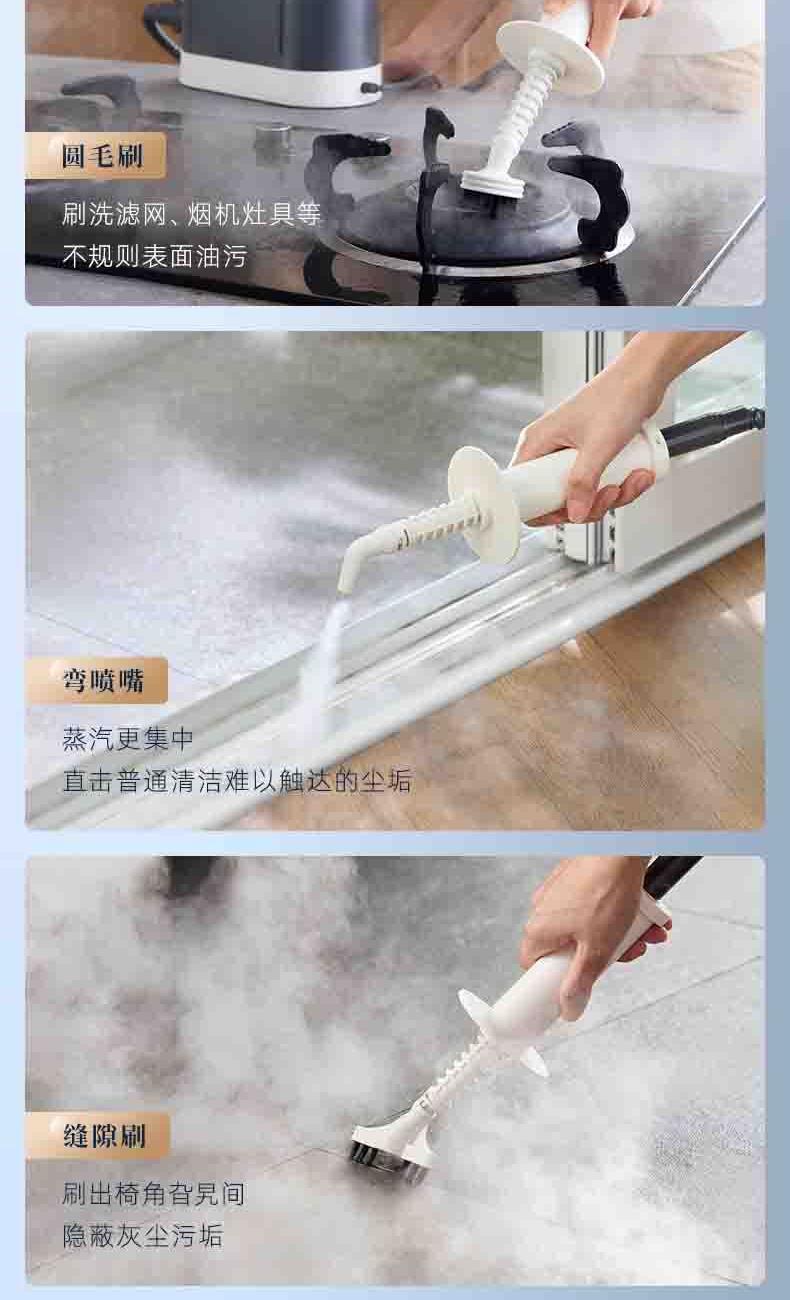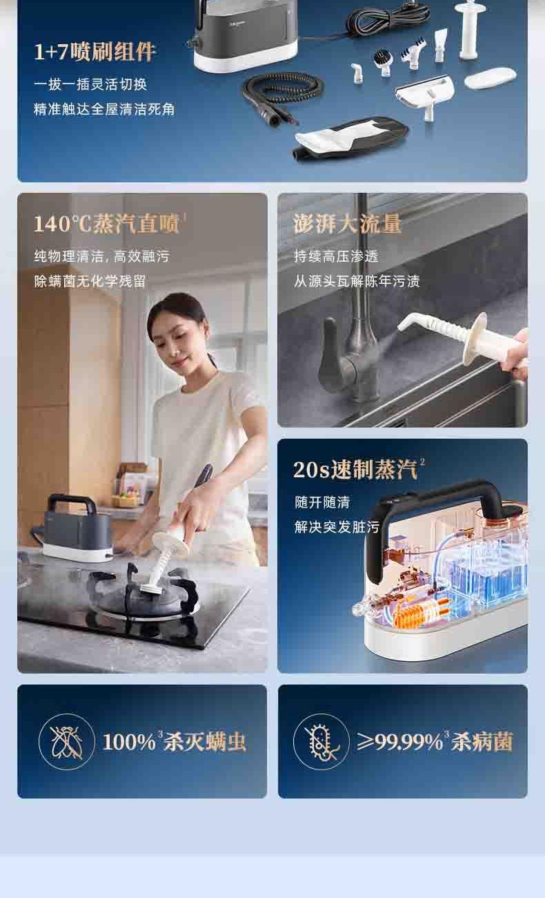 20秒140℃蒸汽3bar高压直喷,纯物理高效融污,除螨菌无残留 澎湃大流量,持续高压渗透,从源头瓦解陈年污渍 1+7喷刷组件,精 准触达全屋清洁死角 4米电源线+1.3米延长软管覆盖每个角落