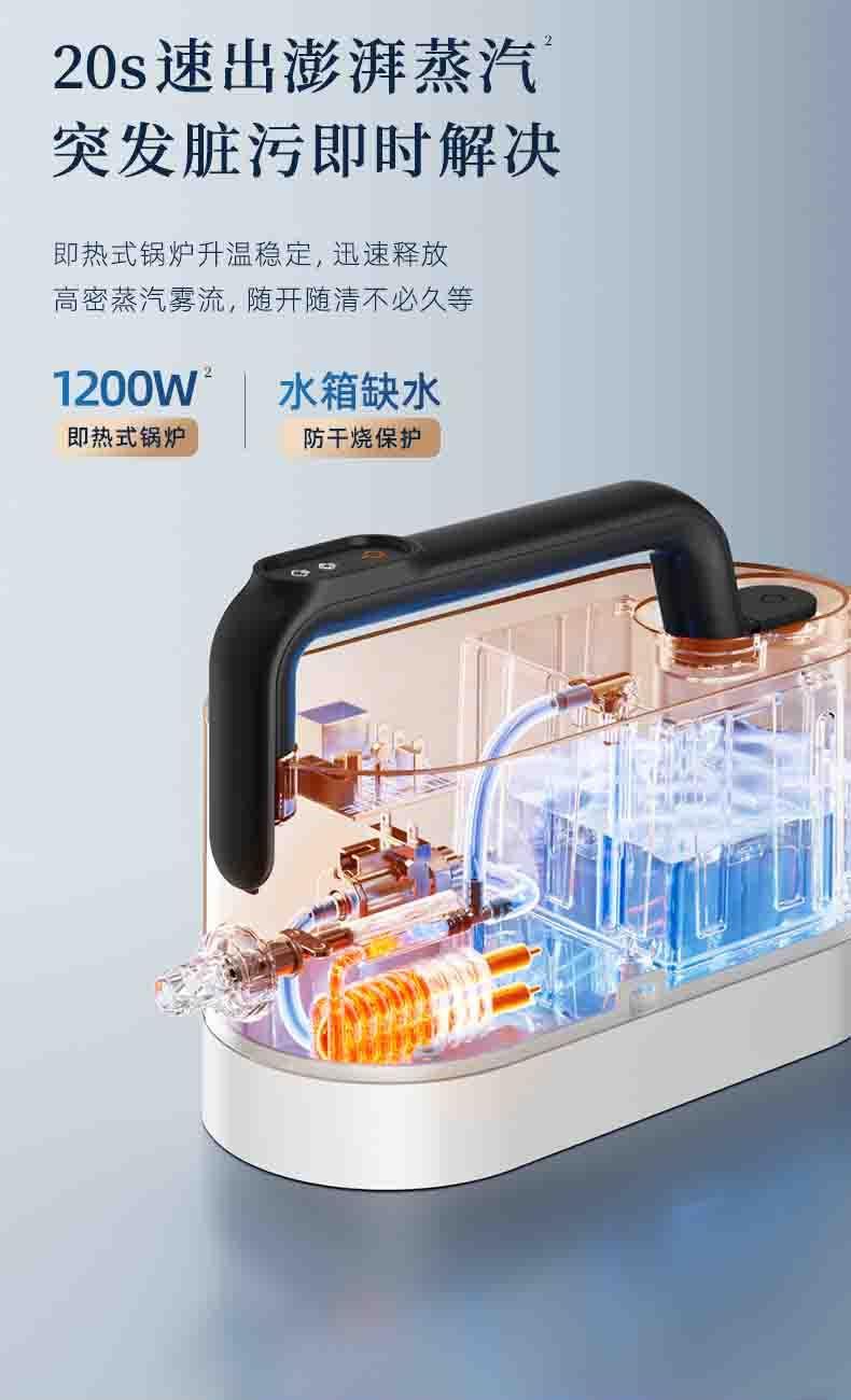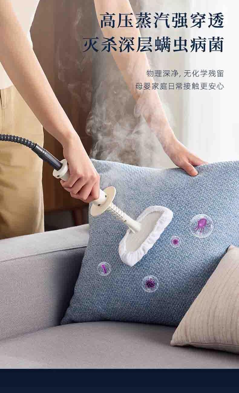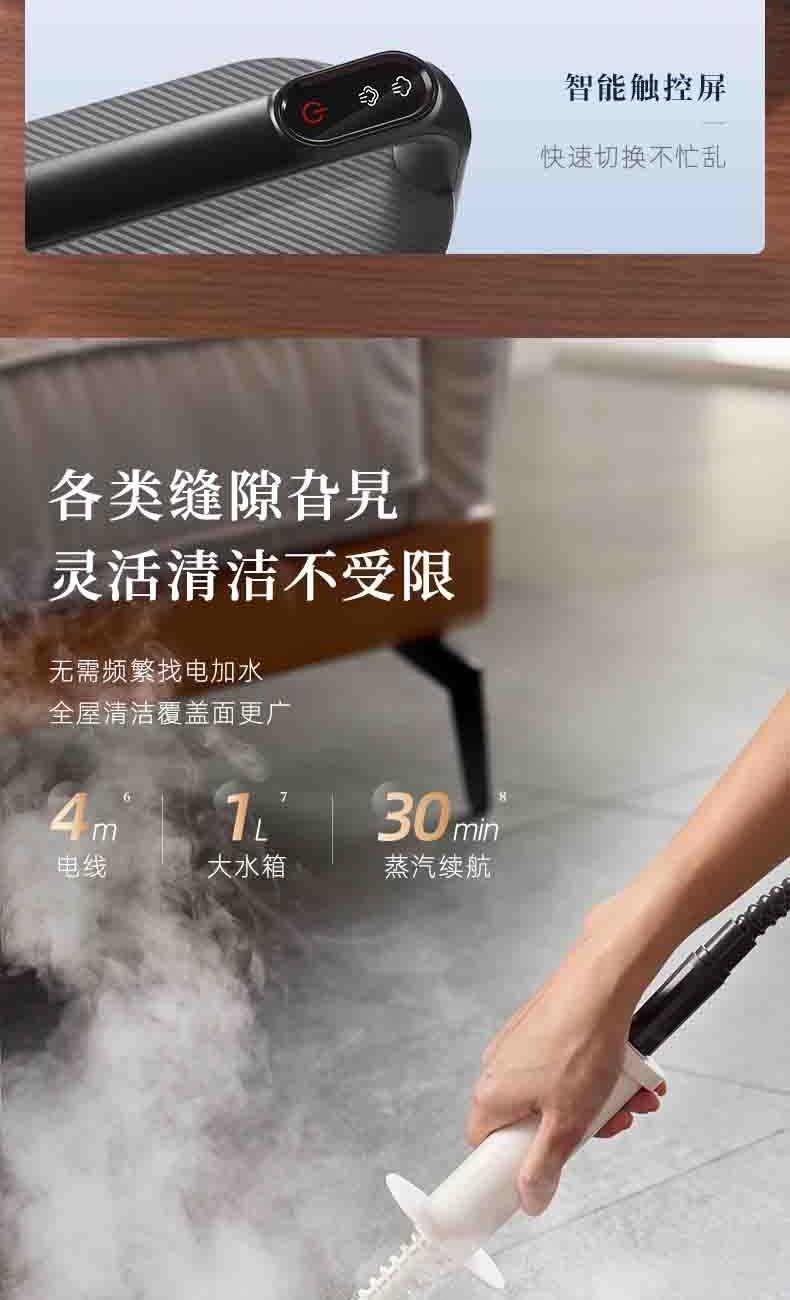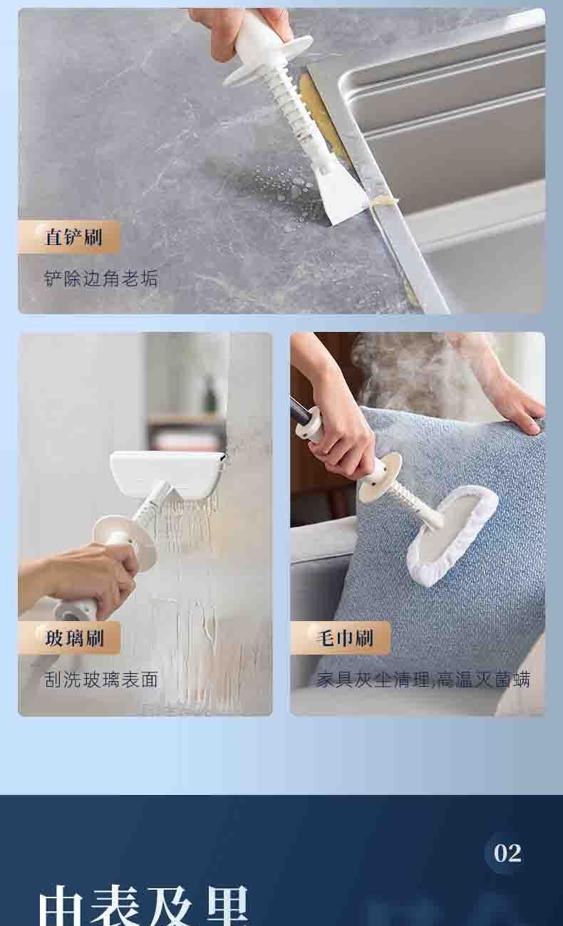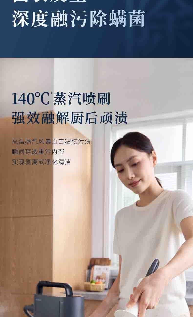 20秒140℃蒸汽3bar高压直喷,纯物理高效融污,除螨菌无残留 澎湃大流量,持续高压渗透,从源头瓦解陈年污渍 1+7喷刷组件,精 准触达全屋清洁死角 4米电源线+1.3米延长软管覆盖每个角落