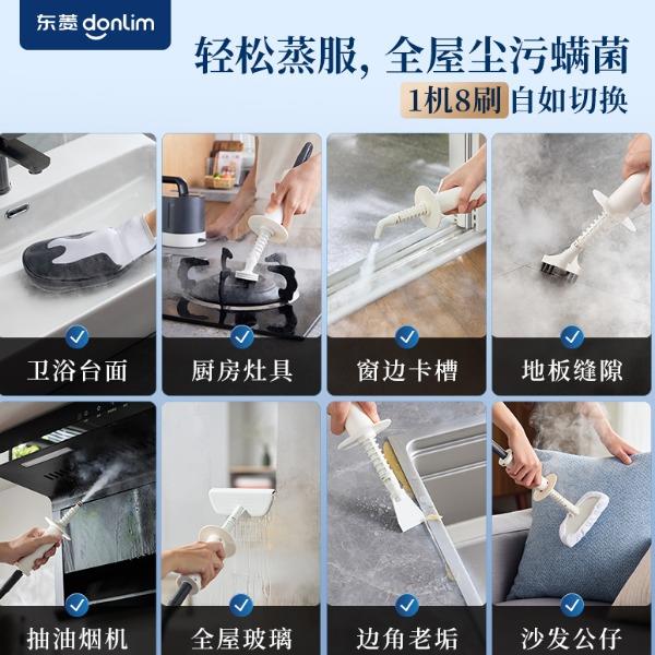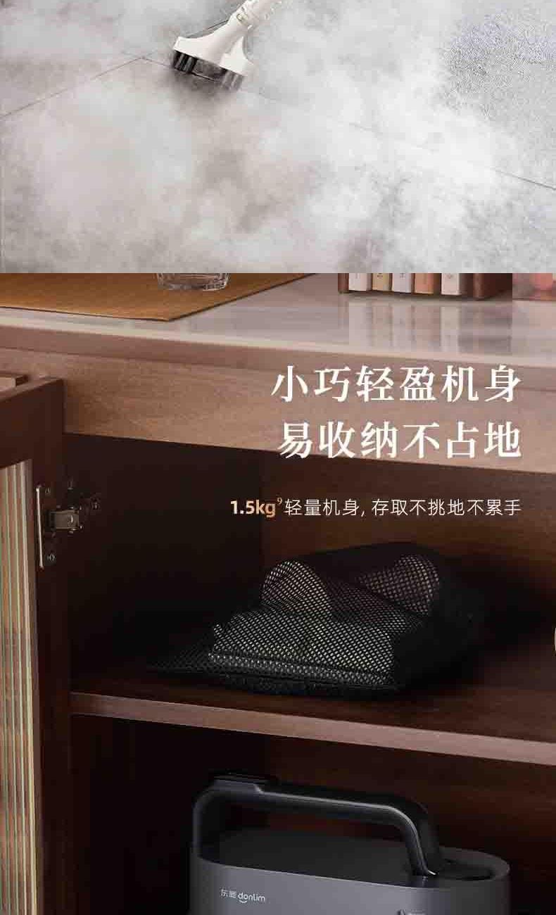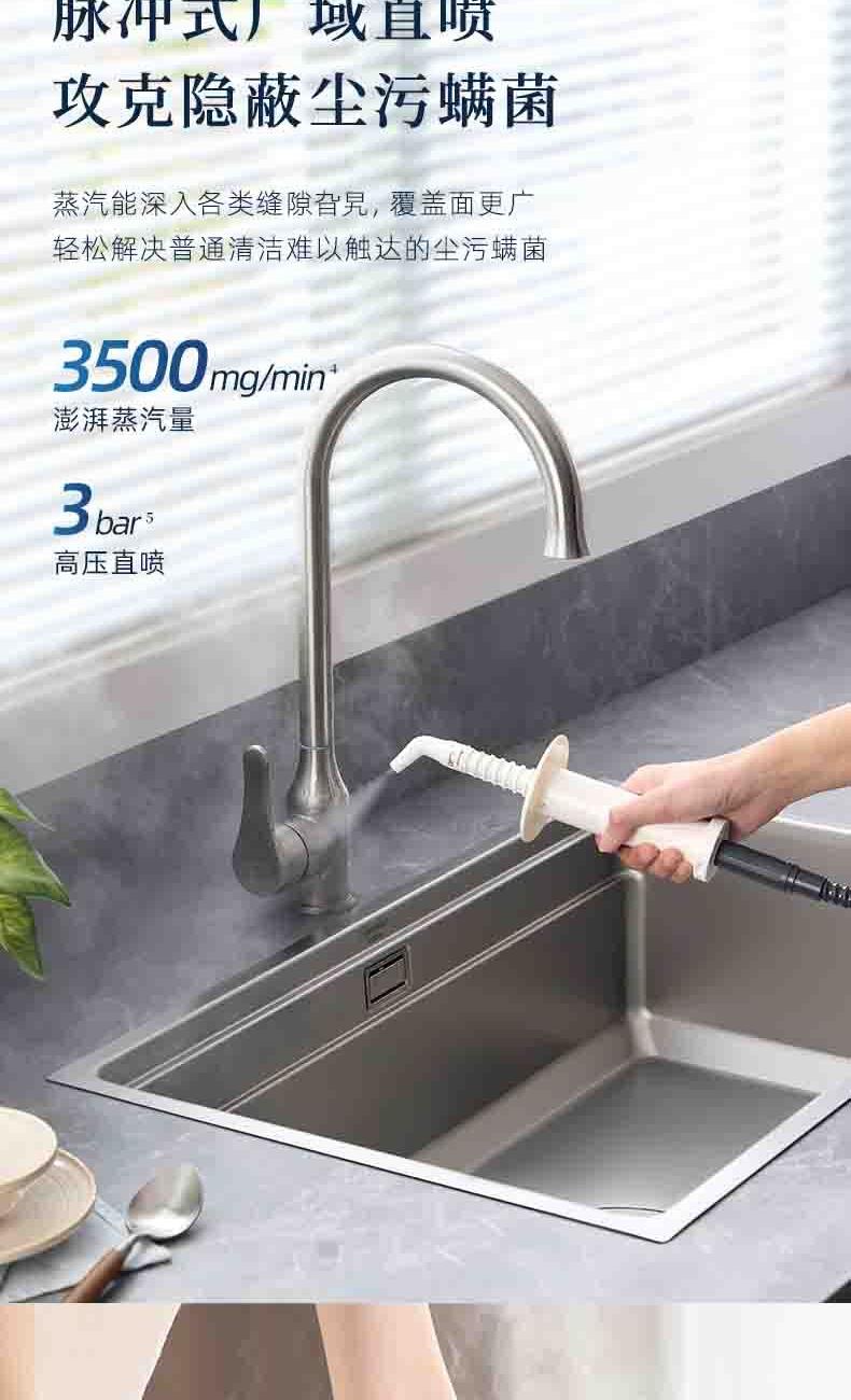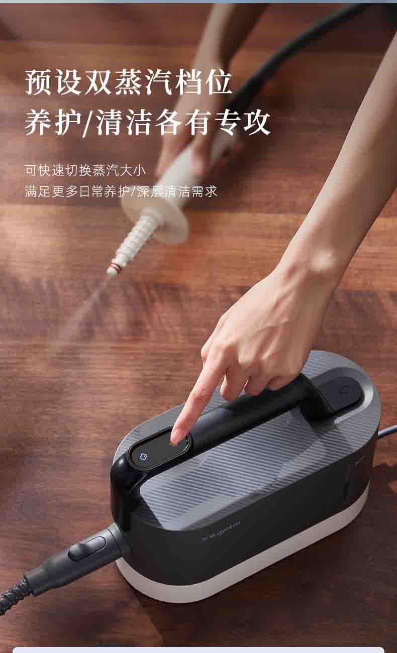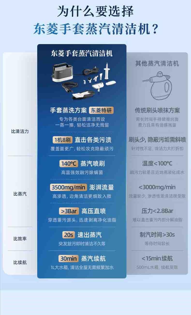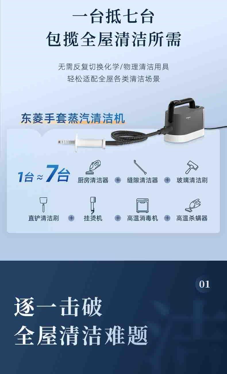 20秒140℃蒸汽3bar高压直喷,纯物理高效融污,除螨菌无残留 澎湃大流量,持续高压渗透,从源头瓦解陈年污渍 1+7喷刷组件,精 准触达全屋清洁死角 4米电源线+1.3米延长软管覆盖每个角落