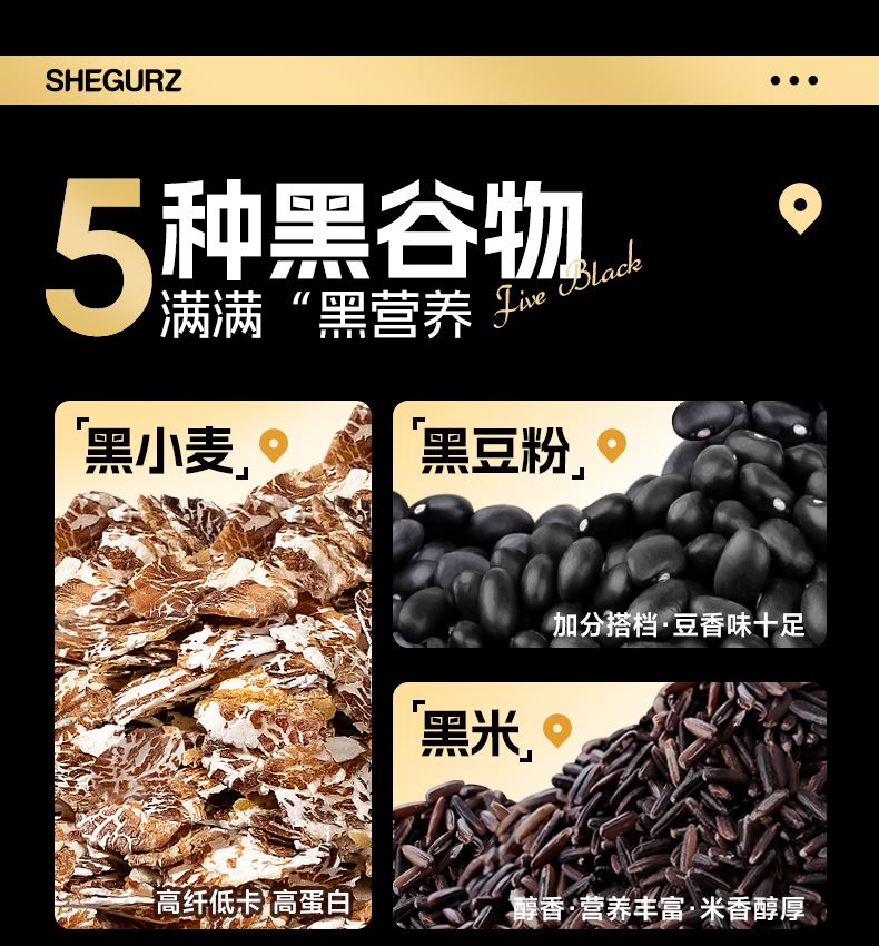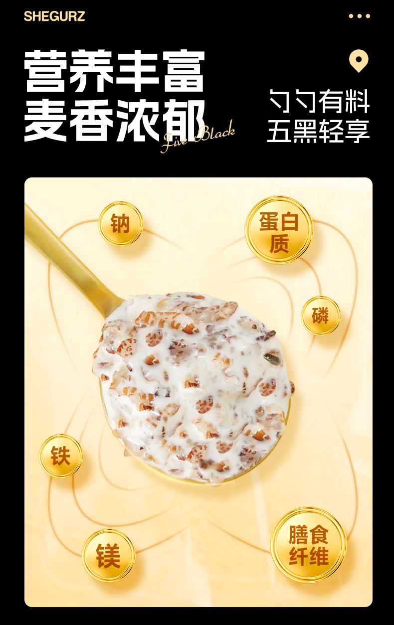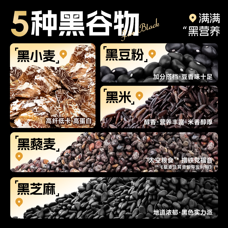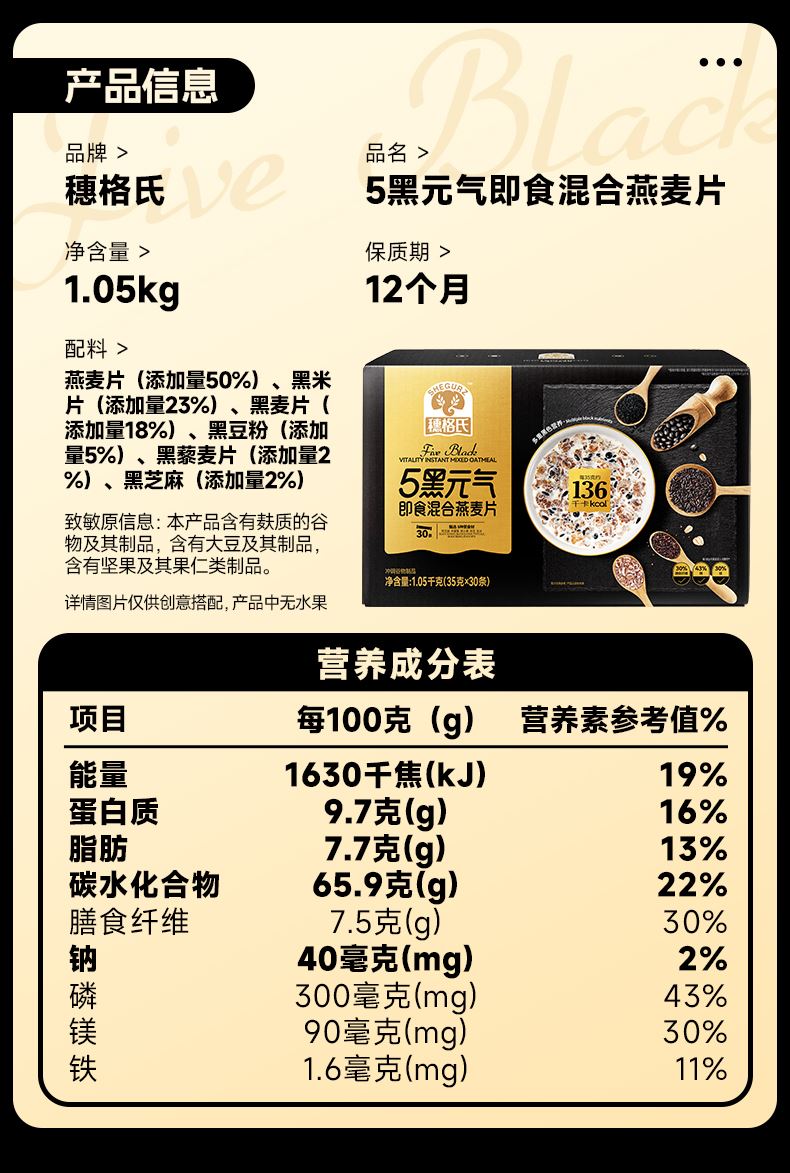 穗格氏5黑混合燕麦片880g袋装 配料表:燕麦片、黑米片、黑麦片、黑豆粉、黑藜麦片、黑芝麻。 1,食养原料: 黑小麦-高纤低卡高蛋白 黑米-营养丰富 米香醇厚 黑芝麻-地道浓郁 黑色实力派 黑藜麦-“太空粮食”撸铁党福音 黑豆粉-加分搭档 豆香味十足 2,澳洲进口全燕麦,保留麸皮、胚芽、胚乳的多种营养; 3,本产品富含膳食纤维,代餐甄选。 4,适合多种人群,父母长辈,学生党,上班族。