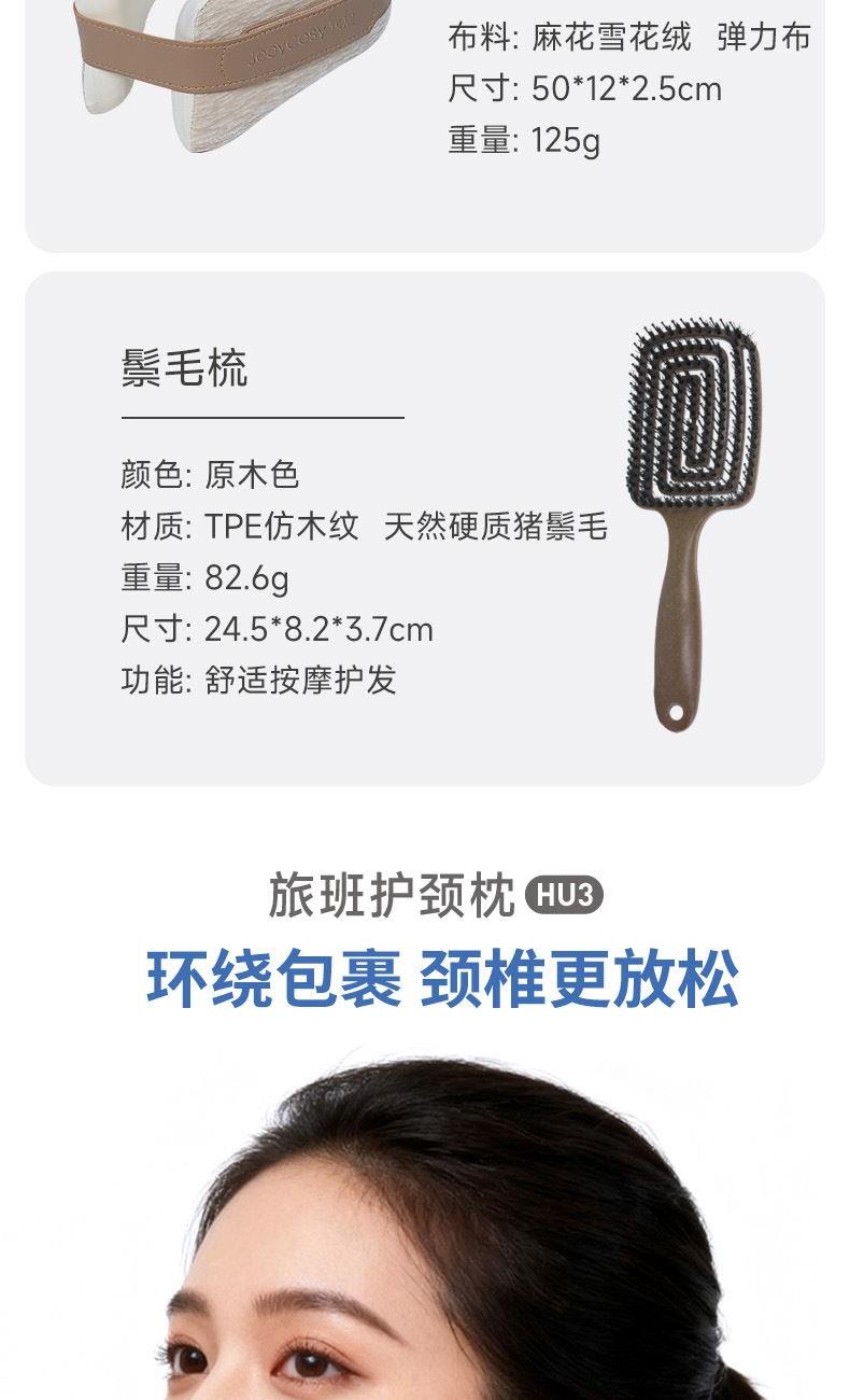 组盒配置:旅班护颈枕*1 木纹梳*1 彩盒尺寸:36*26*7.5cm 标准箱尺寸:52.5*41*39cm 条形码:6952679802017 旅班护颈枕 型号: HU3/米色 枕芯: 高弹海绵 布料: 麻花雪花绒 弹力布 尺寸: 50*12*2.5cm 重量: 125g 木纹梳: 颜色: 原木色 材质: 天然硬质猪鬃毛 重量: 0.1kg 产品尺寸: 8*24*4cm