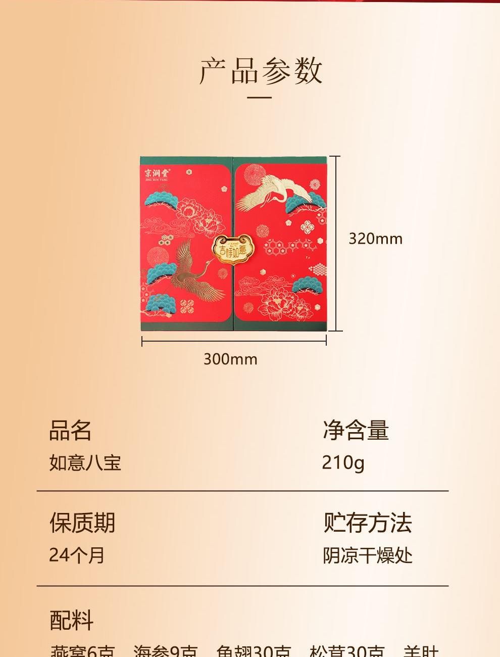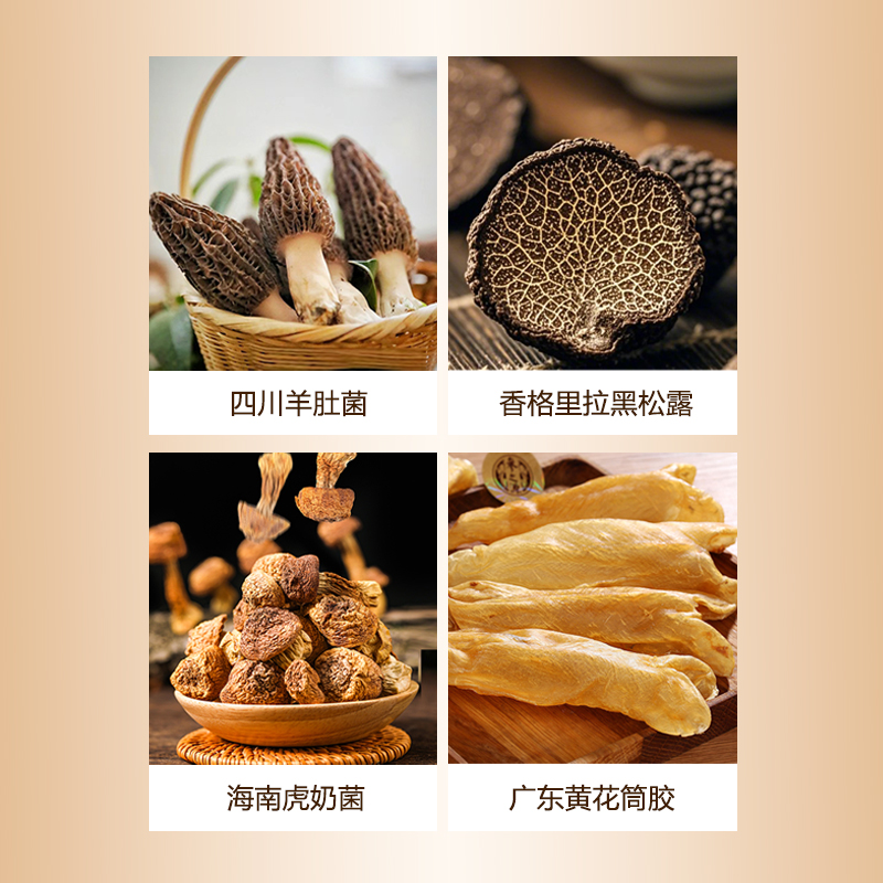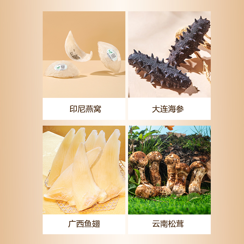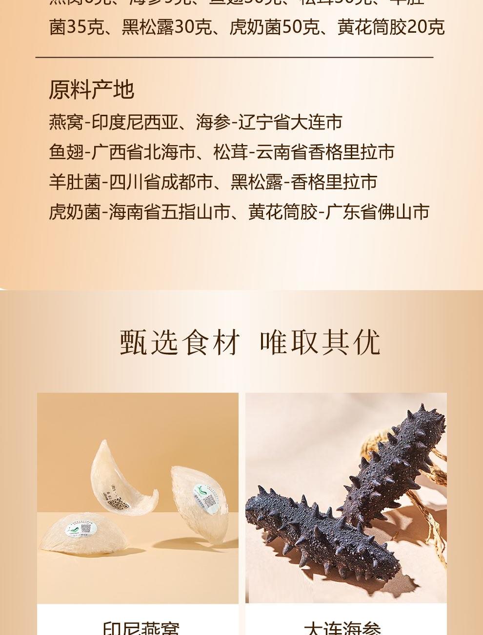 规格:燕窝6克、海参6支、鱼翅30克、松茸30克、羊肚菌35克、黑松露30克、虎奶菌50克、黄花筒胶20克 卖点: ✅ 珍贵食材 精挑细选 ✅ 传统滋补 现代工艺 ✅ 高贵礼赠 彰显品味 ✅ 四季养生 倍添活力 一份礼盒,八重滋养,百分诚意🎉