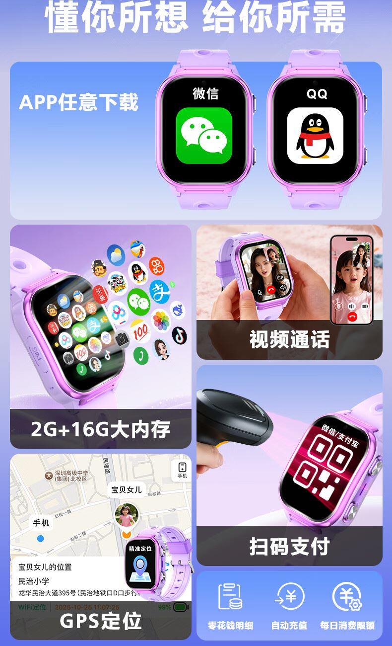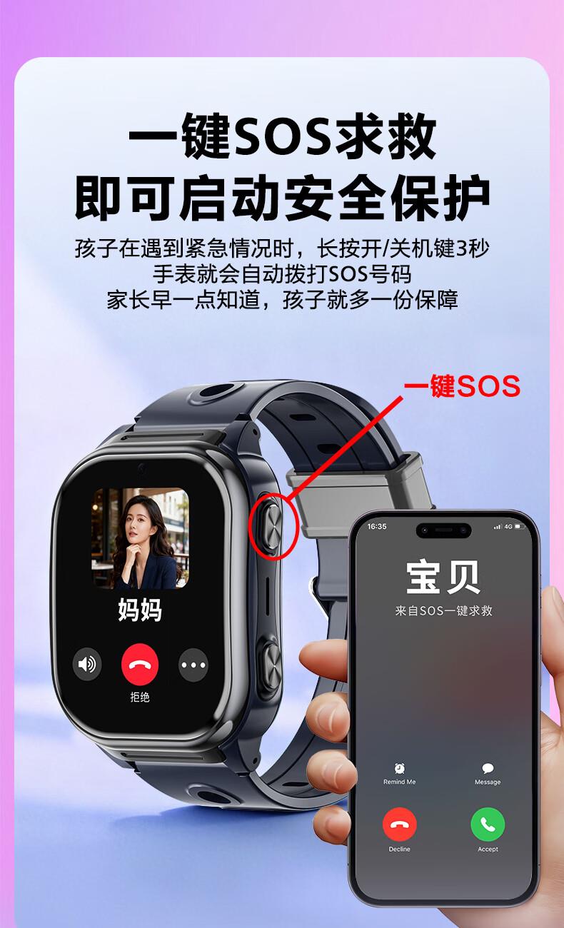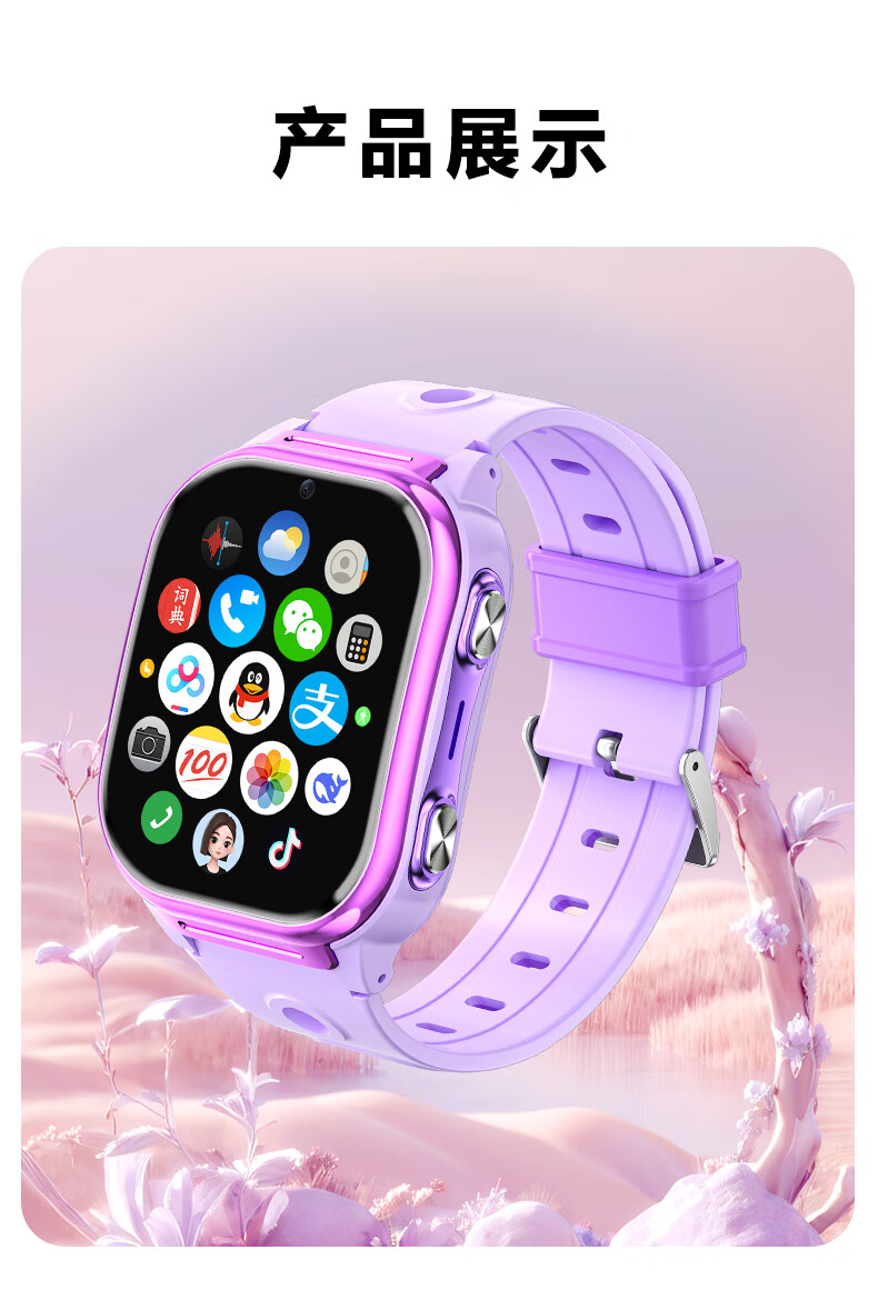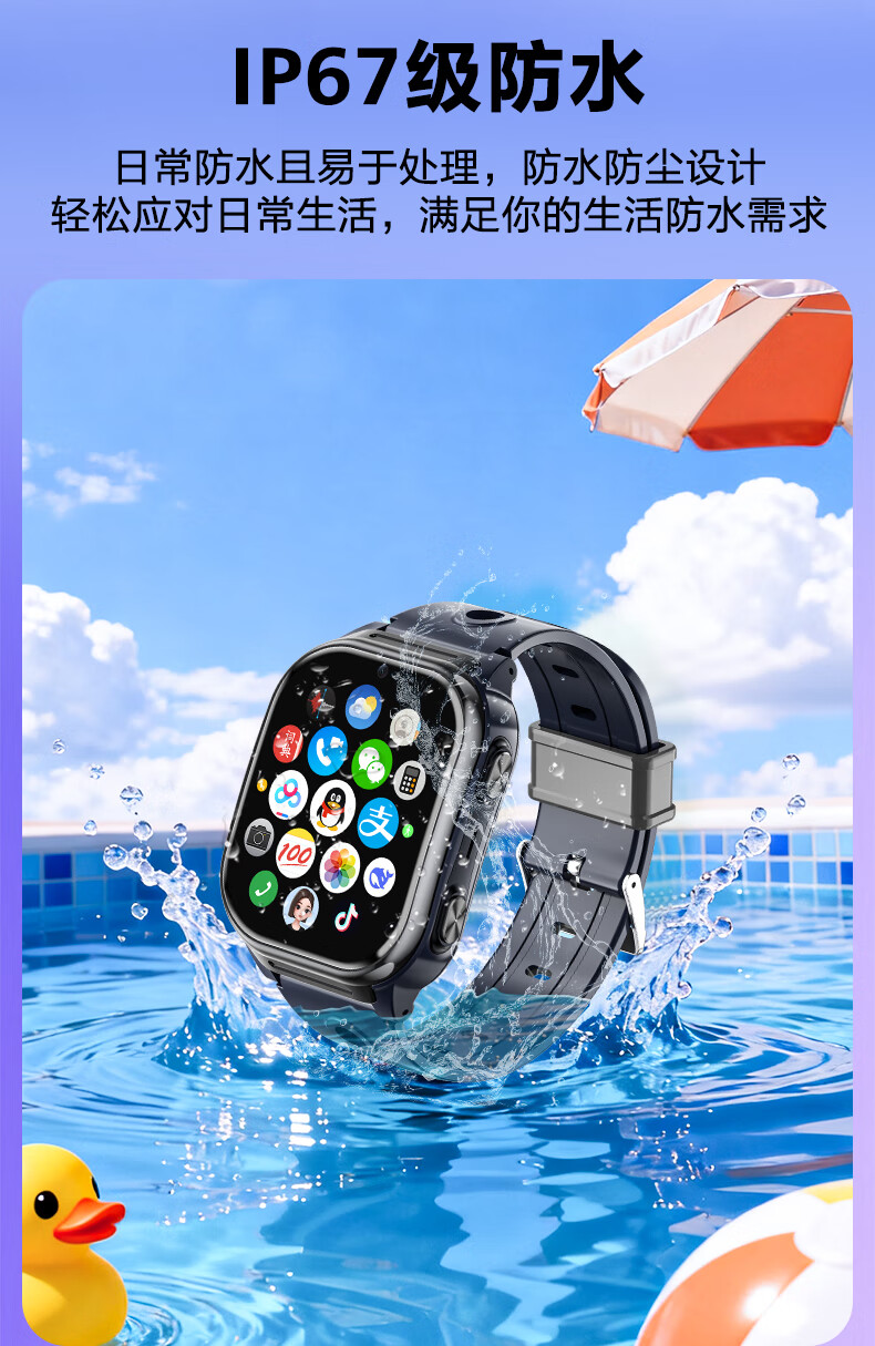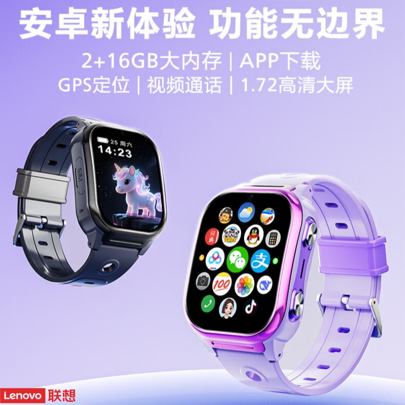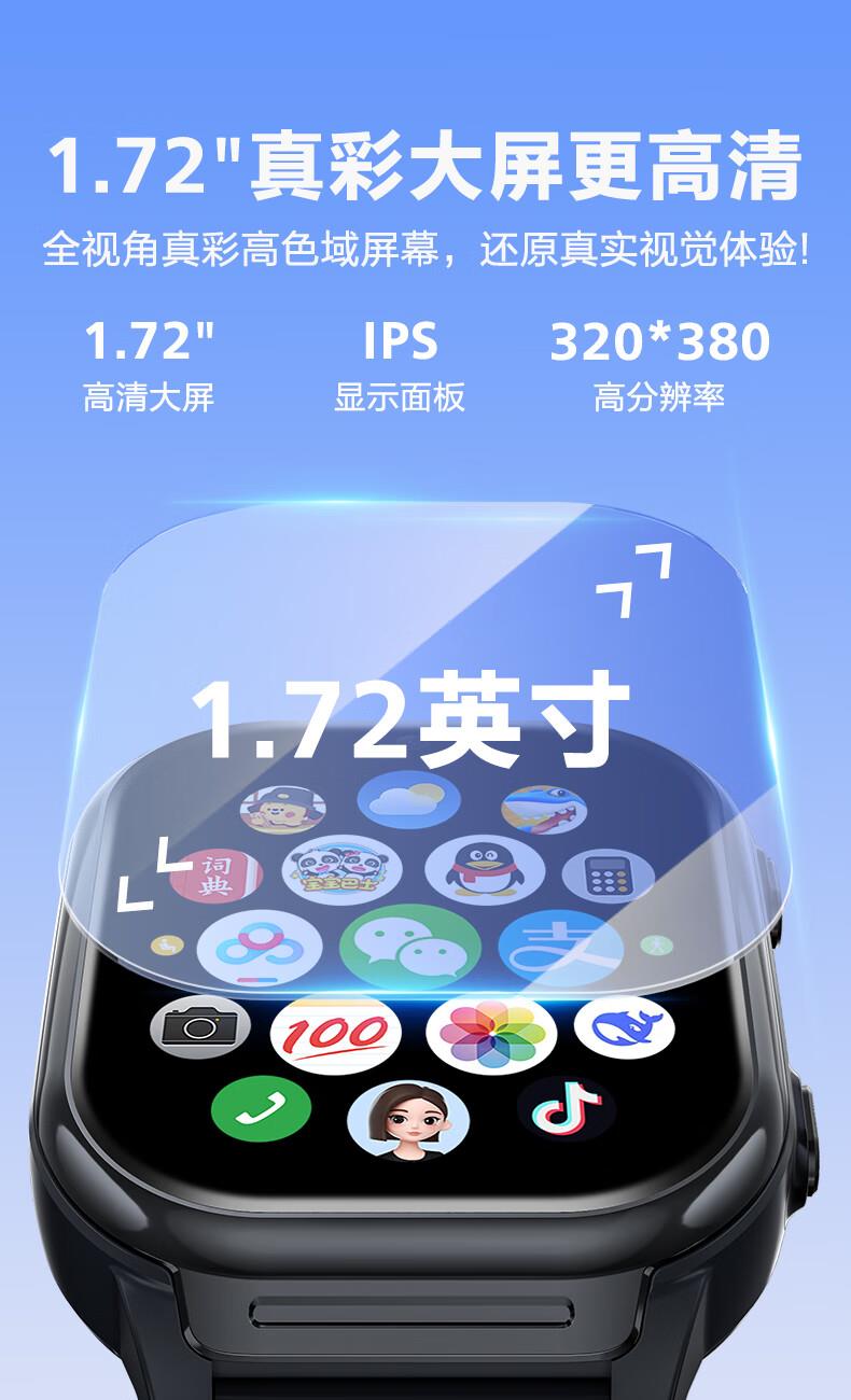 屏幕尺寸:1.72英寸IPS 320*380 使用时间:1-3天 充电方式:磁吸充电 电池容量:800mAh APP:联享守护 防水等级:IP67 像素:前置摄像头8万像素 内存:2+16G 产品清单:手表+充电线+说明书+包装盒 2G+16G大内存,旗舰安卓系统,软件随心下,海量学习内容,流畅使用,自由装卸,微信/支付宝双向支付,微信/QQ/儿童版微信交友聊天,上课禁用,AI探索(小度),智享童年,AI智能定位(支持GPS++WIFI+LBS等定位);喝水提醒,就做提醒,时制切换,课程表,手表相册,自定义屏保,应用商店,好友名片,拒接陌生来电,代收手表短信,终端WIFI,S0S/亲情号码、4G视频通话;