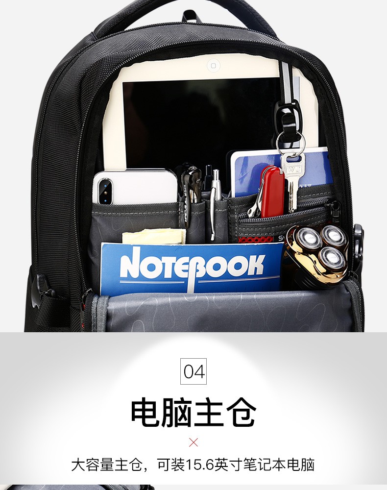 型 号:88042 大号 尺 寸:470*330*200(MM)大号 材 质:织物 颜 色:黑色 重 量:0.925kg 2.采用优质涤纶材料 防泼水; 3.超大容量设计可放15寸电脑; 4.外置USB接口可直接连接手机充电; 5.主袋内加厚电脑隔层; 6.弹力蜂窝背板、透气、缓压、减震