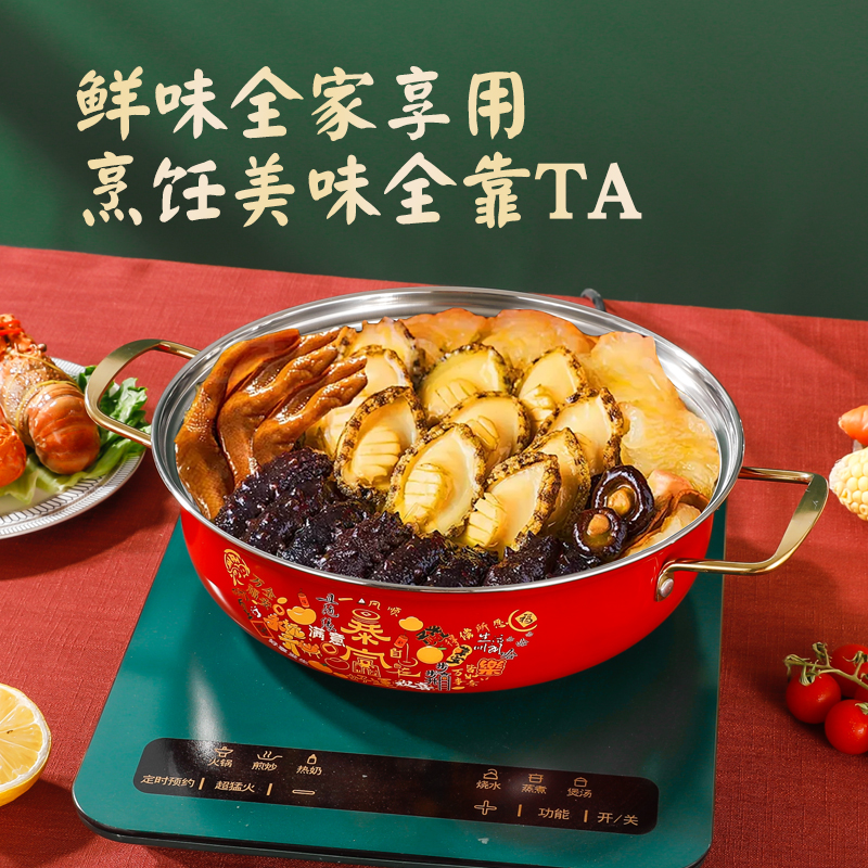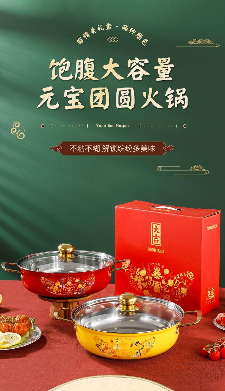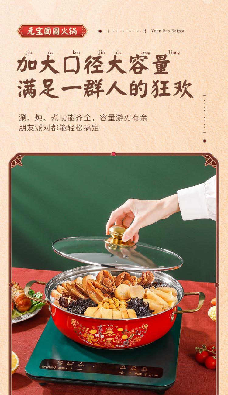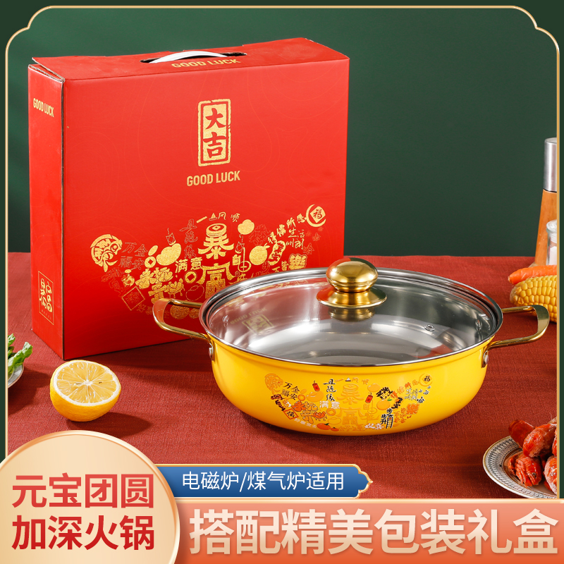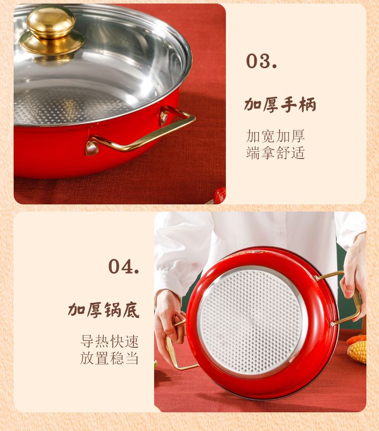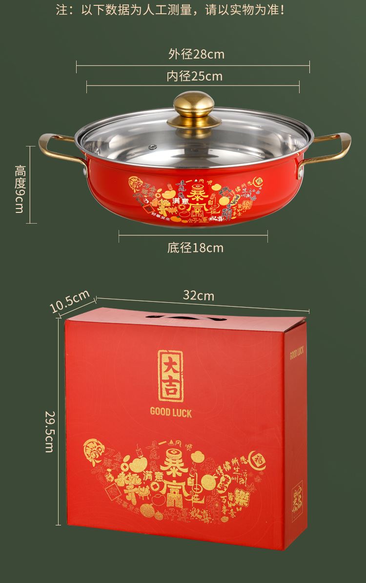 产品规格:28cm 产品材质:410不锈钢 包装方式:opp透明袋+手提彩盒 彩盒尺寸:32*10*29CM 外箱尺寸: 65*64*59.5 cm 送礼就送暴富火锅,有新意,锅暖人心, 礼品赠送,活动礼品、员工福利、商务馈赠都是不错的选择。 加厚加深,快速导热,。 品尝百味,为家人煲一碗营养汤。 小聚热闹食光,有说有笑有美食。 大容量一锅满足家庭所需搭配精美中国风礼盒。 鱼鳞底不粘锅,快速导热,不挑炉具,涮火锅等。 温馨提示:为了保持锅身美观不建议明火使用