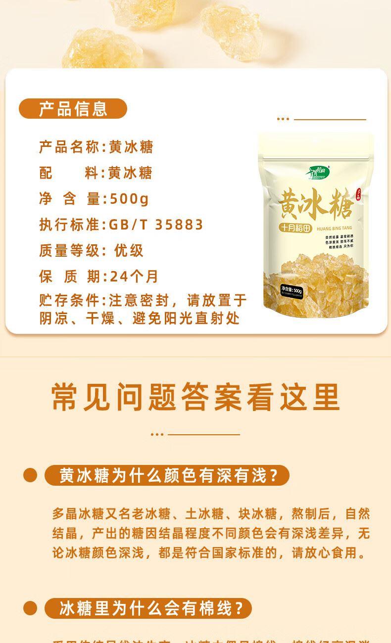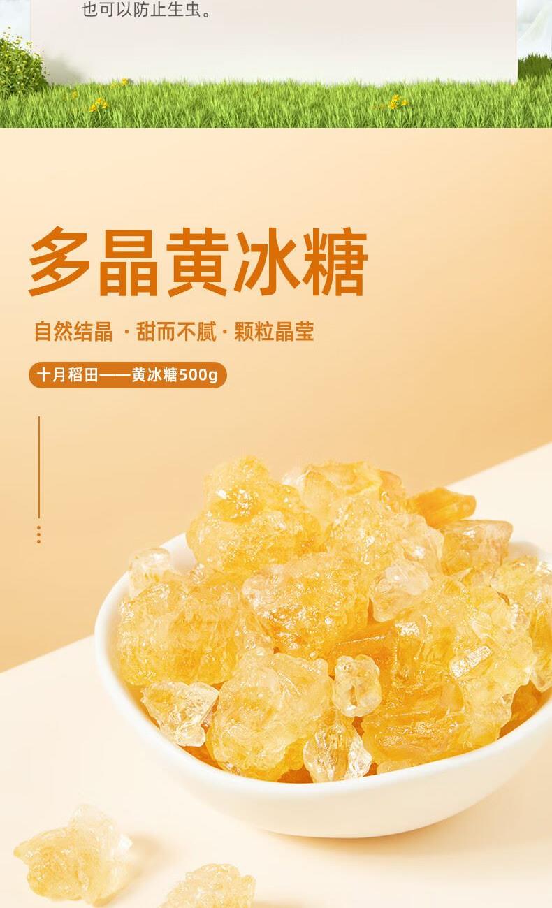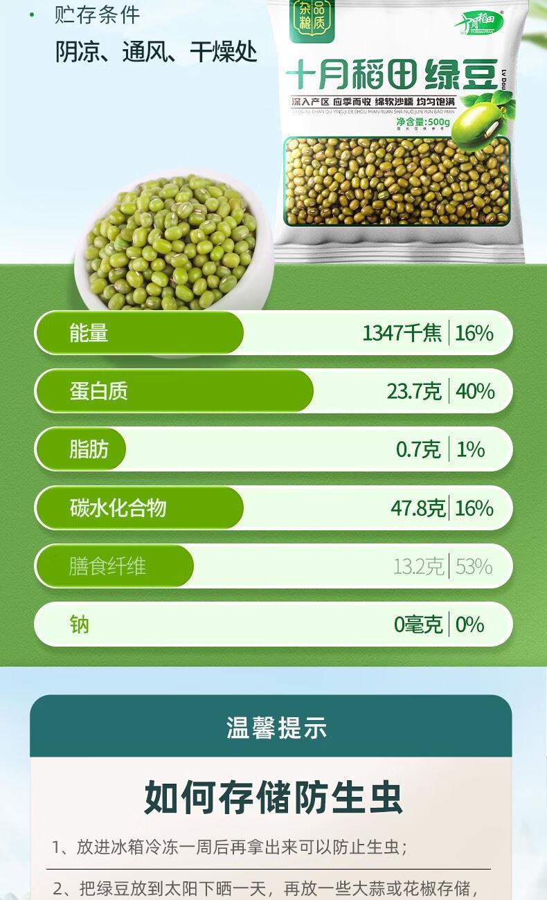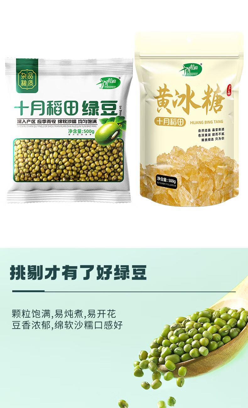 商品:十月稻田 绿豆冰糖清凉组合1kg 规格:1kg (绿豆500g+黄冰糖500g) 税率:冰糖13%,绿豆9% 不发货区域:新疆、西藏等偏远地区 特点:绿豆颗粒饱满、易炖煮、易开花、豆香浓郁、绵软沙糯口感好,多晶黄冰糖自然结晶、甜而不腻、颗粒晶莹