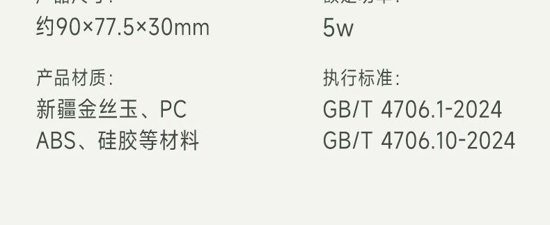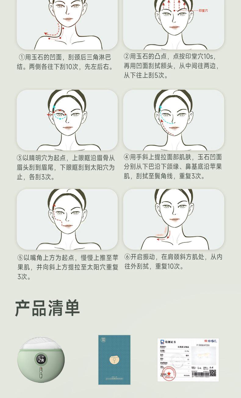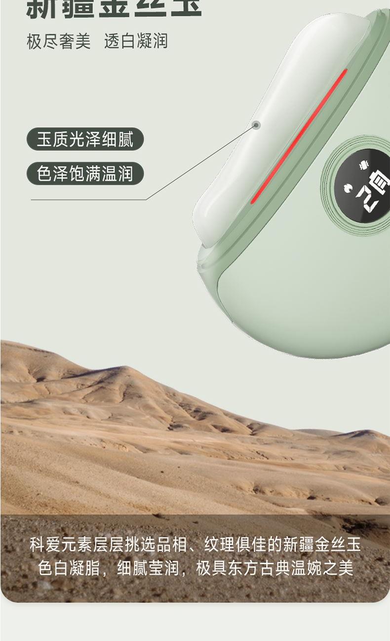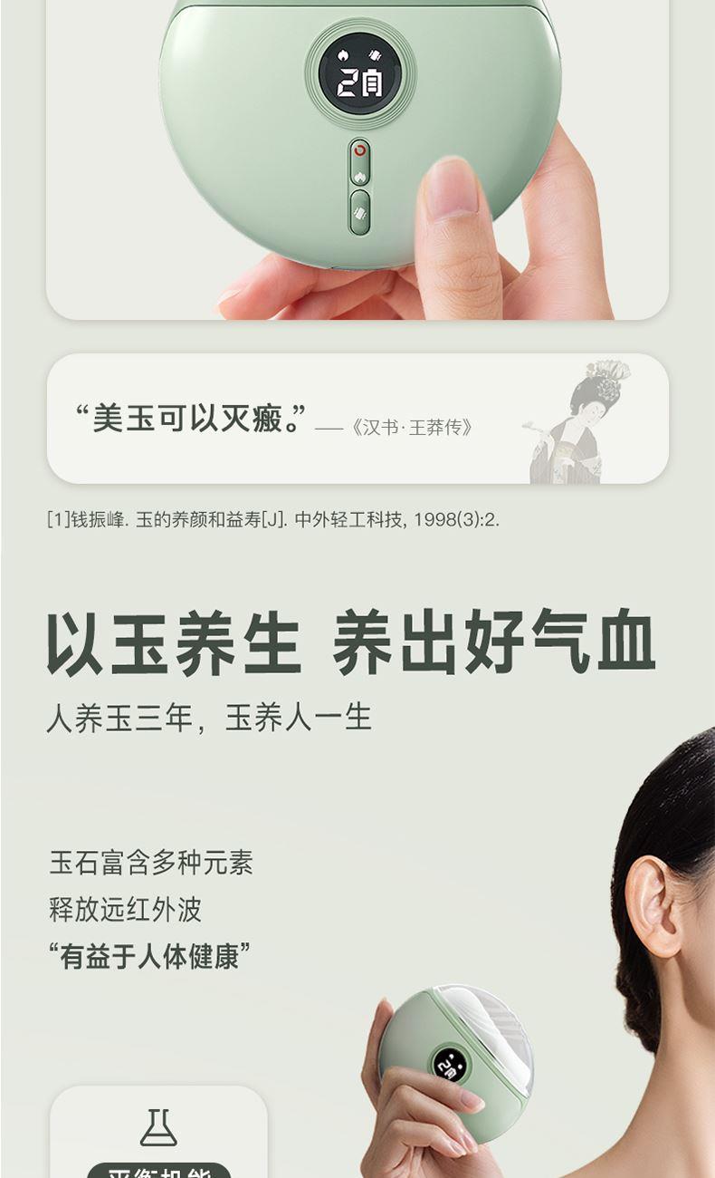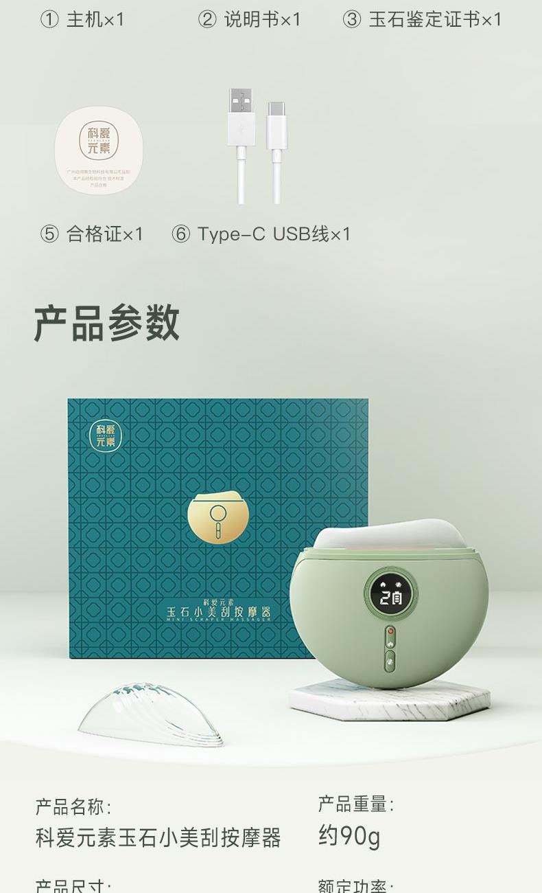 产品尺寸:约90*77.5*30mm 产品重量:约90g 额定功率:5w 产品材质:新疆金丝玉、PC、ABS、硅胶等材料 产品清单:主机*1台,说明书*1本,合格证*1张,TYPE-C USB线*1条 产品功能:金丝玉材质,富含多种有益等元素,8-15微米远红外波;3档热敷+红光+震动,调节经络气血;山型设计,玉石刮板,贴合眼部、脸部等部位;无线设计,长续航大电池,充一次用一周