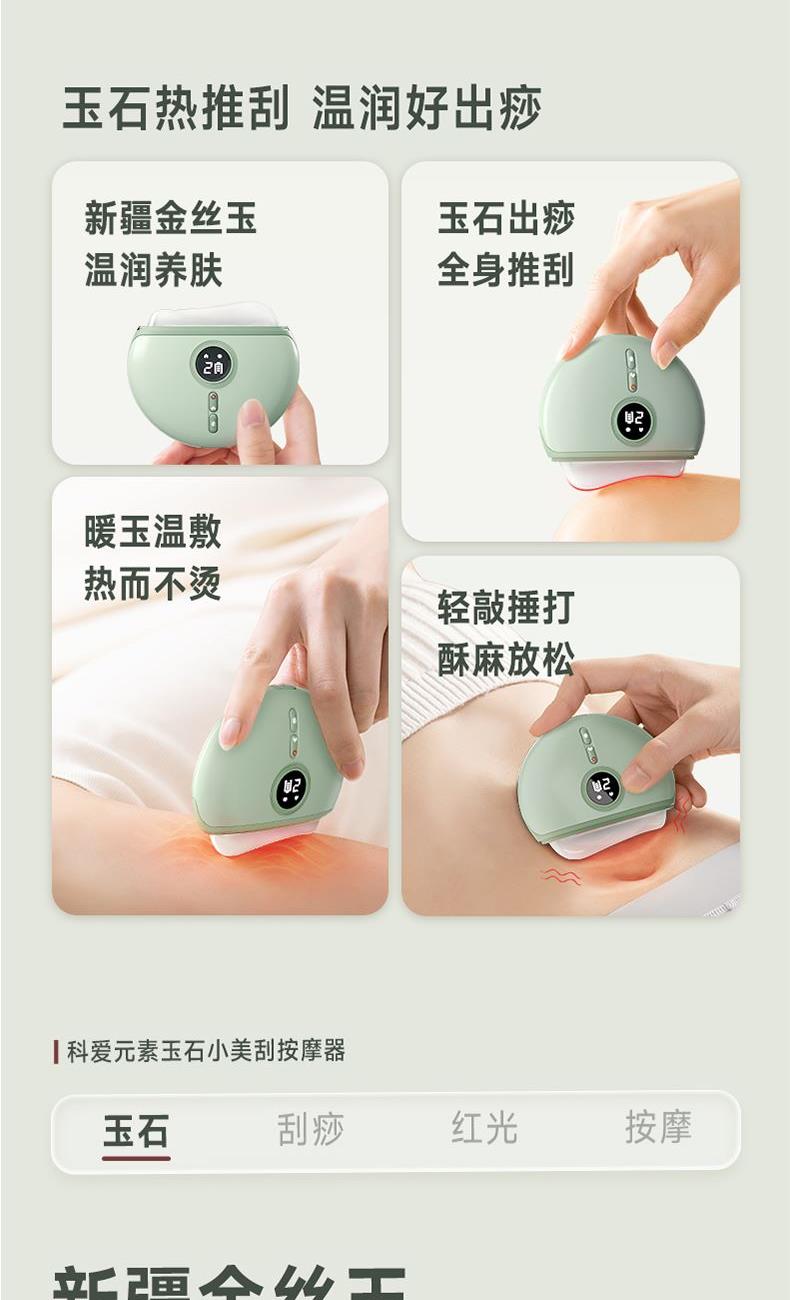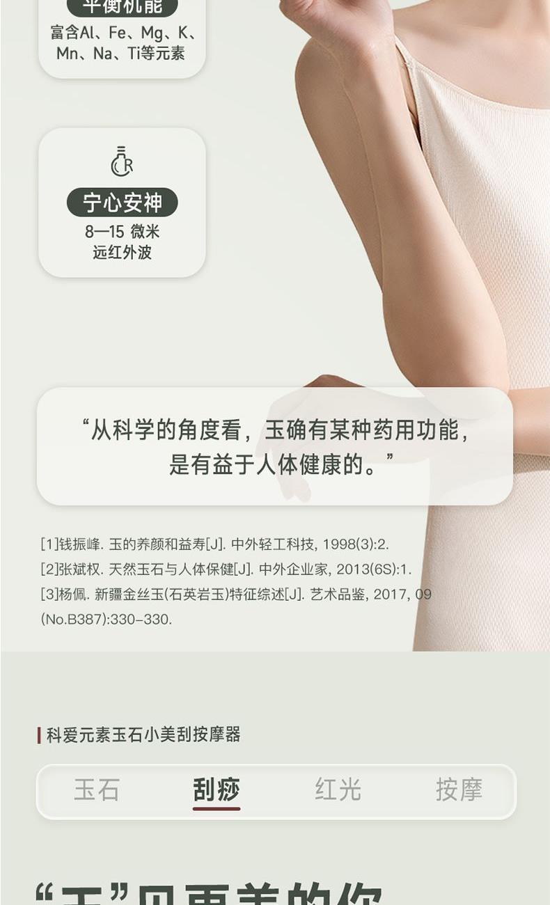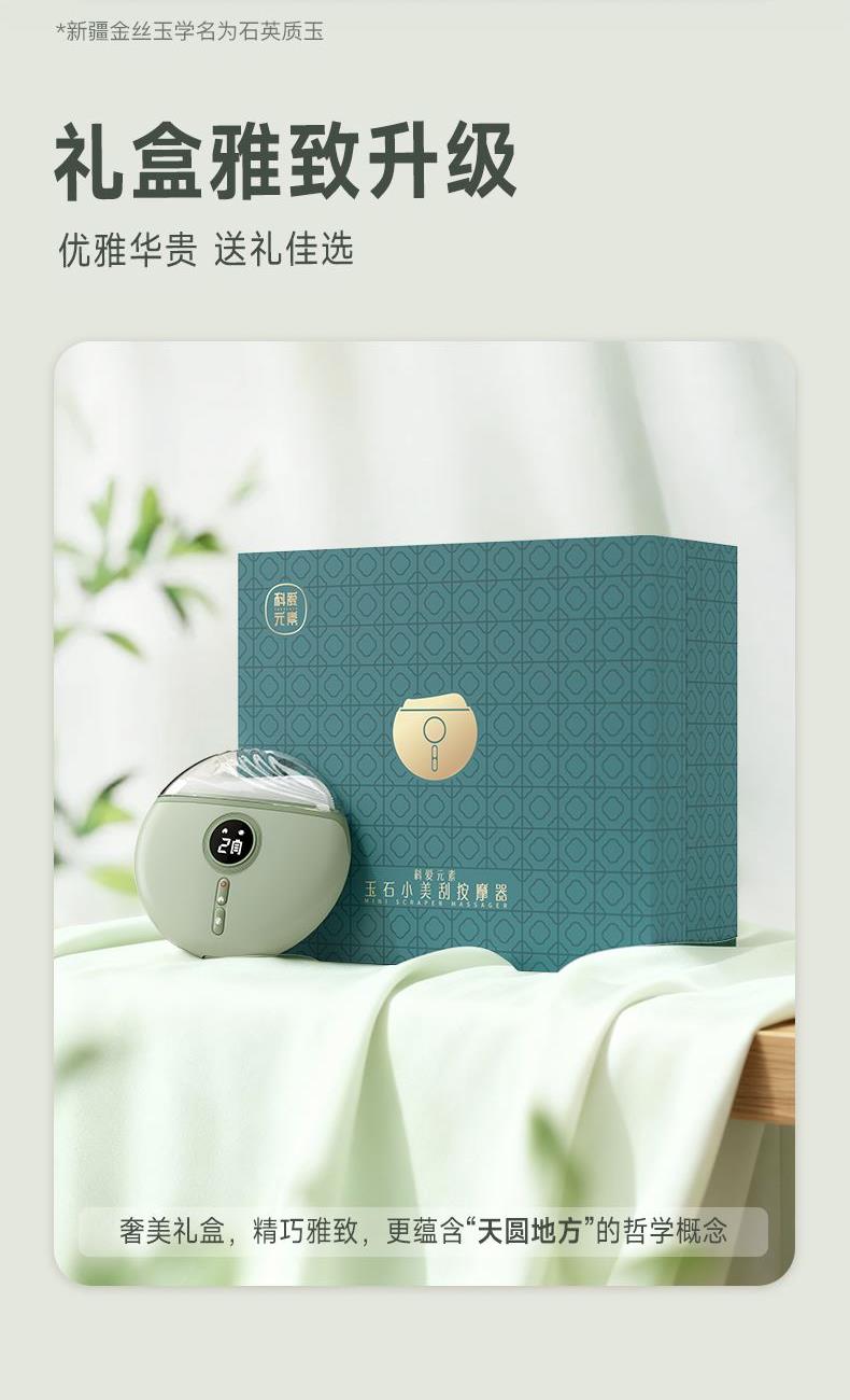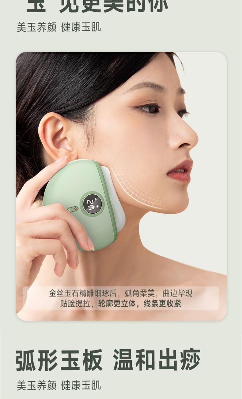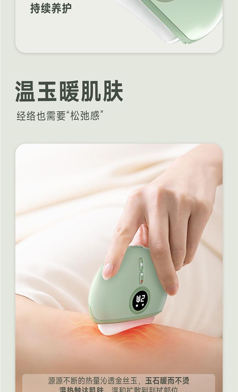 产品尺寸:约90*77.5*30mm 产品重量:约90g 额定功率:5w 产品材质:新疆金丝玉、PC、ABS、硅胶等材料 产品清单:主机*1台,说明书*1本,合格证*1张,TYPE-C USB线*1条 产品功能:金丝玉材质,富含多种有益等元素,8-15微米远红外波;3档热敷+红光+震动,调节经络气血;山型设计,玉石刮板,贴合眼部、脸部等部位;无线设计,长续航大电池,充一次用一周
