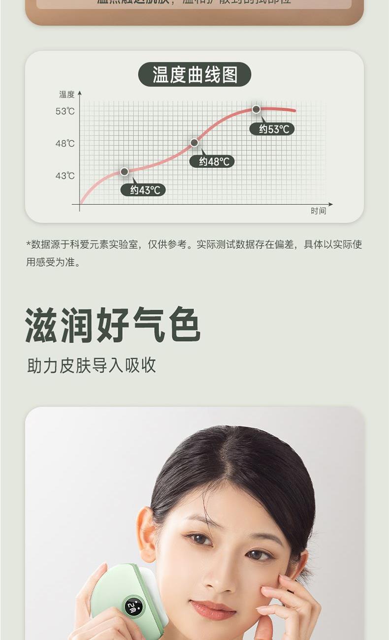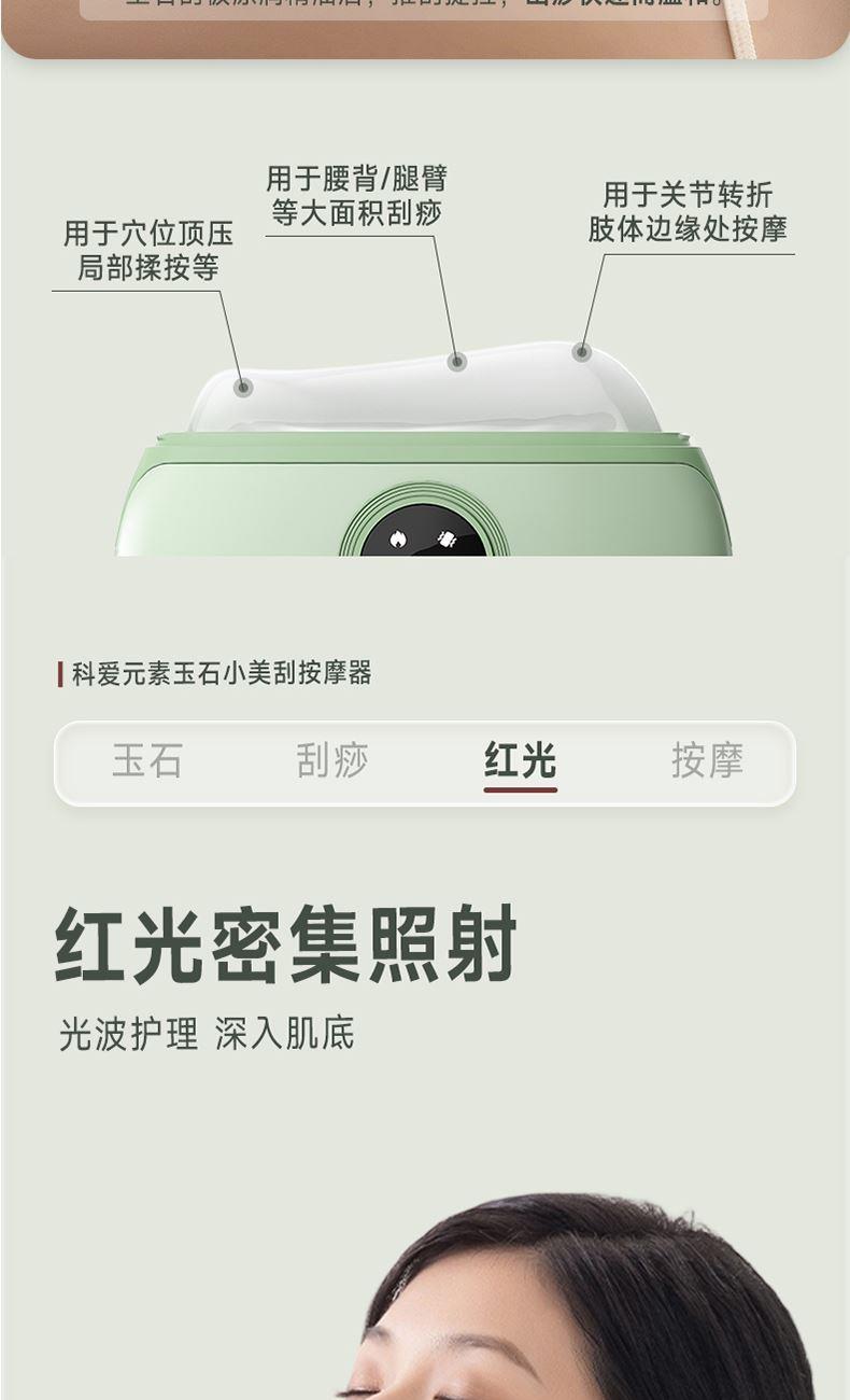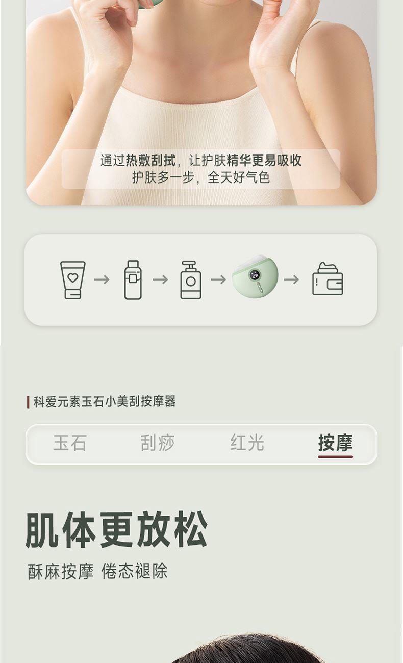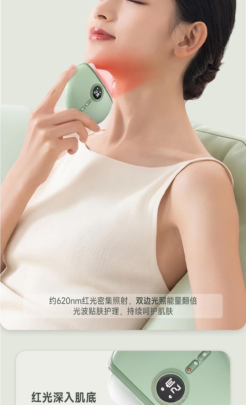 产品尺寸:约90*77.5*30mm 产品重量:约90g 额定功率:5w 产品材质:新疆金丝玉、PC、ABS、硅胶等材料 产品清单:主机*1台,说明书*1本,合格证*1张,TYPE-C USB线*1条 产品功能:金丝玉材质,富含多种有益等元素,8-15微米远红外波;3档热敷+红光+震动,调节经络气血;山型设计,玉石刮板,贴合眼部、脸部等部位;无线设计,长续航大电池,充一次用一周