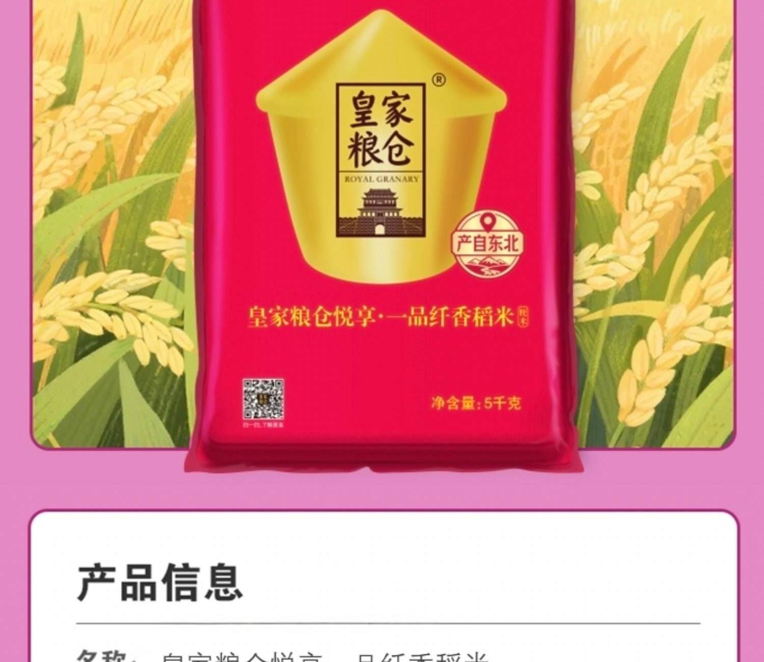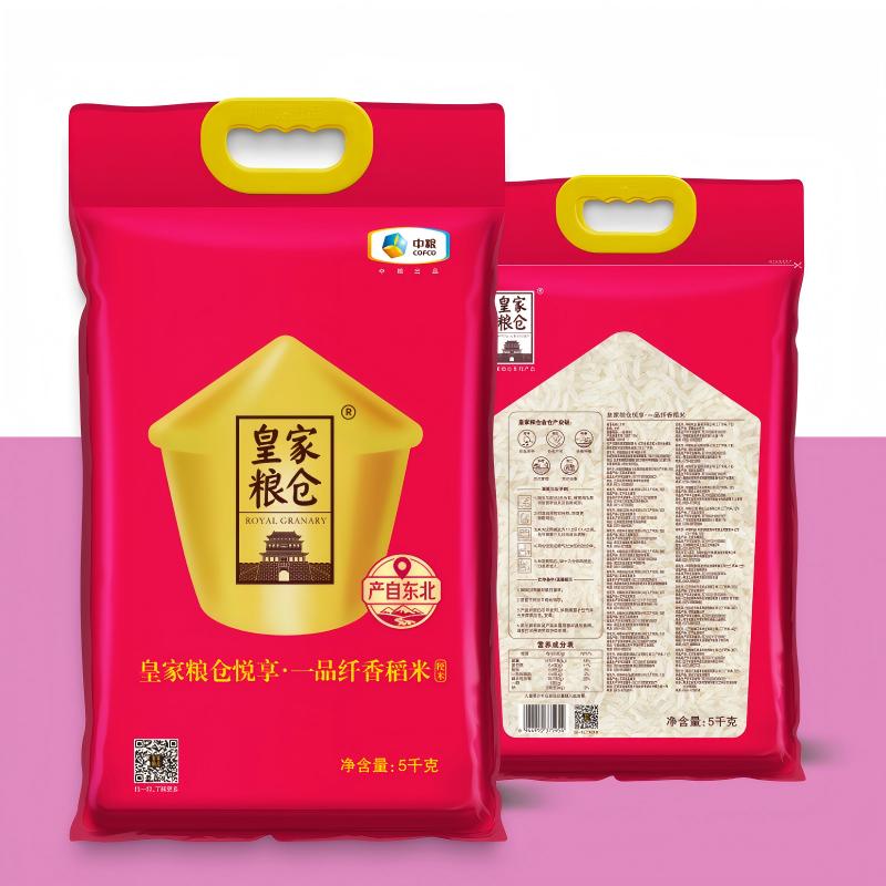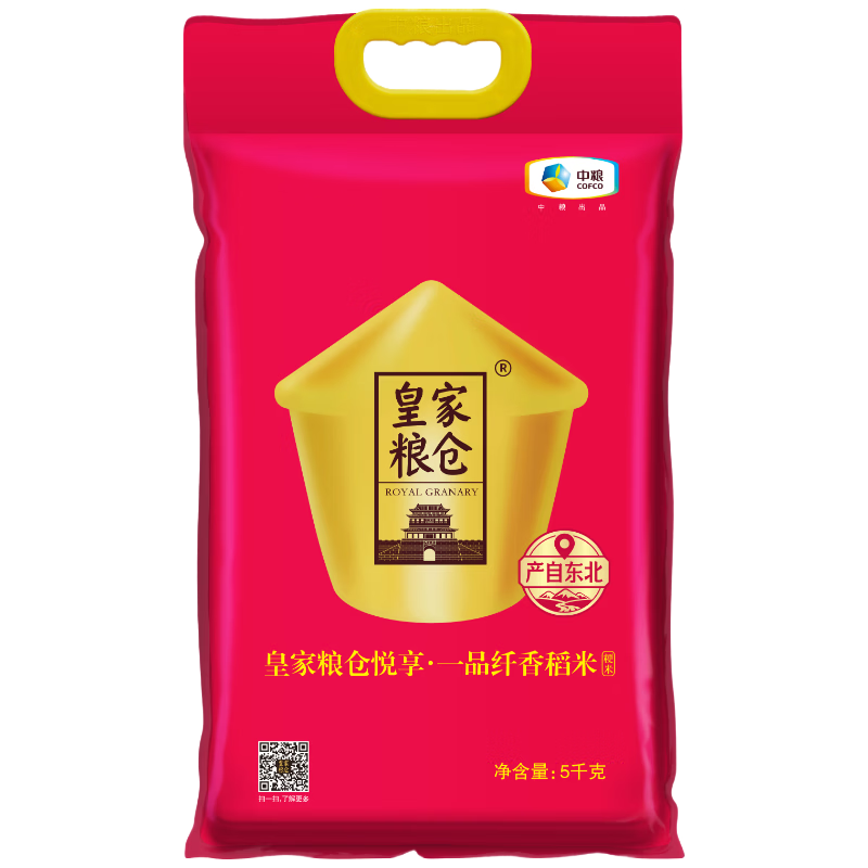 净含量:5kg 推荐理由: 中粮央企品质:皇家粮仓系列,一级粳米,全产业链品控,安全放心。 东北优质产区:源自东北寒地黑土,一年一季,米粒纤长饱满、晶莹剔透。 口感香糯 Q 弹:蒸煮米香浓郁,饭粒软糯有嚼劲,冷饭不回生,煮粥焖饭皆宜。 家庭实用装:5kg 真空袋装,锁鲜防潮,性价比高,自吃、福利、送礼都合适。