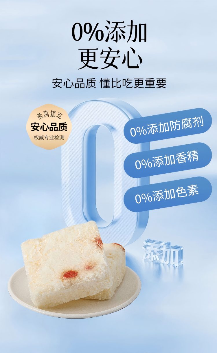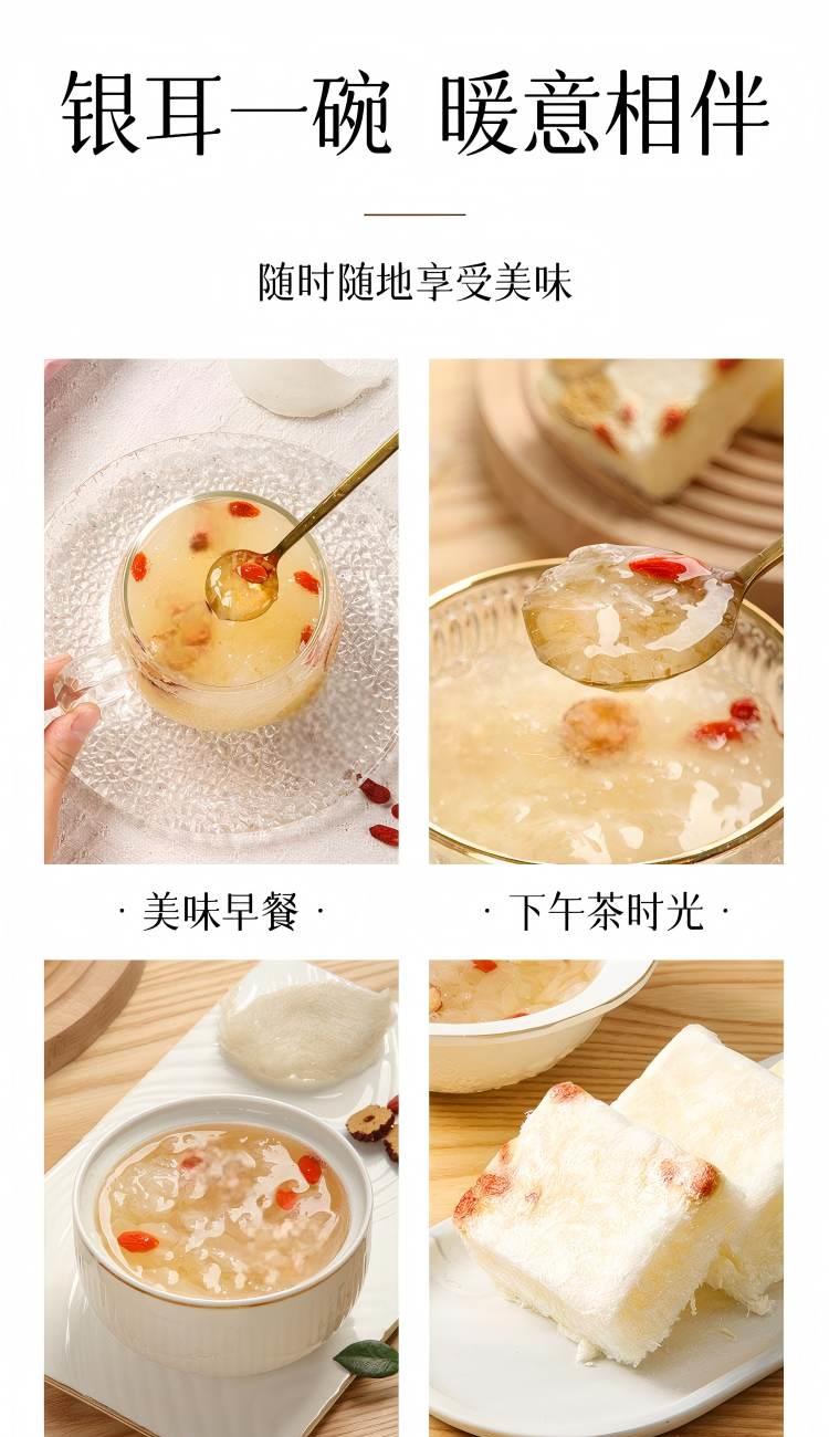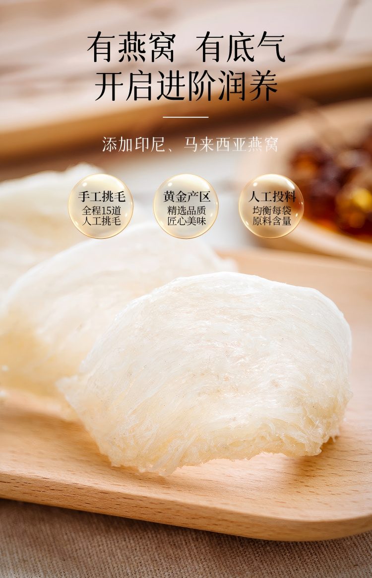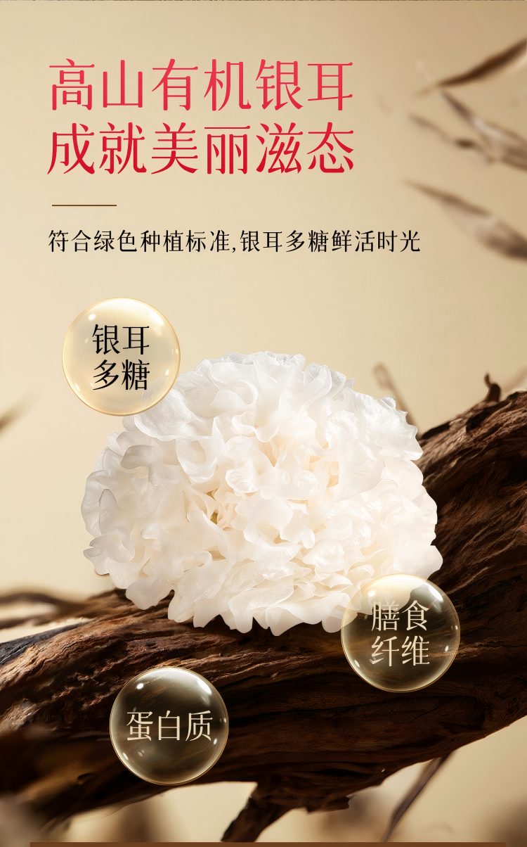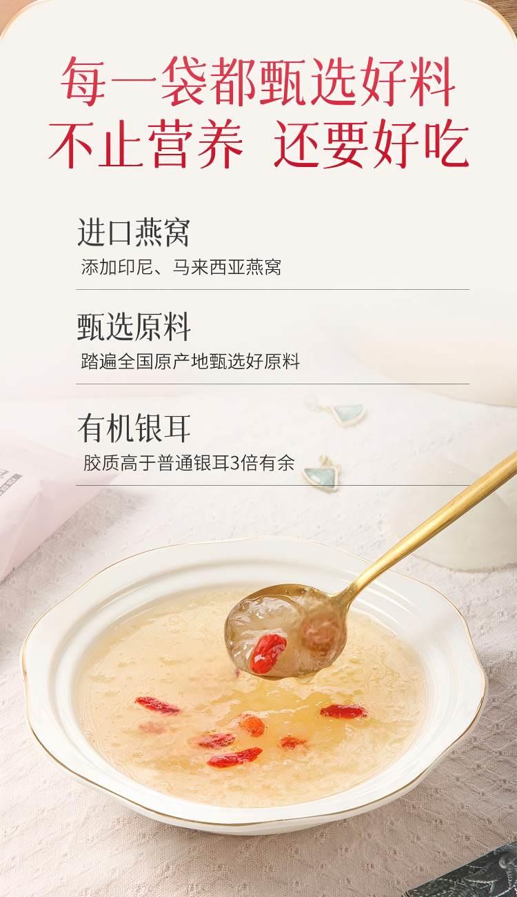 冲泡即食、宛如亲炖、冻干锁鲜新科技,将新鲜锁在方寸之间。 【配料】有机银耳(有机证书号0690P2300124)、海藻糖、枸杞、燕窝 【产地】福建省·宁德市 【生产日期】(见包装喷码处) 【贮藏条件】避免阳光直射,置放于阴凉通风干燥处 【产品标准号】Q/LJSW0005S 【食品生产许可证号】SC10735092202468 【保质期】12个月 【规格】45g(15gx3袋)/盒
