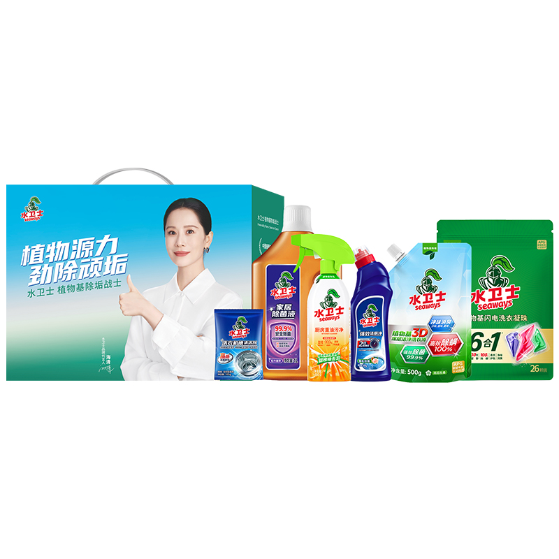 水卫士植物基闪电(三腔闪电)洗衣凝珠8g*26颗 水卫士3D深层洁净洗衣液500g 水卫士强效洁厕净500g 水卫士厨房重油污净500g(带喷头) 水卫士洗衣机槽清洁剂125g 水卫士家清液1L 思珀莱源力礼盒(净含量2833g 小号)