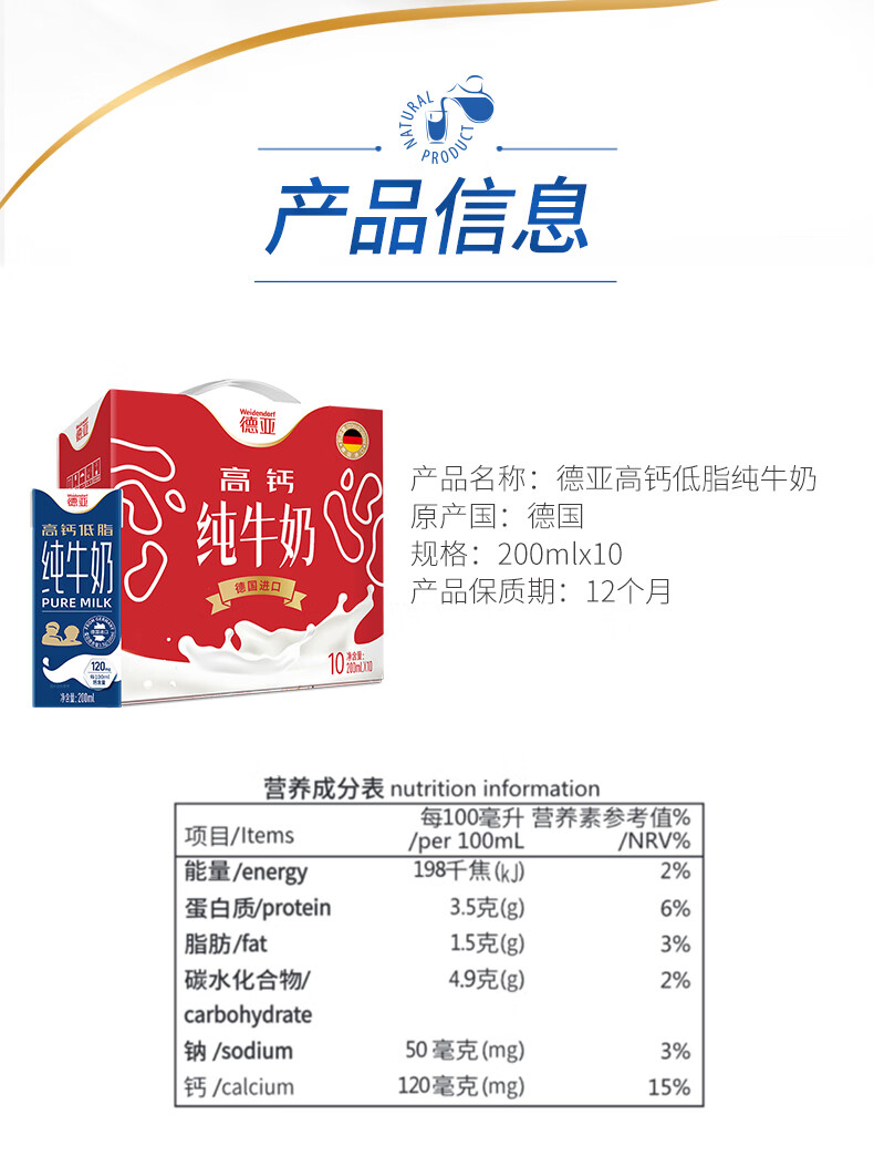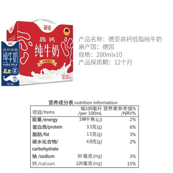 德亚高钙低脂纯牛奶 原产地:德国 保质期:365天 配料:生牛乳