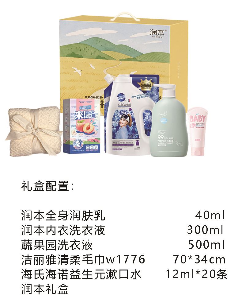 润本全身润肤乳 40ml 润本内衣洗衣液 300ml 蔬果园洗衣液 500ml 洁丽雅清柔毛巾w1776 70*34cm 海氏海诺益生元漱口水 12ml*20条润本礼盒