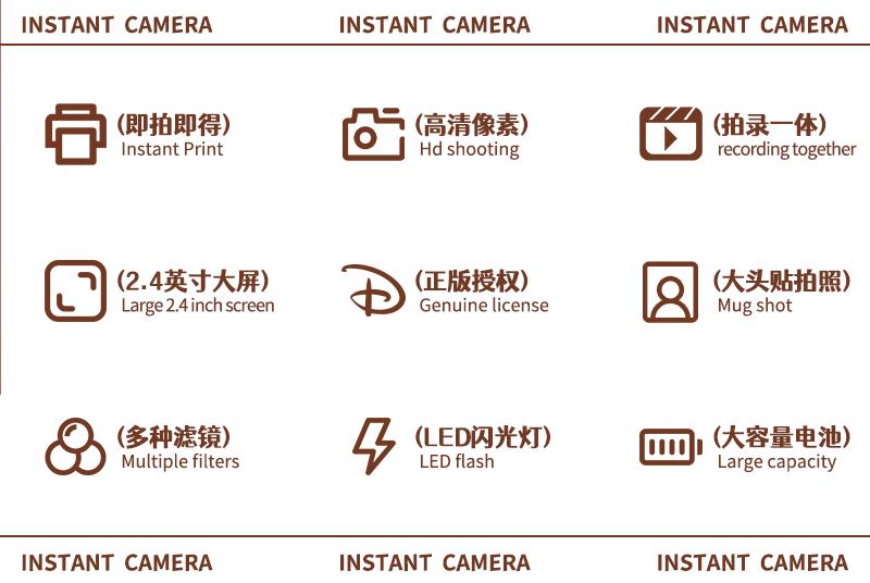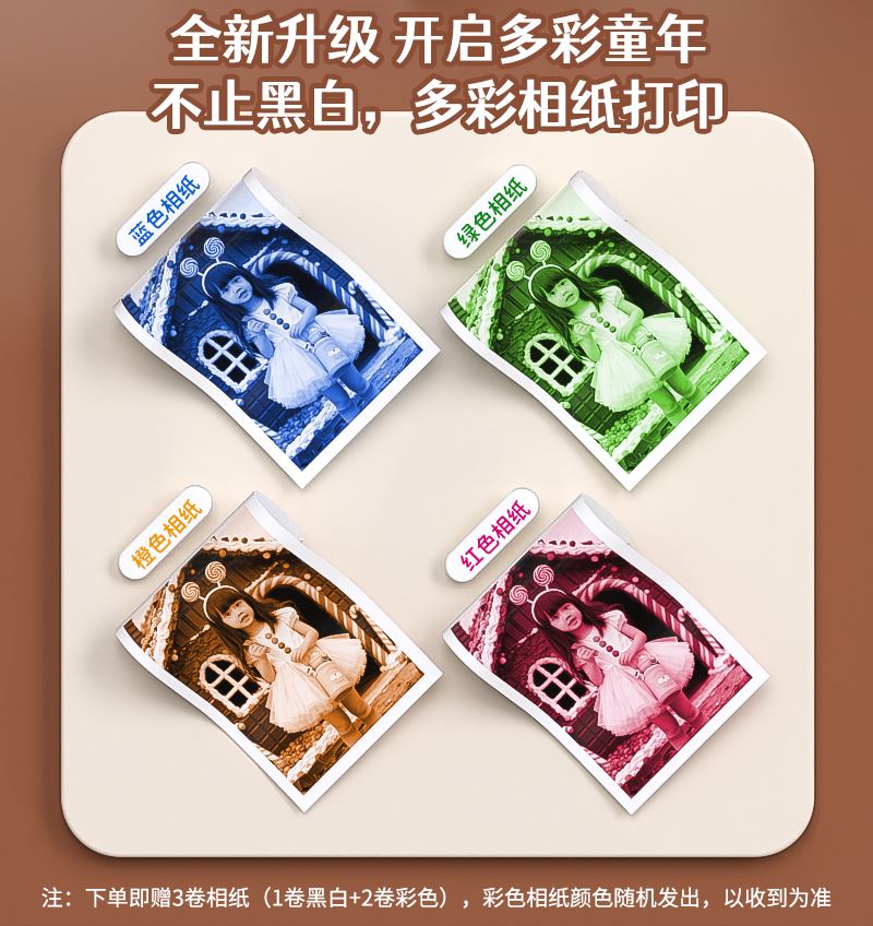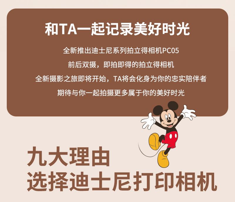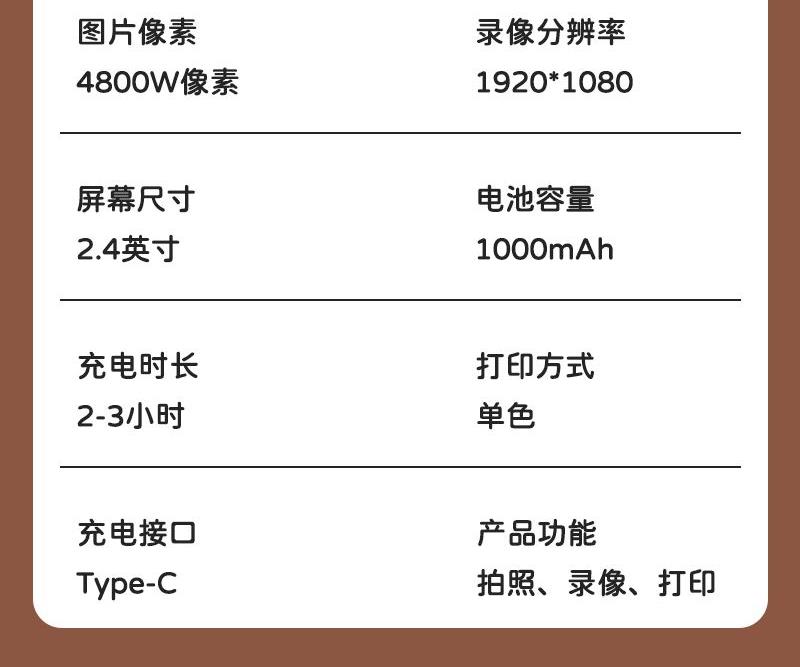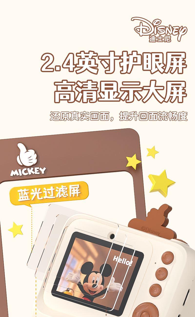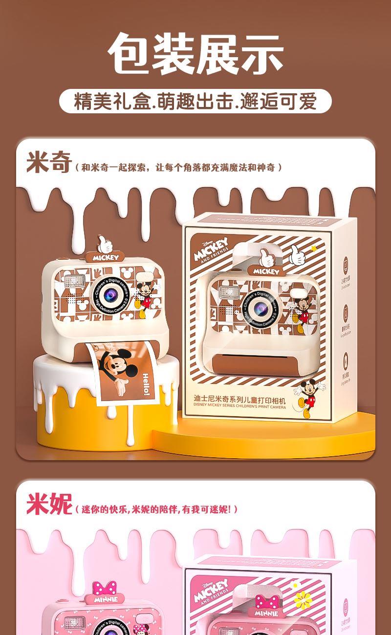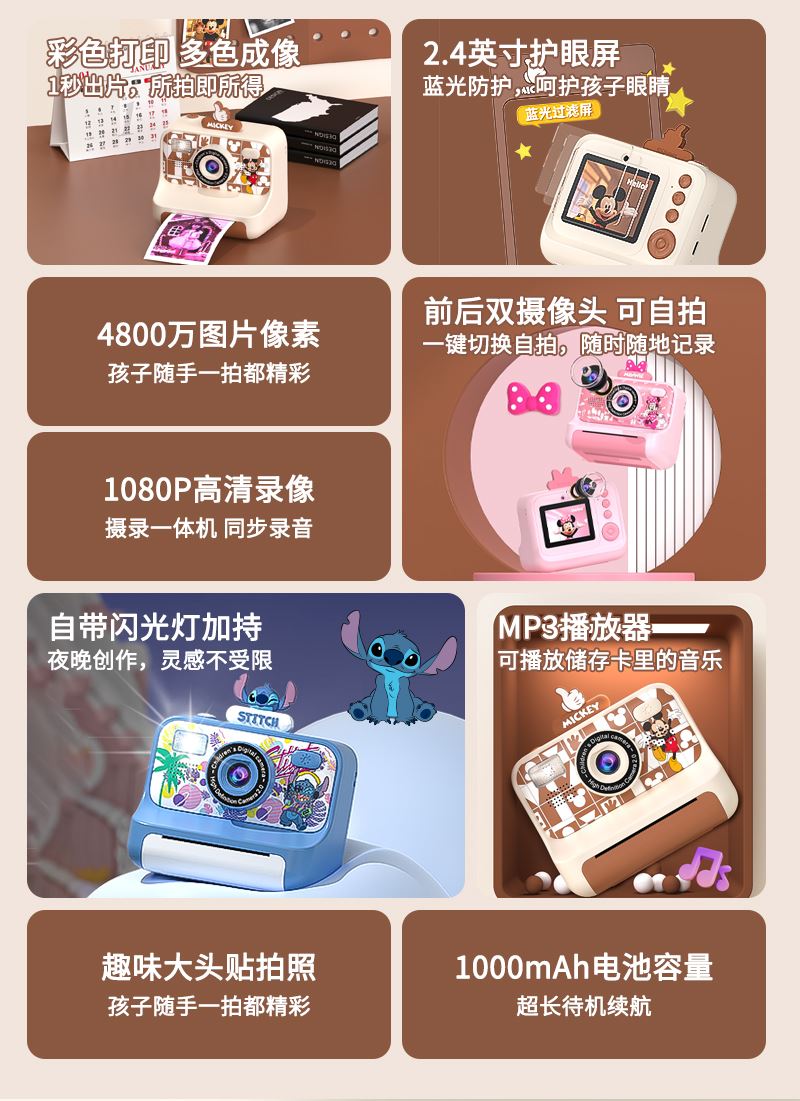 产品型号:PC05拍立得相机 屏幕尺寸:2.4"IPS高清屏 录像分辨率:1920*1080P 产品功能:拍照/录像/游戏/音乐播放 产品材质:ABS+PC ; 电池容量:1200mAh 产品款式:米奇/米妮/草莓熊/史迪仔 充电接口:TYPE-C 充电电压:直流DC-5V/1A 存储方式:TF卡;支持:64GB 拍照时间:约4小时;录像时间:约3小时 打印模式:灰度打印、点阵打印、彩色打印(需配彩色相纸) 自带语言:17国语言自由切换:英、中文(简)、中文(繁)、日、韩、俄、法、德、捷克共和国、葡萄牙、波兰、荷兰、土耳其、西班牙、意大利、泰国、希伯来语