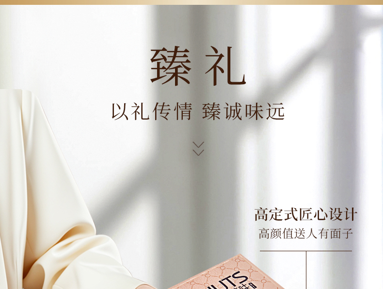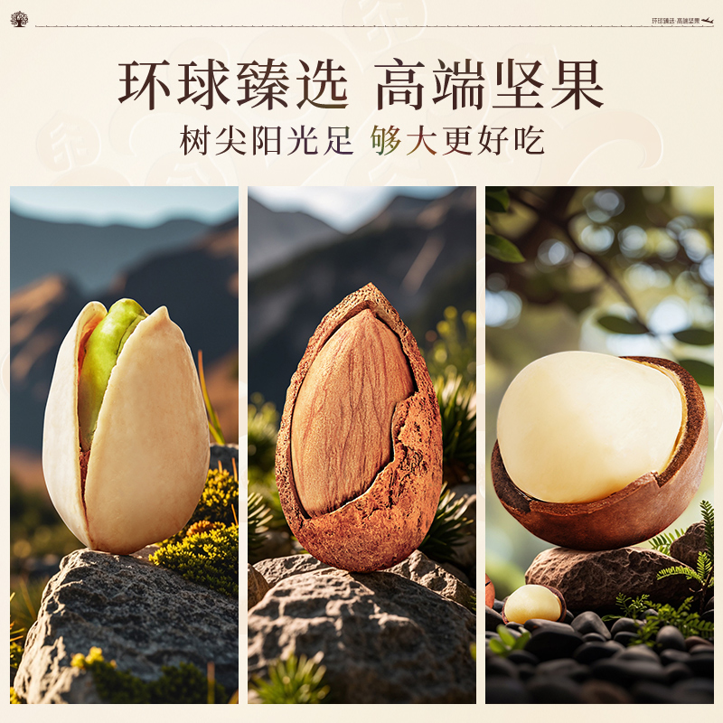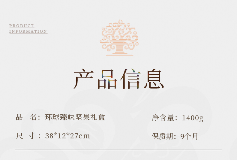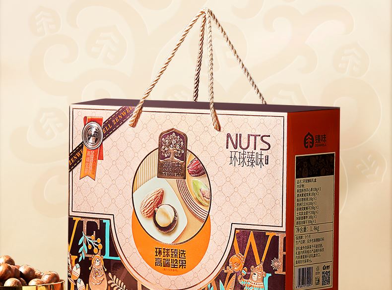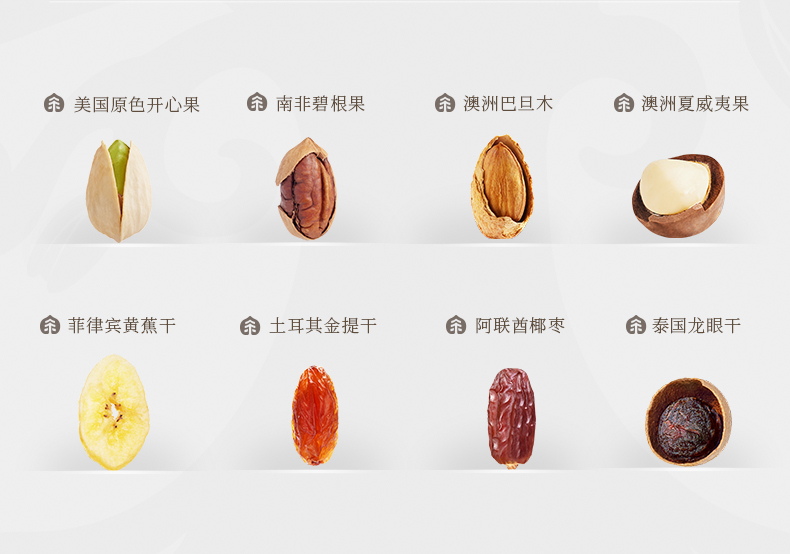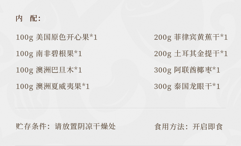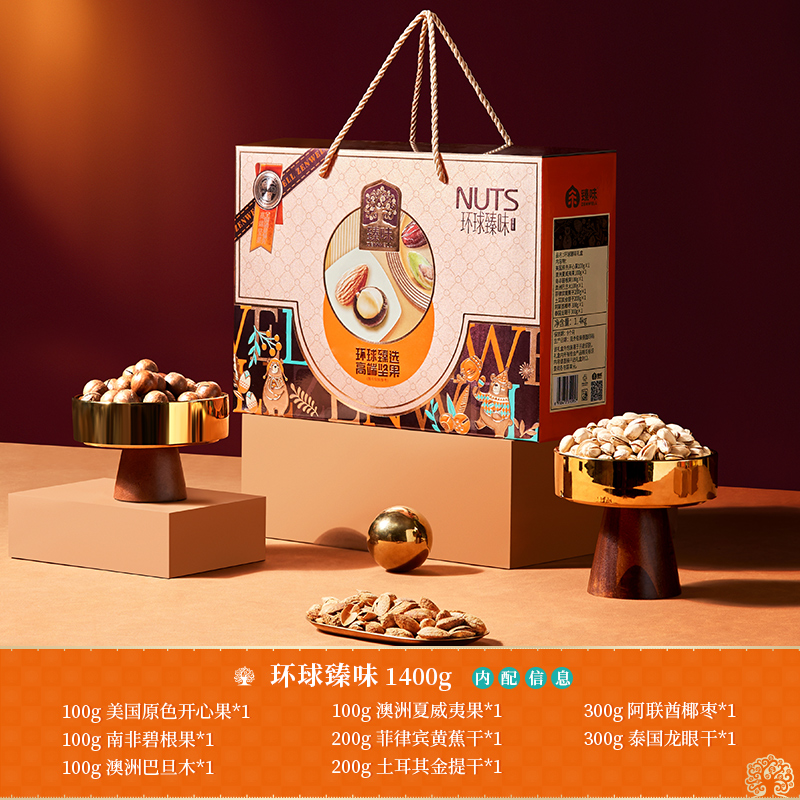 臻味-100g美国原色开心果*1 臻味-100g南非碧根果*1 臻味-100g澳洲巴旦木*1 臻味-100g澳洲夏威夷果*1 臻味-200g菲律宾黄蕉干*1 臻味-200g土耳其金提干*1 臻味-300g阿联酋椰枣*1 臻味-300g泰国龙眼干*1 环球臻味,采用烫金工艺材质,整体气质时尚沉稳;内配4种坚果,4种果干