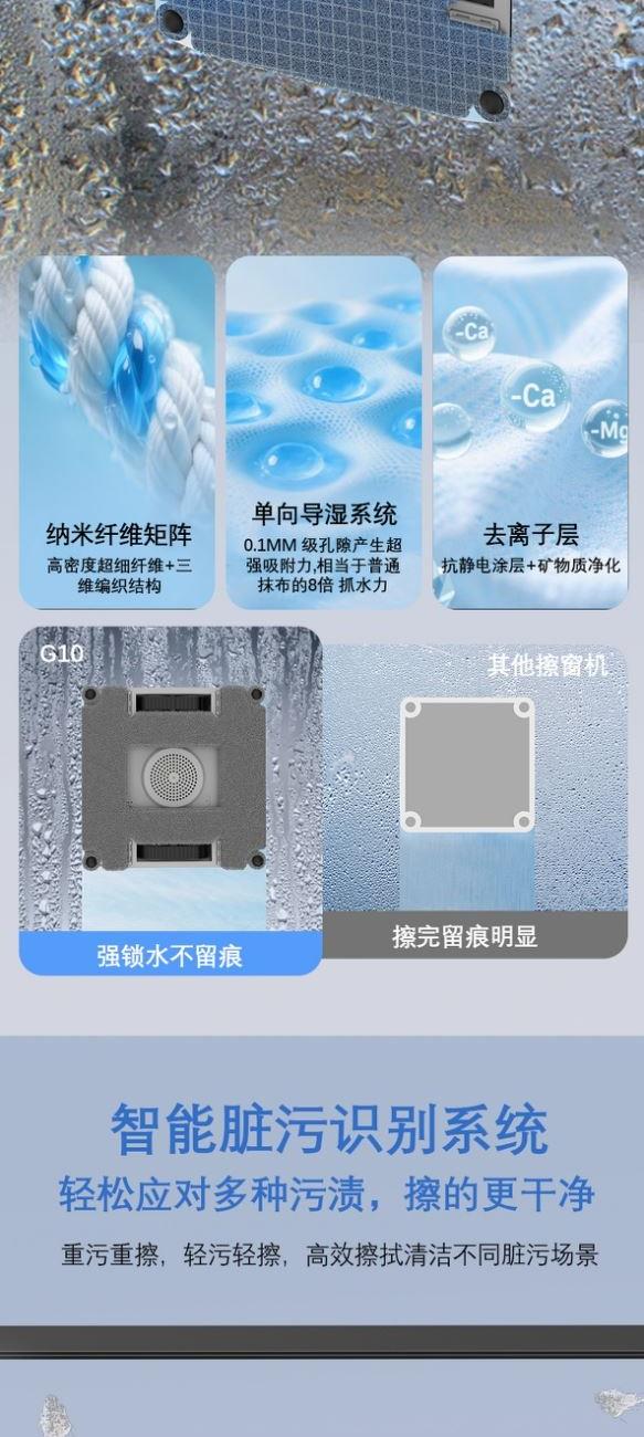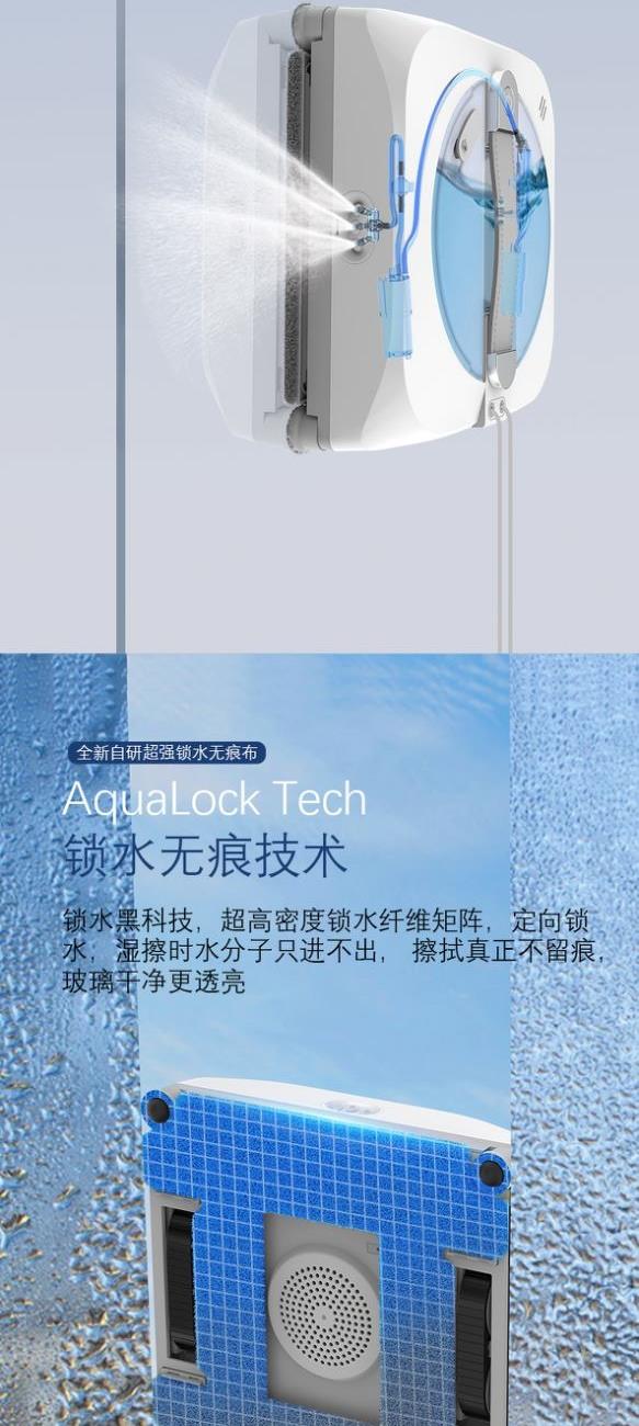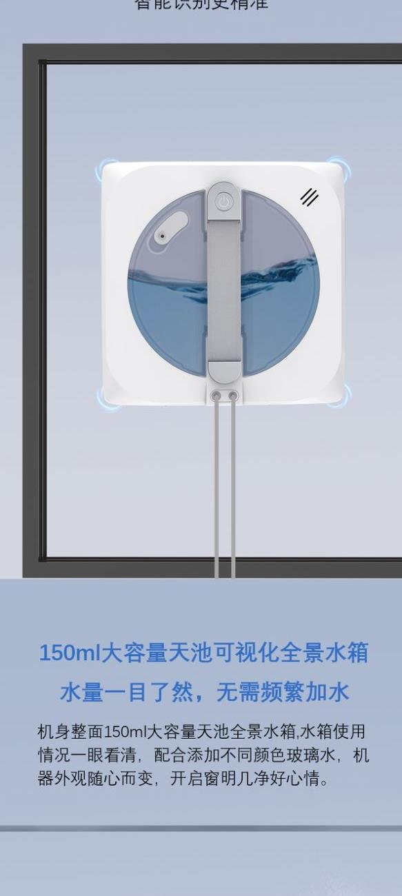 额定功率:72W 额定输入:110V~220V 包装内含:说明书*1、主机*1、遥控器*1、清洁液*1、注水头*1、电池*2、电源线*1、抹布*2 全新升级底盘,机器机身吸力大,吸力可达8000pa由于风机吸力大,能长久恒定气压在3200pa,不止安全还能擦的更干净 独特静谧风道,不俱水雾侵蚀,噪音低至65db一下,擦窗更安静 核心防滑升级轮皮,可直接进行湿擦模式(直接将抹布打湿擦窗) 抹布为超细纤维材质,可双面多次使用,不用等抹布晾干再使用,可直接打湿使用,可满足一次性擦全屋窗户需求 超大150ml可视化全景水箱,水量一目了然,无需频繁加水 双向六喷高压水泵鲸喷式强劲喷水 真喷水 六喷更比八喷强无惧风吹,使水分真正触达清洁表面