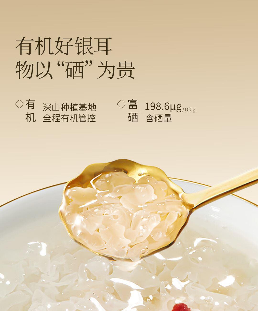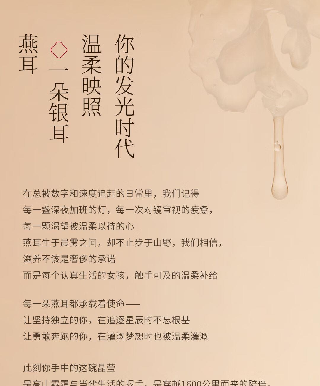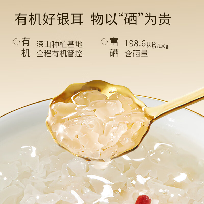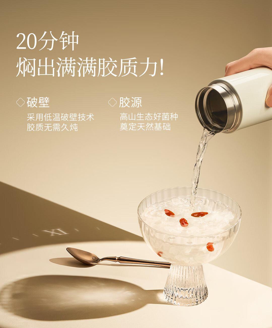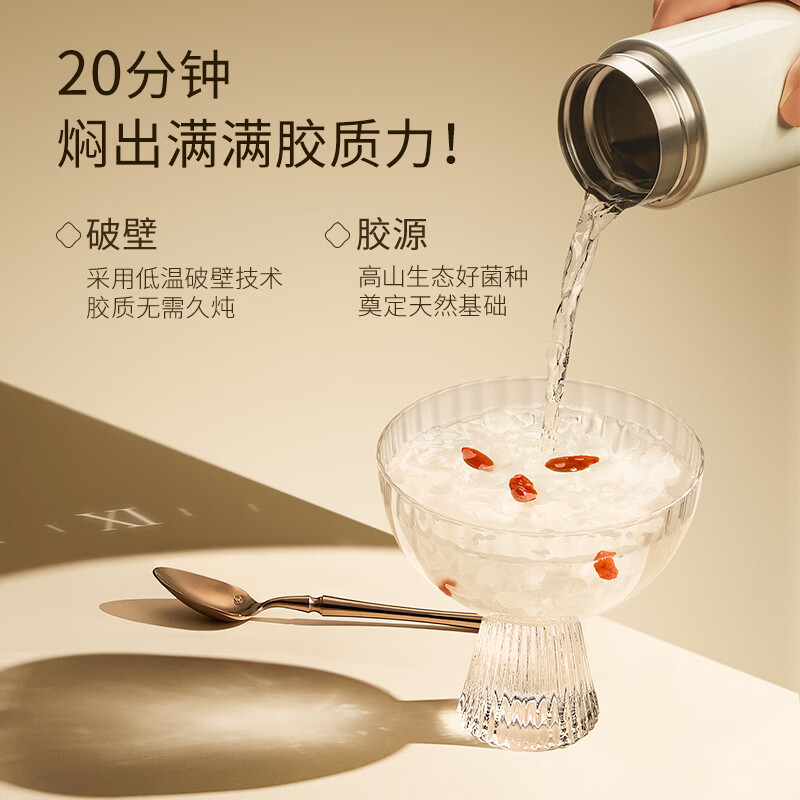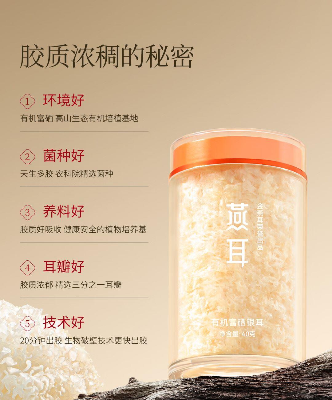 内含:燕耳罐装40g*2、焖烧杯*1、小金勺*1 推荐理由: 优选多种药食同源珍材料做养料包精心培育,吸收食材精华营养价值高,胶养活性分子含量丰富 充分吸收培植基营养,高泡发率,胶质浓稠,口感爽滑。银耳粗多糖42.5%,胶质多多,是普通银耳的3倍;含有27种营养成分,低脂低负担,减脂期也能吃 免洗免泡,开水冲泡40分钟即可食用 全产业链严格把控,从源头把控品质,全环节可追溯