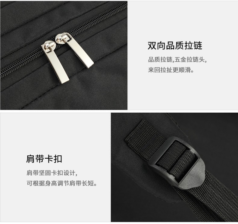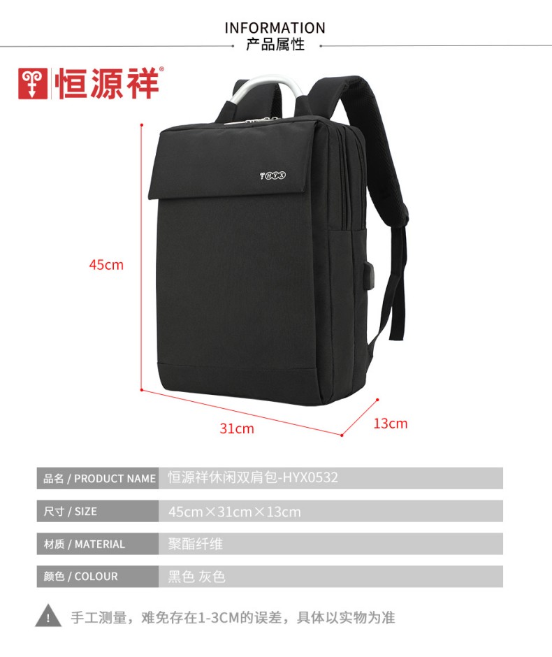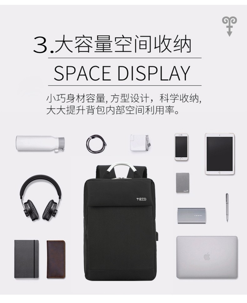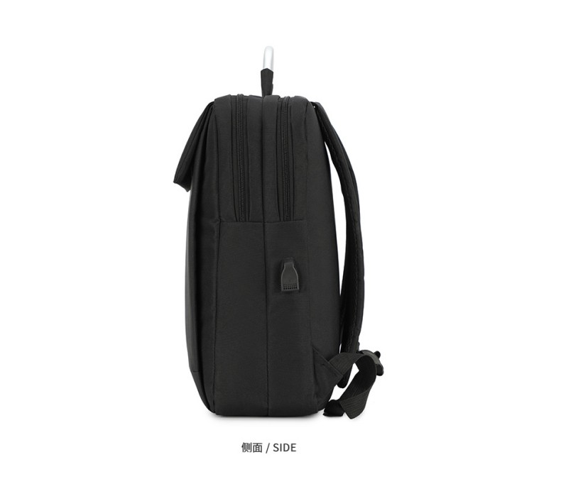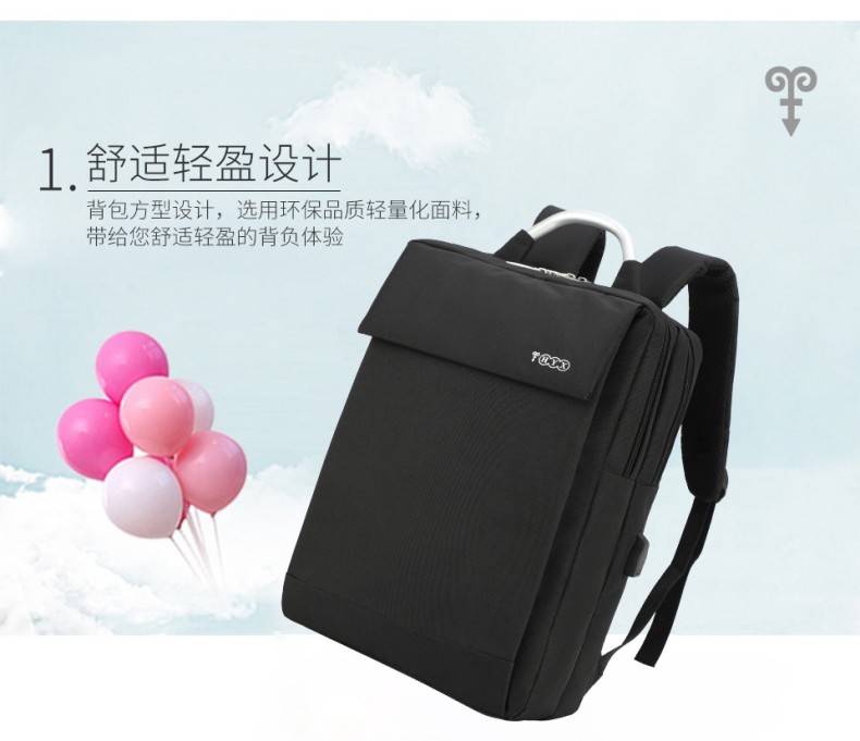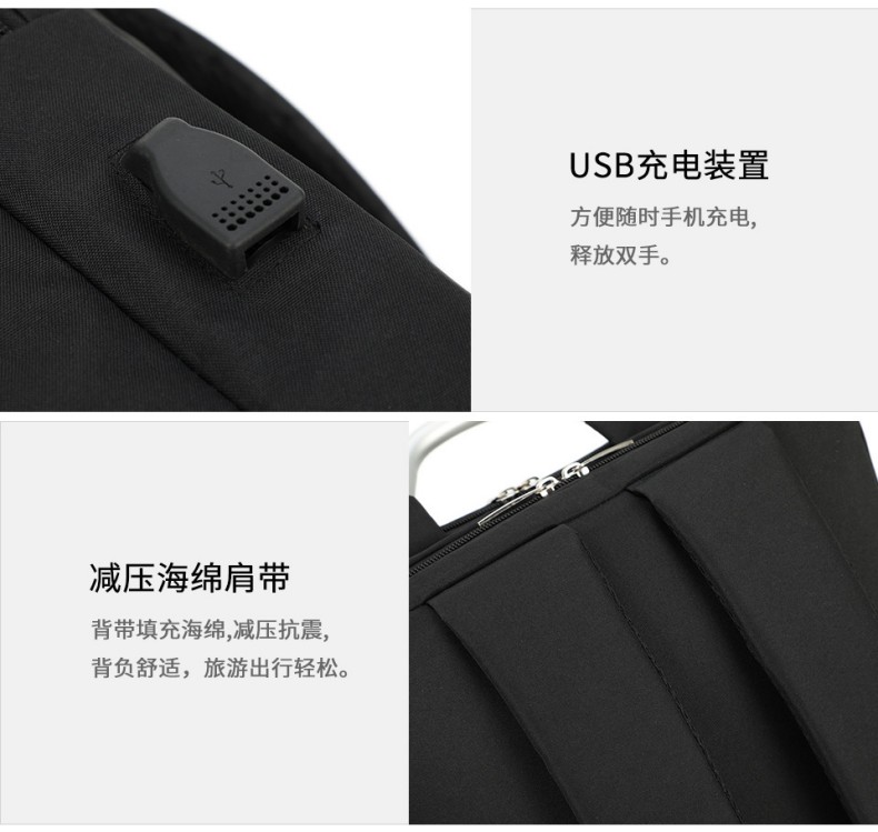 材质:聚酯纤维 颜色:黑色 规格:31*13*45cm 包装方式:PP袋,可选收费彩盒 外箱尺寸:64*44*48cm 受力点:密集针加固(打枣)结实可靠; 外置USB充电接口,即插即充; 严格的质量标准,车缝一寸7针; 笔记本电脑主袋,平板电脑书籍副袋,笔插袋,卡片袋,零钱袋,都市出行,你没有想到的,我们都想到了; 方形立体式设计,简约更有型。